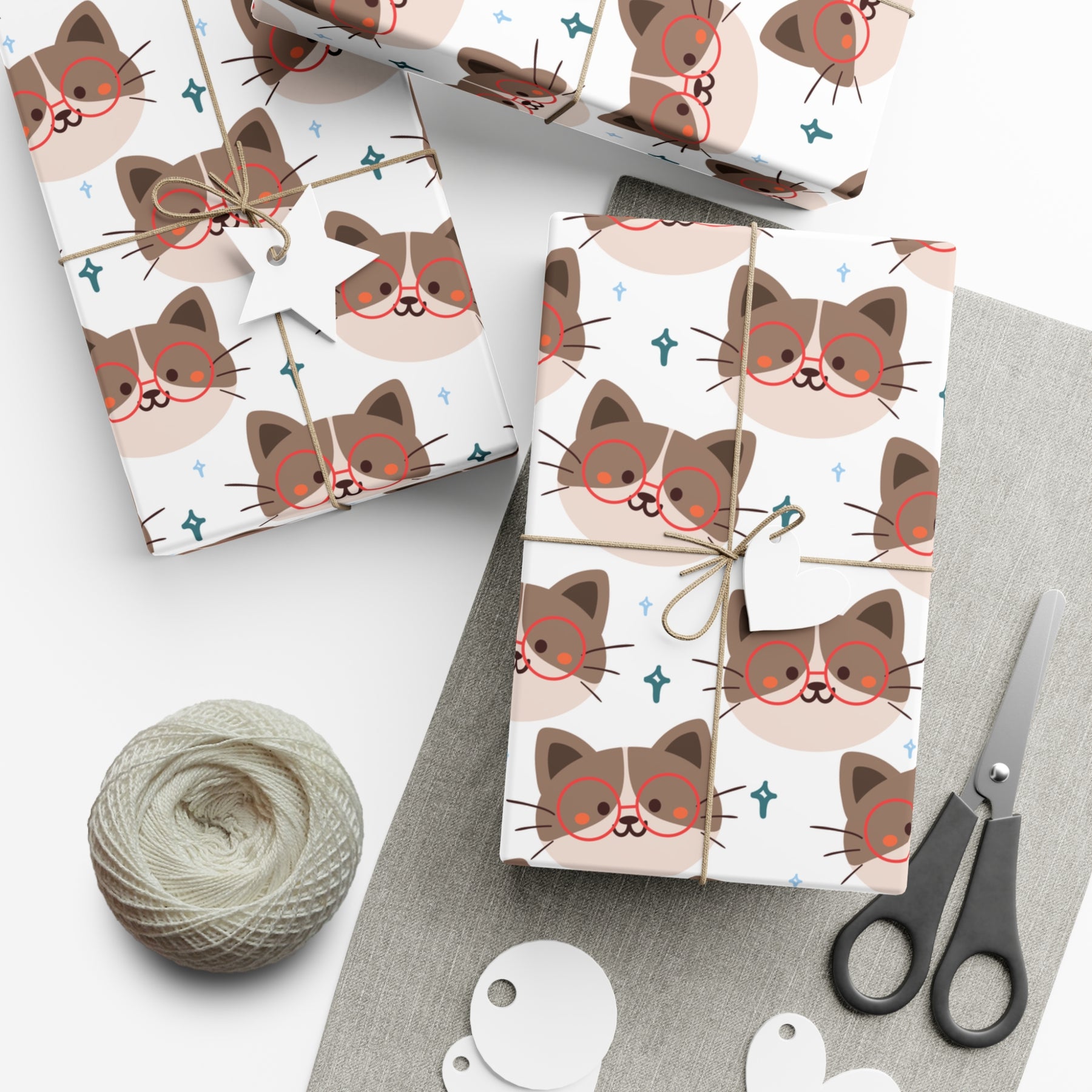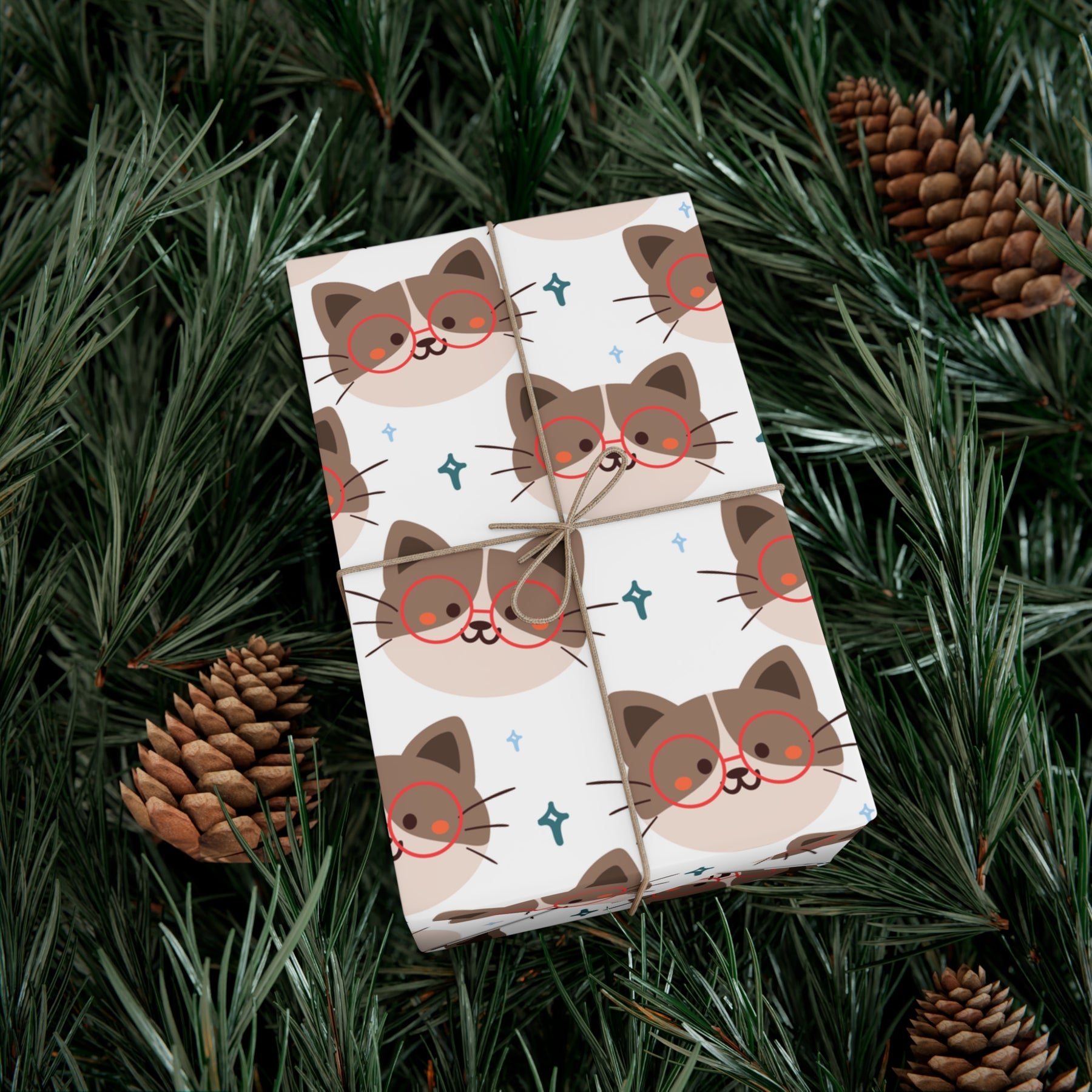 This gift wrap features a crisp white background, perfect for making your gifts stand out. But that's not all, folks! On the front, you'll find a charming cartoon cat with a big smile and adorable red round eyeglasses. This cat is ready to add a touch of cuteness to any present and bring a smile to the face of the lucky recipient.