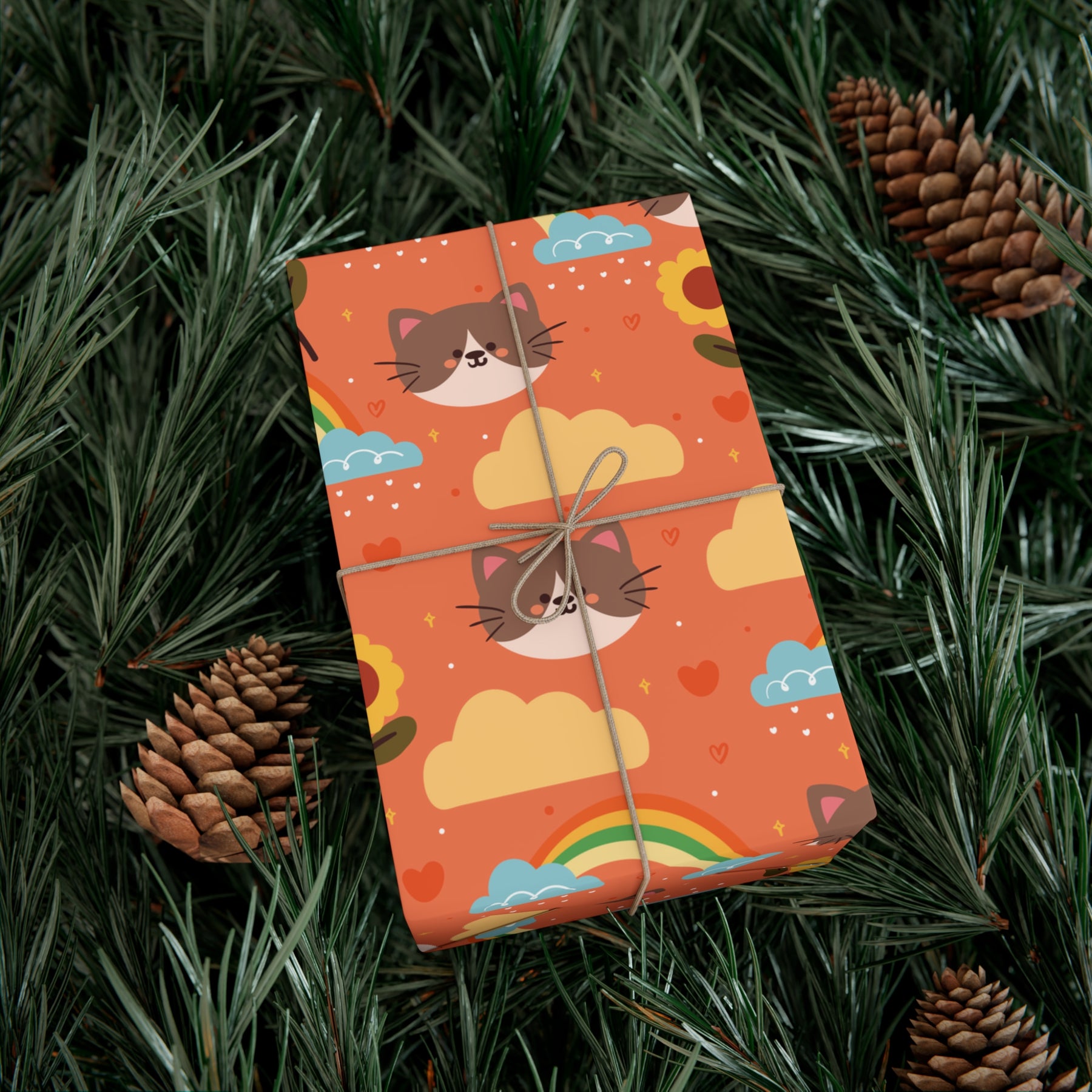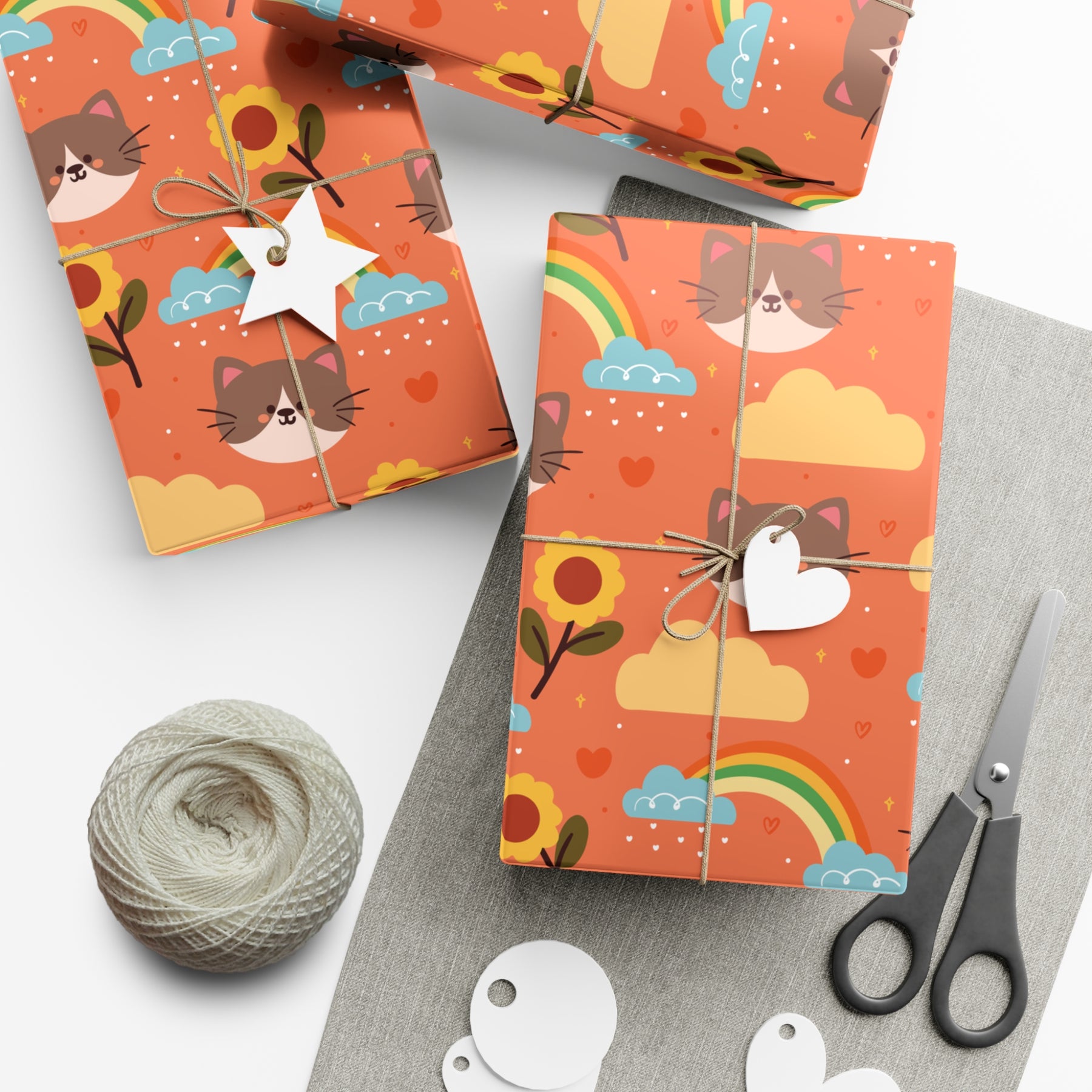 Looking for a way to make your gifts stand out and leave a lasting impression? Look no further, because our Meowgical Rainbow Gift Wrap will do just that! With its vibrant orange background and playful cartoon cat heats, this gift wrap is sure to delight any recipient. But that's not all - our wrap is adorned with rainbows featuring blue rain clouds at the end, adding a touch of whimsy and magic to your presents. And don't forget the cheerful sunflowers and fluffy yellow clouds that complete the design, making it perfect for any occasion!