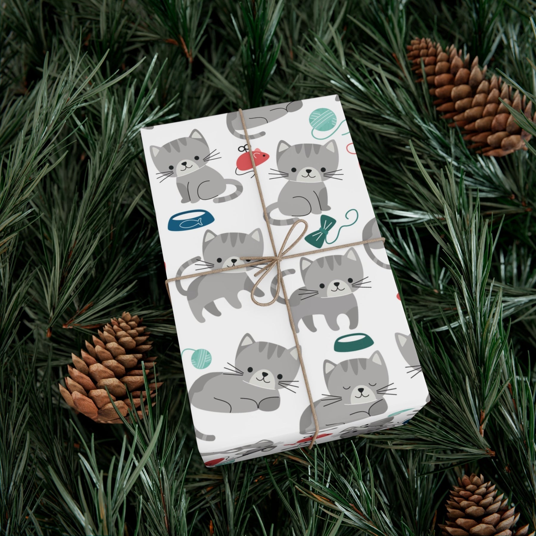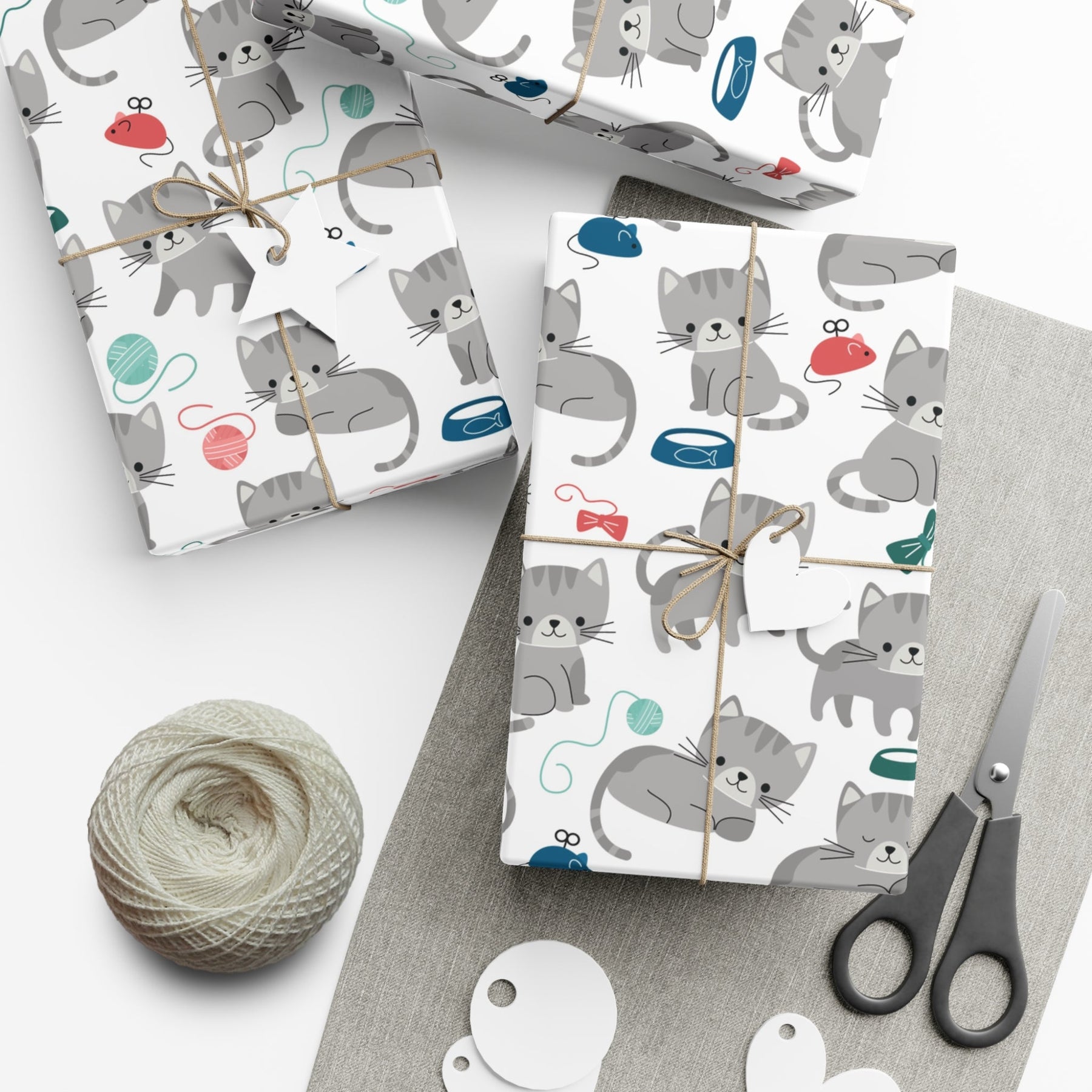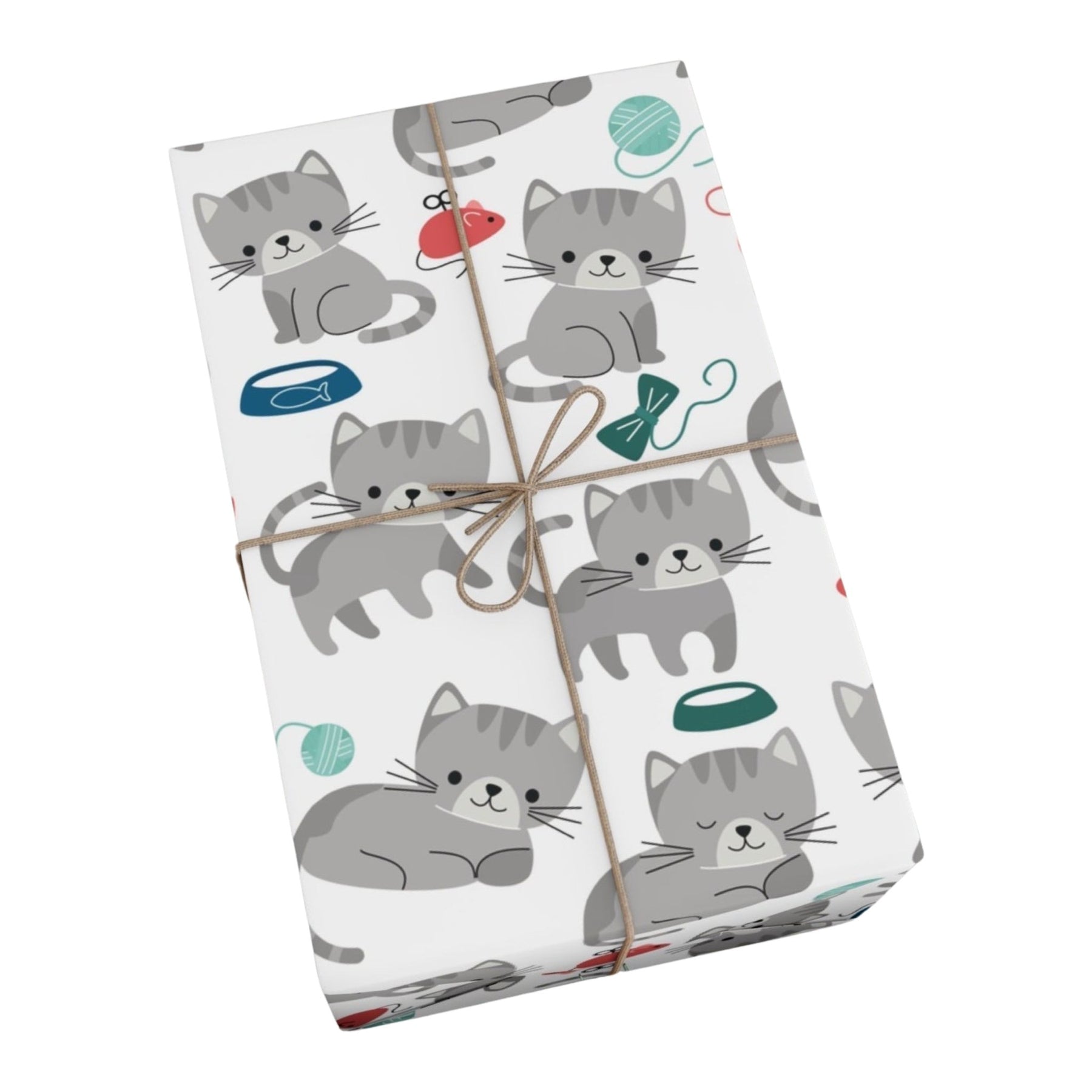 With its whimsical design, this delightful gift wrap is sure to bring a smile on any cat lover's face. The background is crisp and white, while a cheerful gray cartoon cat is surrounded by a food bowl, toy mouse, ball of yarn, and other cat toys – making it perfect for any occasion when gifting something to a kitty-loving friend!