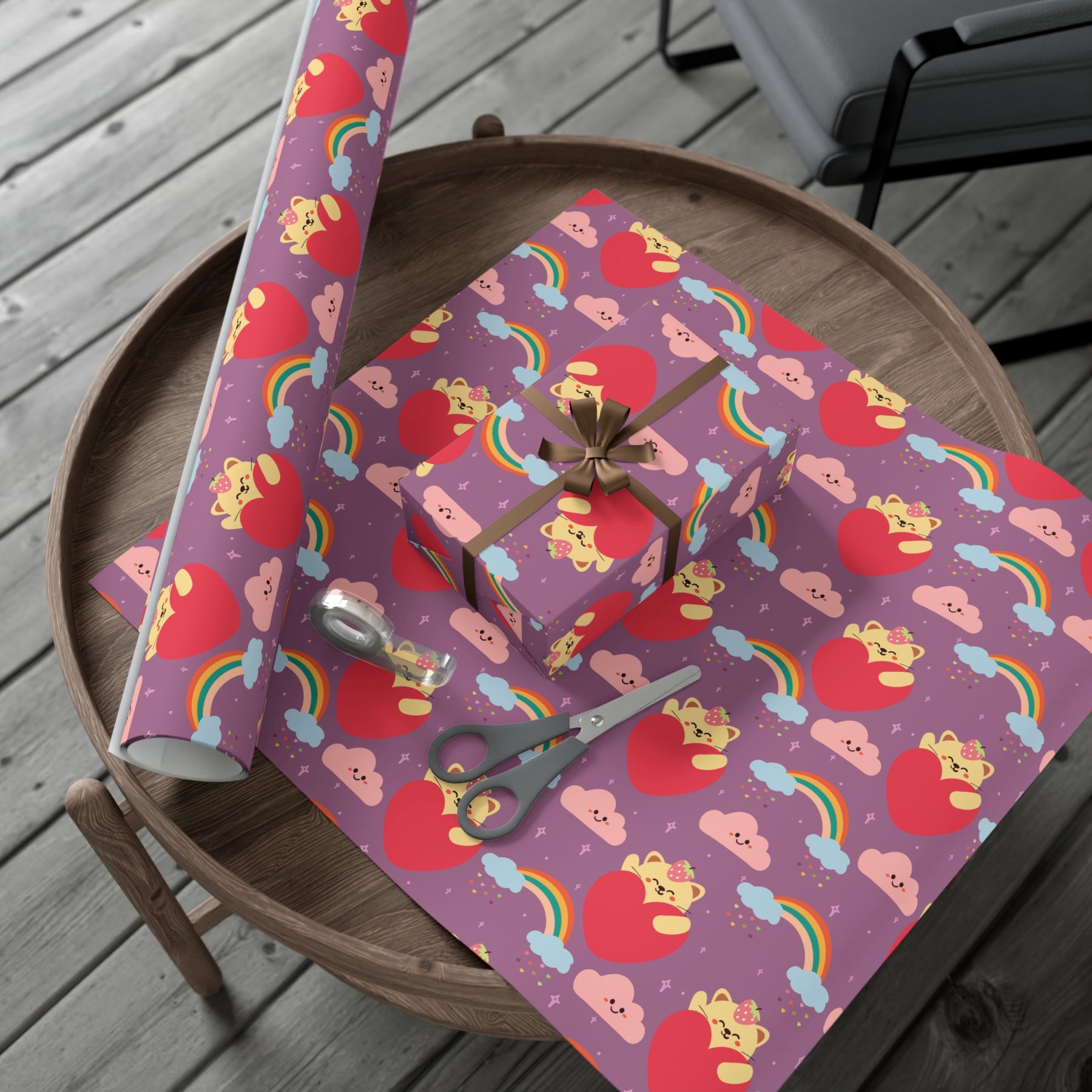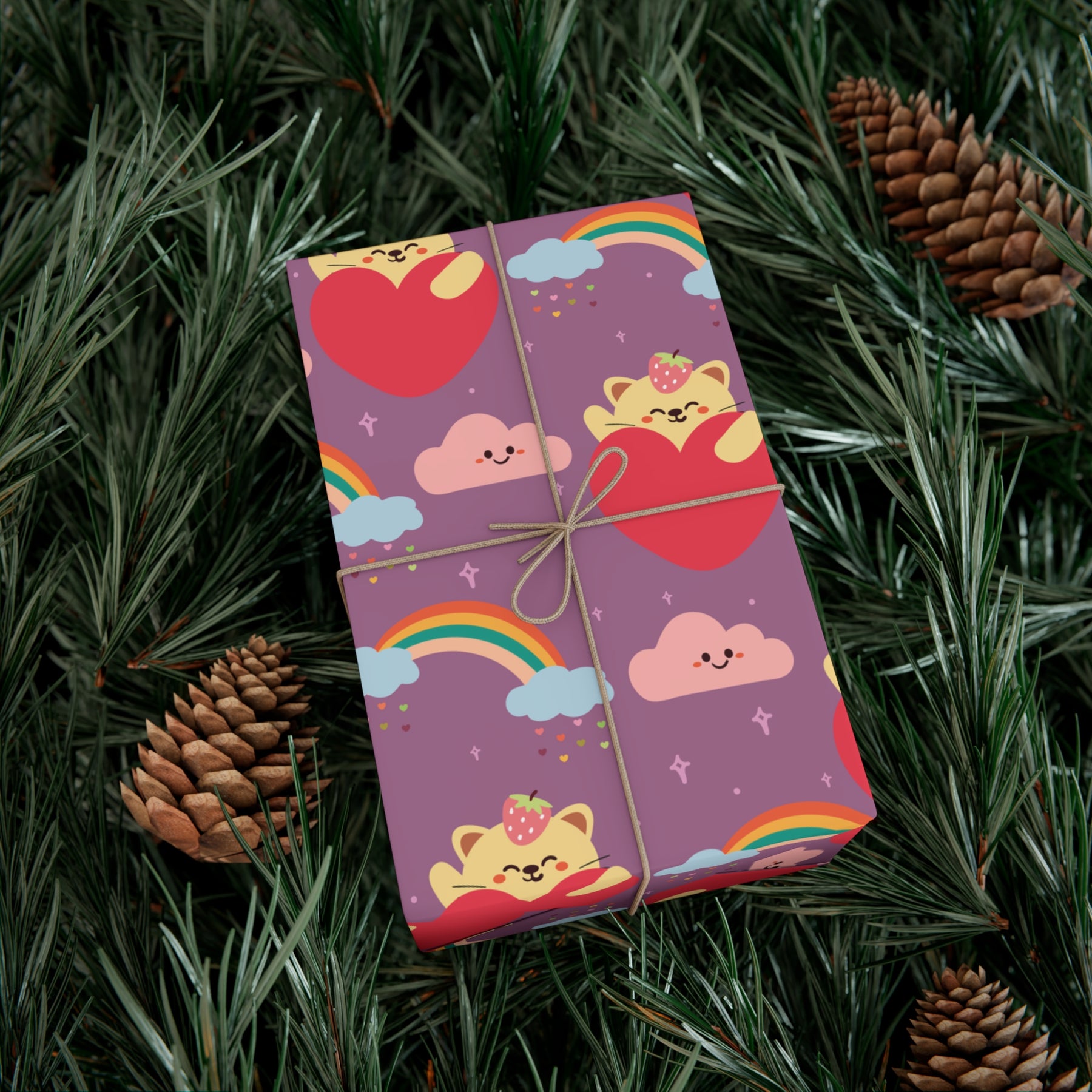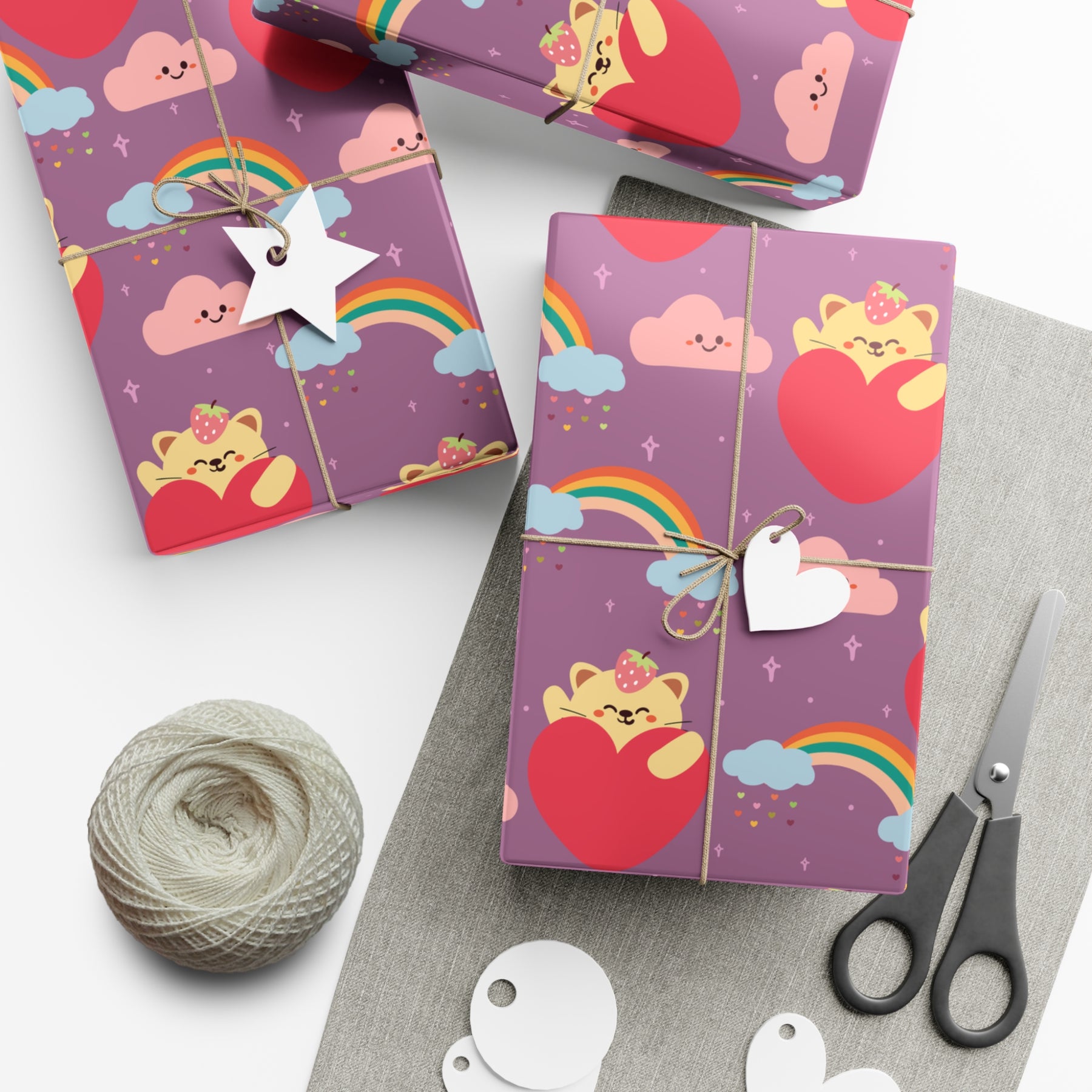 But what truly sets this gift wrap apart are the adorable yellow cartoon cats peeking out from behind large red hearts, all set against a backdrop of fluffy pink clouds. These playful felines are sure to delight both children and adults alike, making this gift wrap perfect for any occasion.