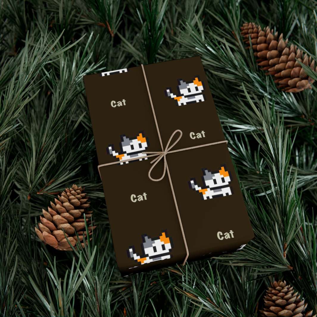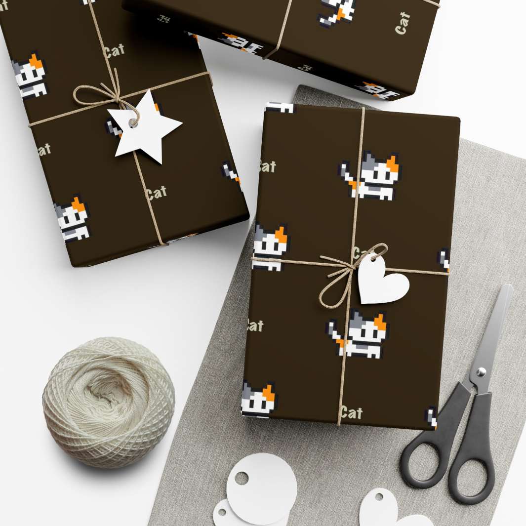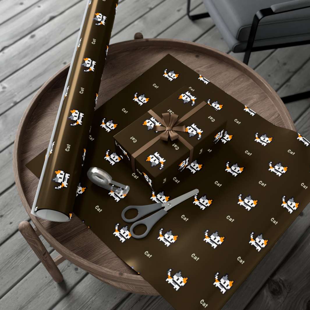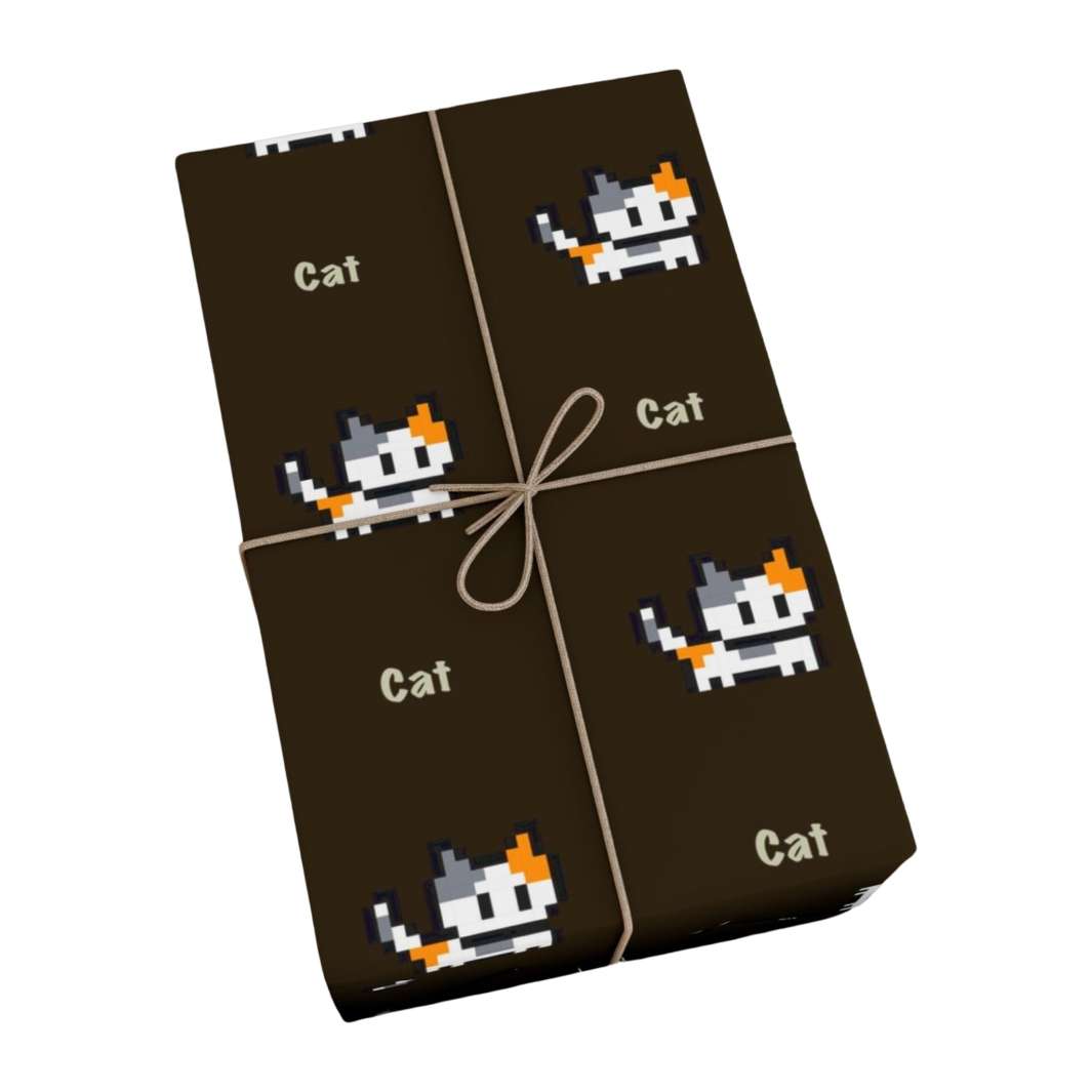 Welcome to retro-gaming heaven with Video Game Cat Gift Wrap! Our gift wrap has a brown background featuring a pixelated calico cat in 1980's video game style – the ultimate throwback.
