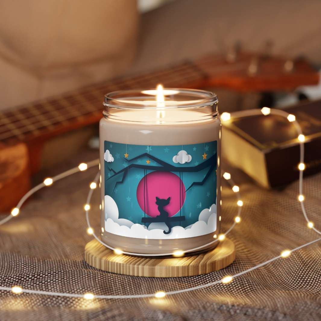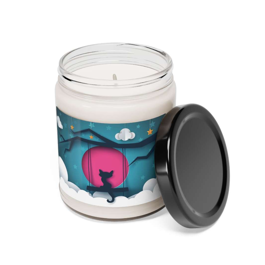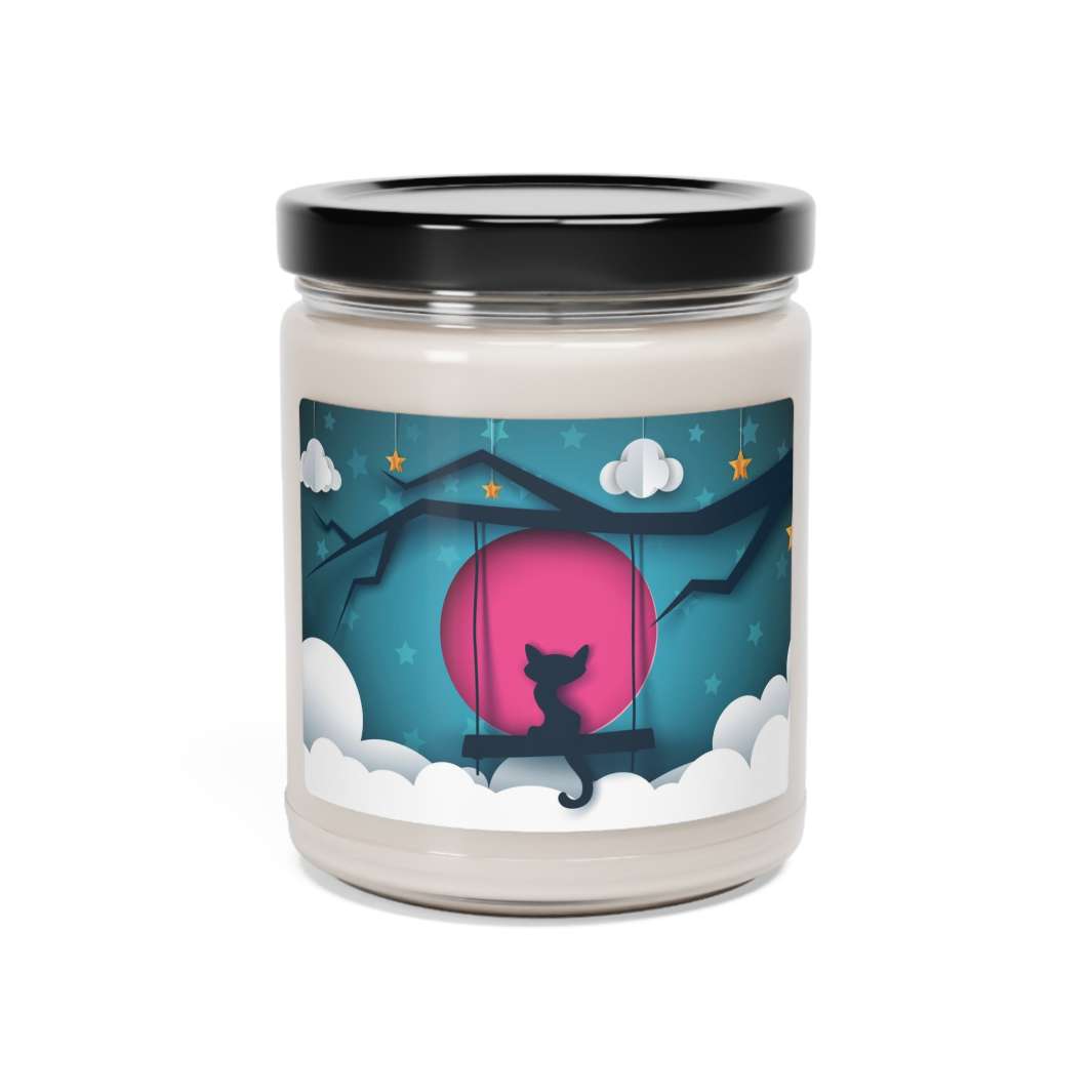 Indulge your senses and set the mood with our enchanting Stargazer Kitty Scented Soy Candle. A stunning masterpiece that combines art, nature, and the irresistible allure of our feline friends. With its teal background, large bright pink moon, and delicate white clouds, our candle captures the whimsical beauty of a serene night sky. And nestled within this celestial scene is a captivating silhouette of a cat sitting on a swing, gazing longingly at the moon.