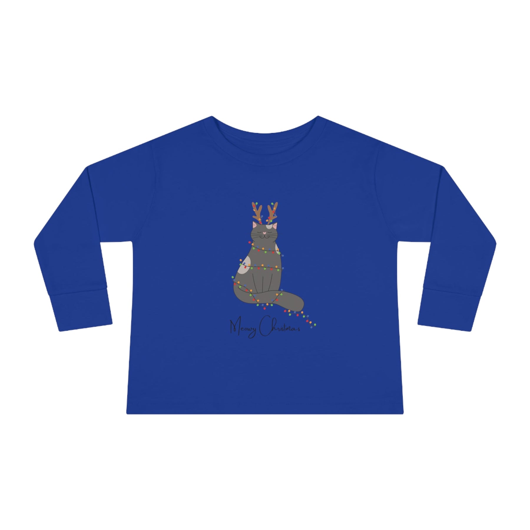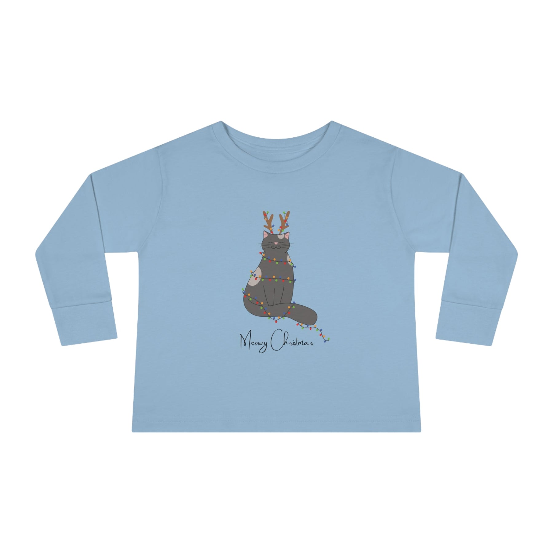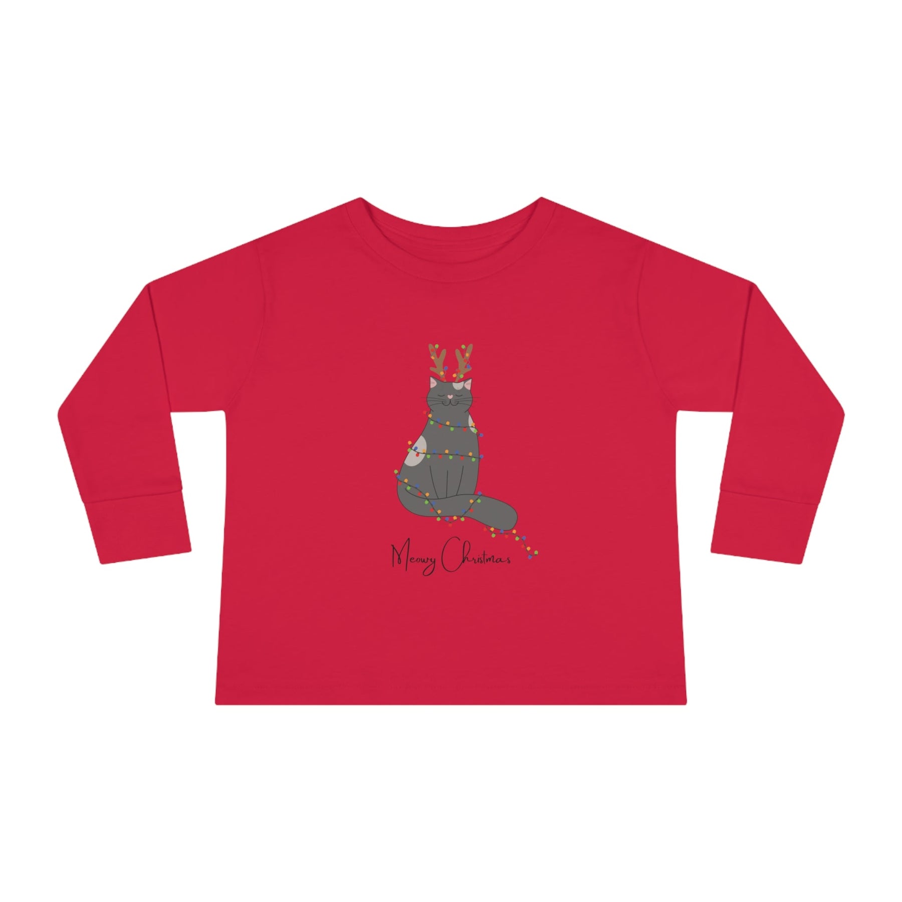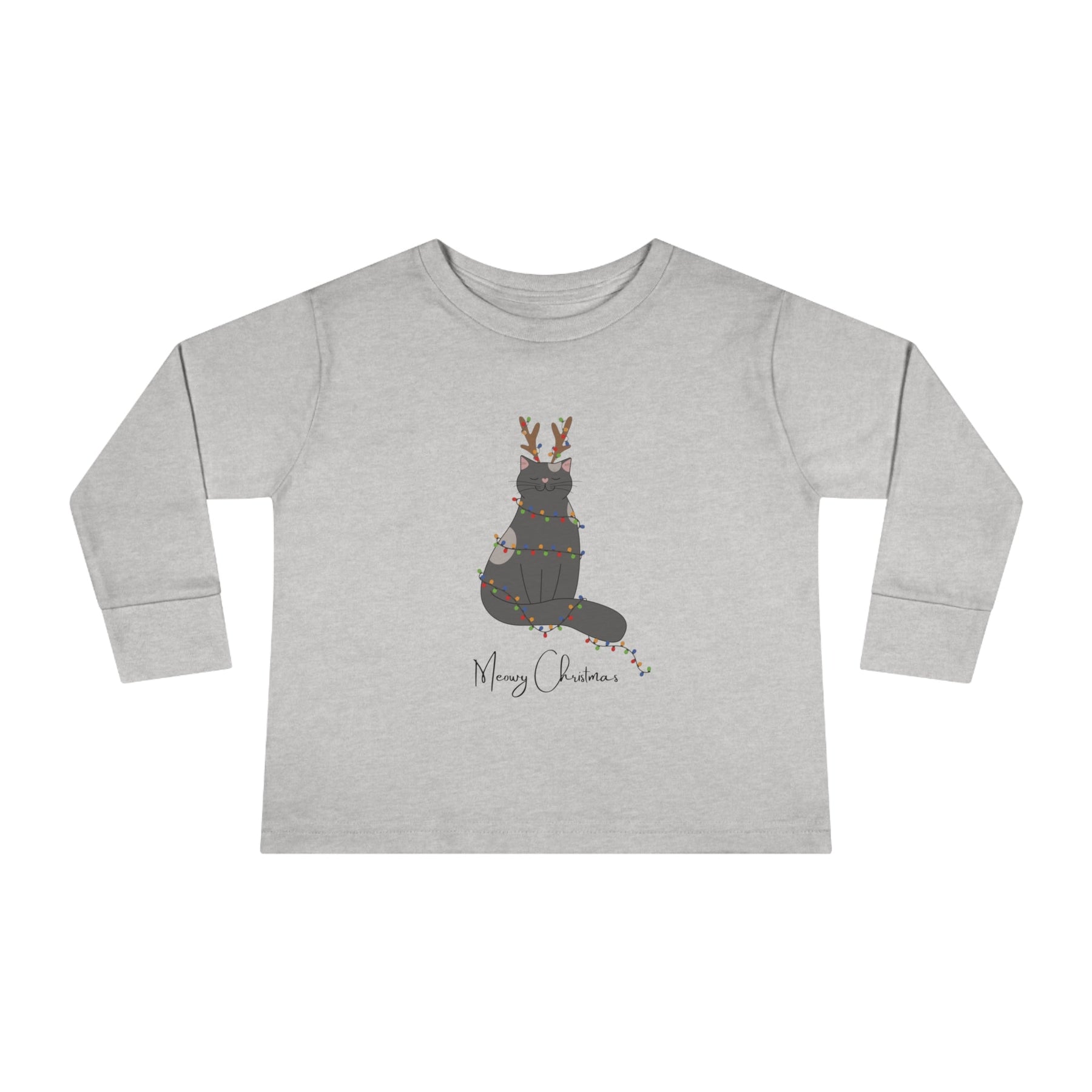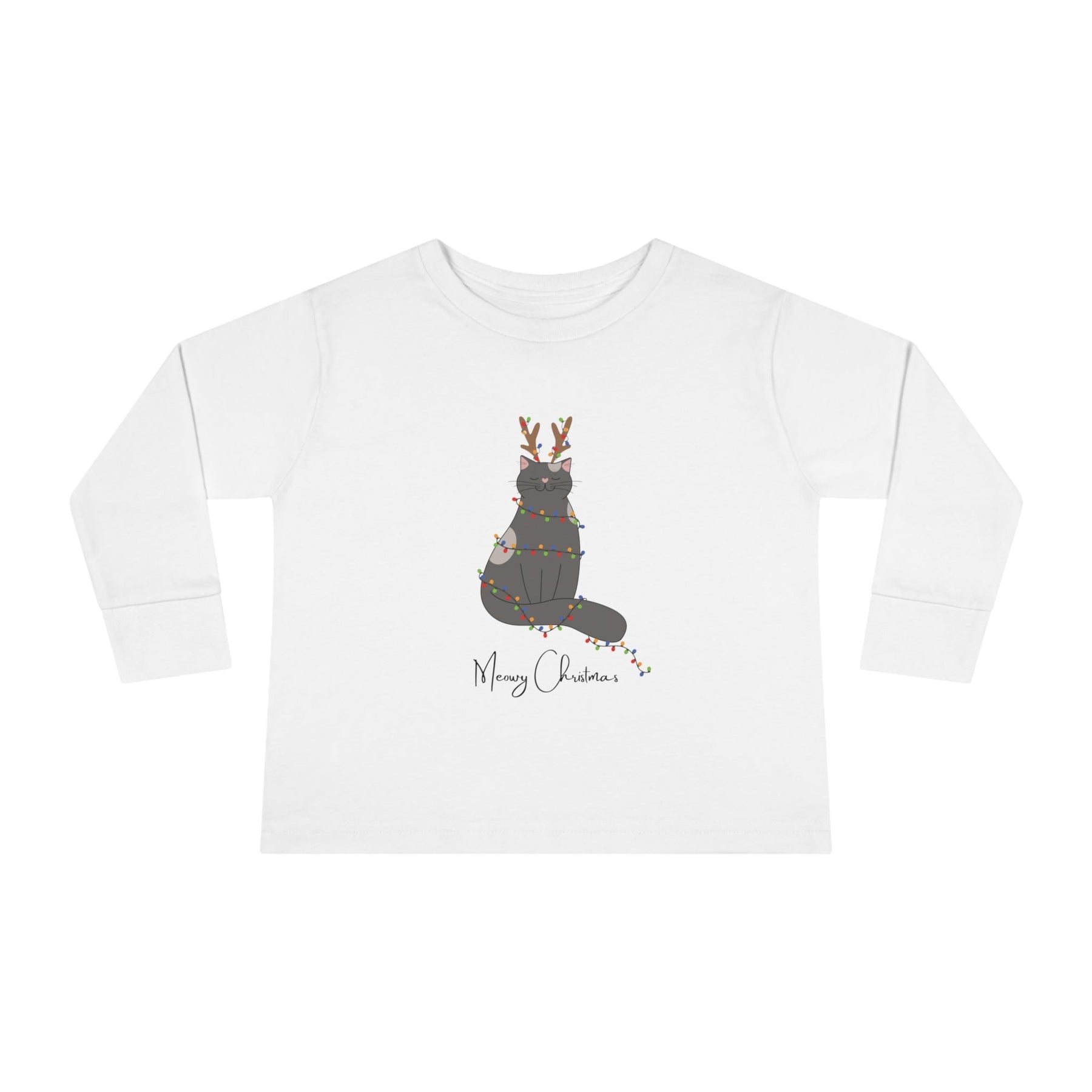 The Bright Christmas Cat Toddler Long Sleeve Tee is the purrfect gift for your little one this holiday season! Featuring a delightful gray cartoon cat with reindeer antlers, wrapped in twinkling christmas lights, and with the cheerful phrase "Meowy Christmas" at the bottom - this tee will have your toddler radiating holiday cheer!