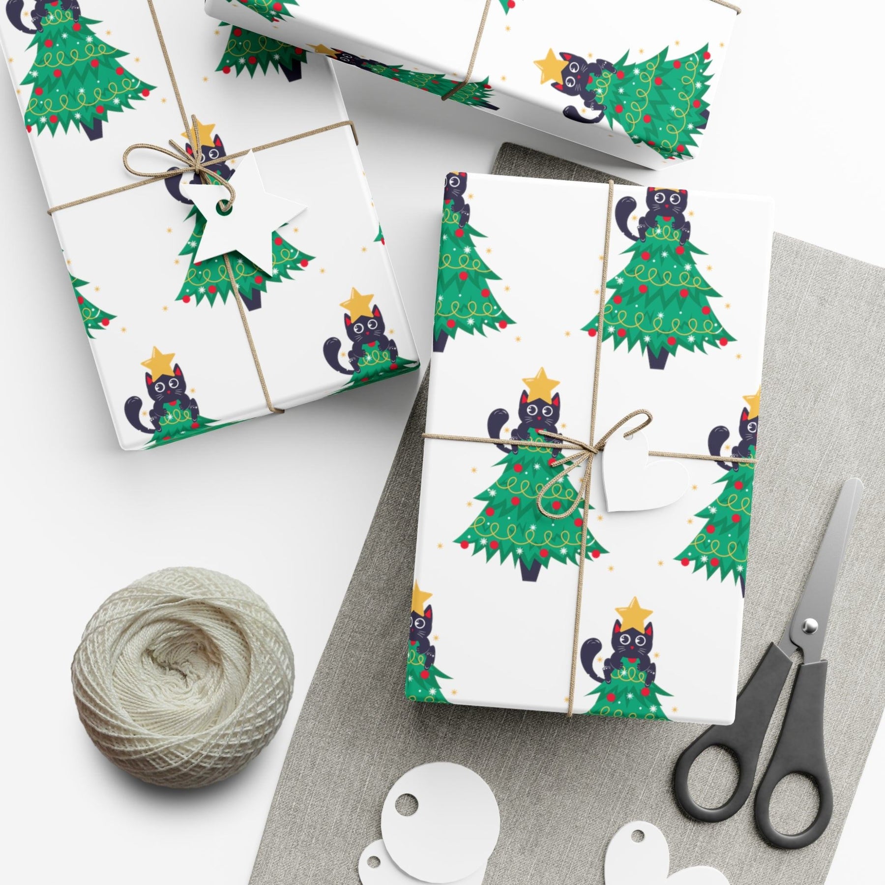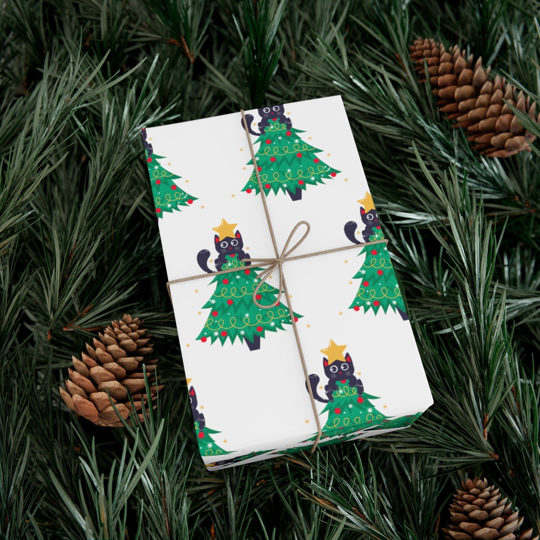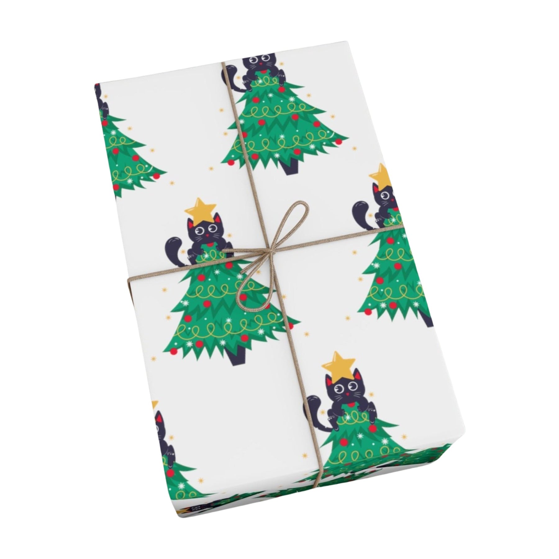 Welcome the holiday season with a purr-fect addition to your Christmas decorations! Our Cat Christmas Tree Gift Wrap is cheerful and adorable - sure to please everyone in the family! With a white background and black cartoon cat nestled in a green Christmas tree, this design is truly charming. To top it off, the cat features an eye-catching gold star on its head, making this wrap extra special.