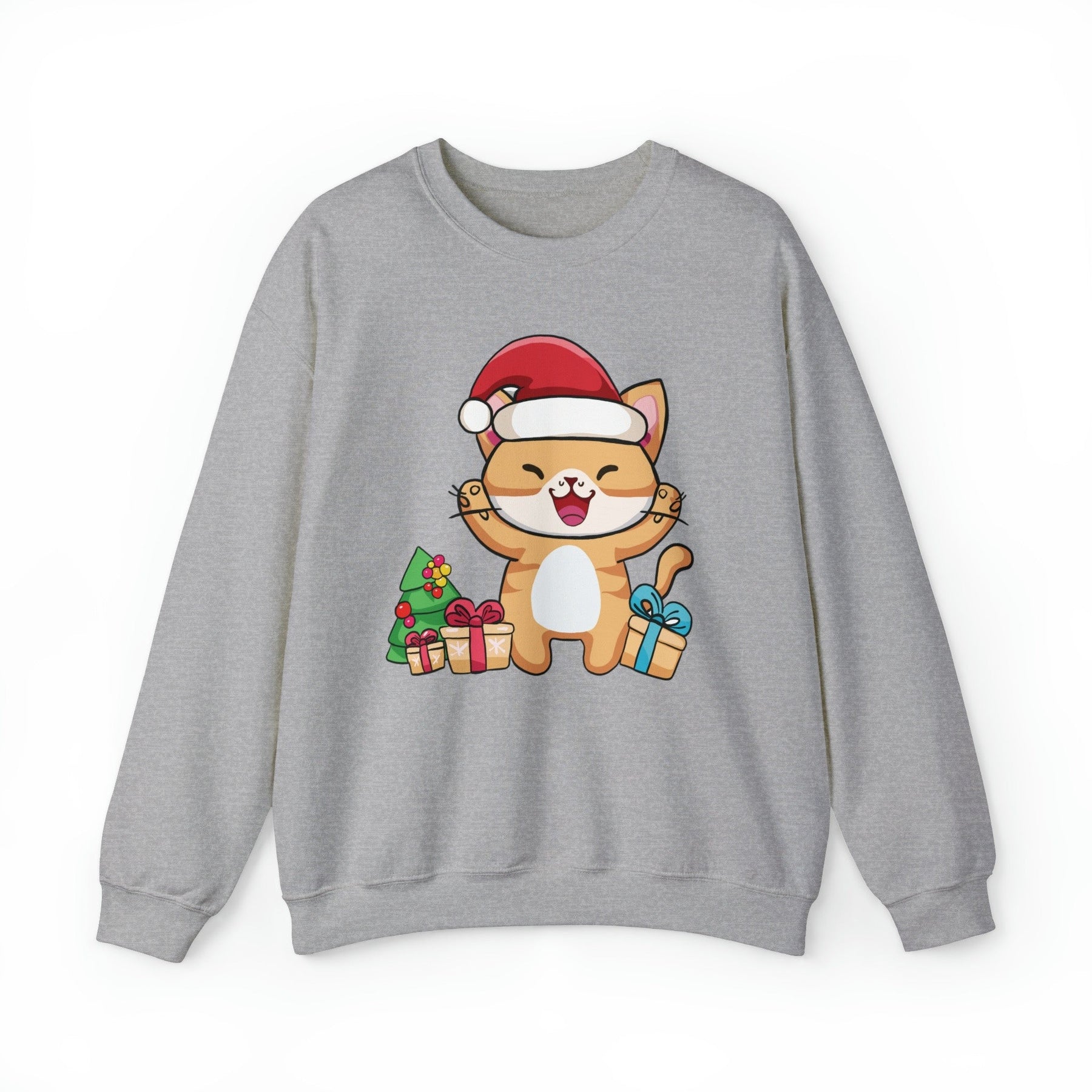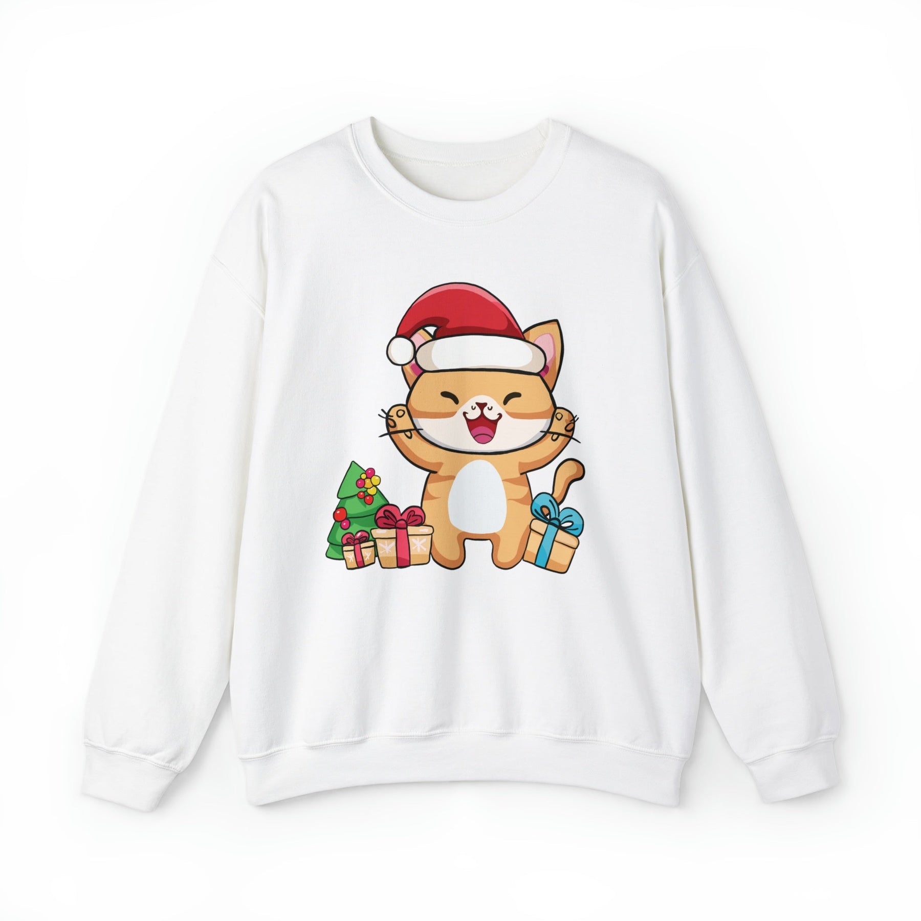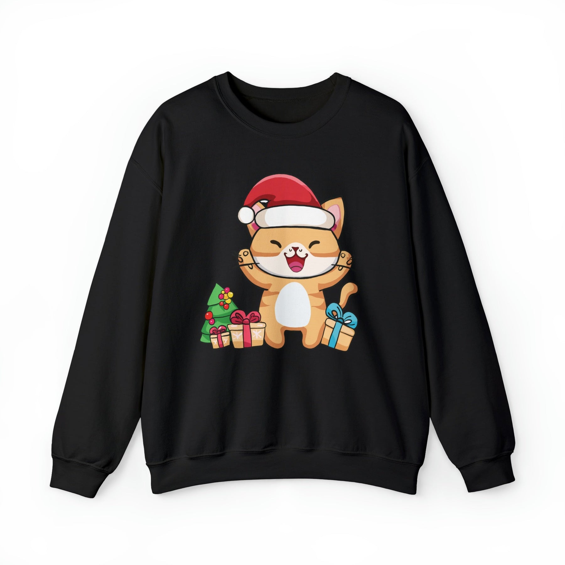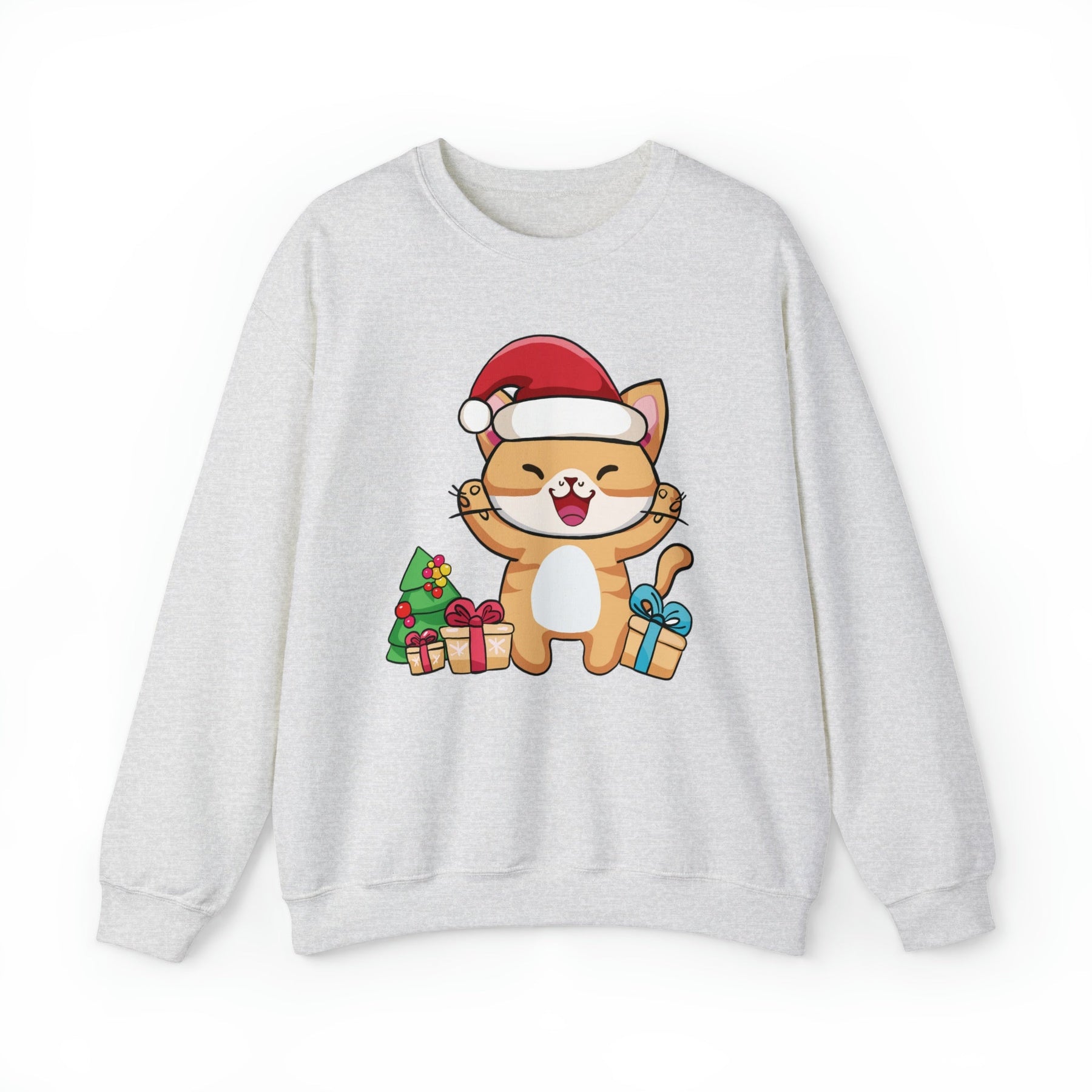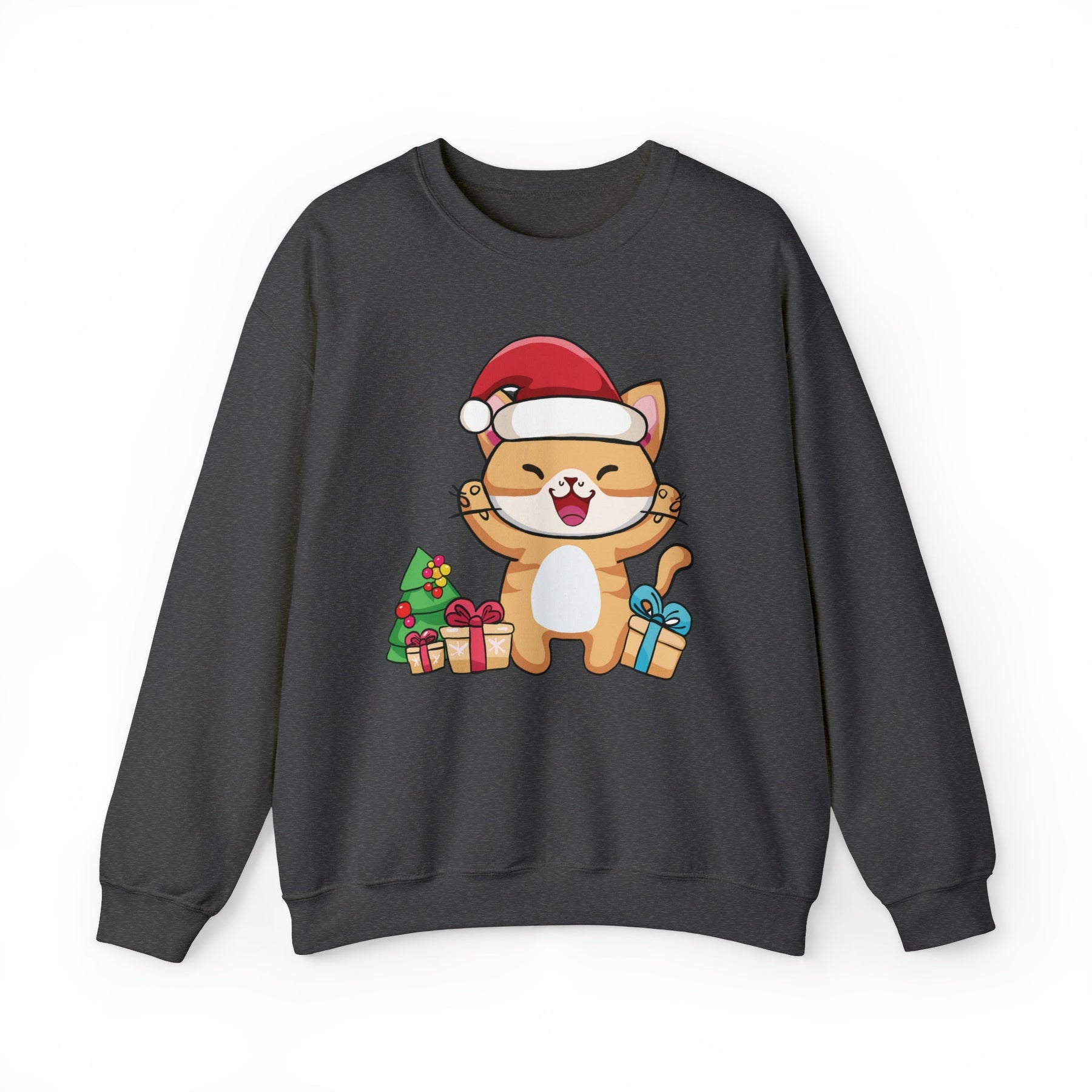 Get into the holiday spirit with our Happy Santa Cat Crewneck Sweatshirt! This adorable and playful sweatshirt features a tan cartoon cat donning a jolly Santa hat, with its arms joyfully raised in celebration. You can't help but smile when you see this festive feline proudly showing off its holiday cheer!