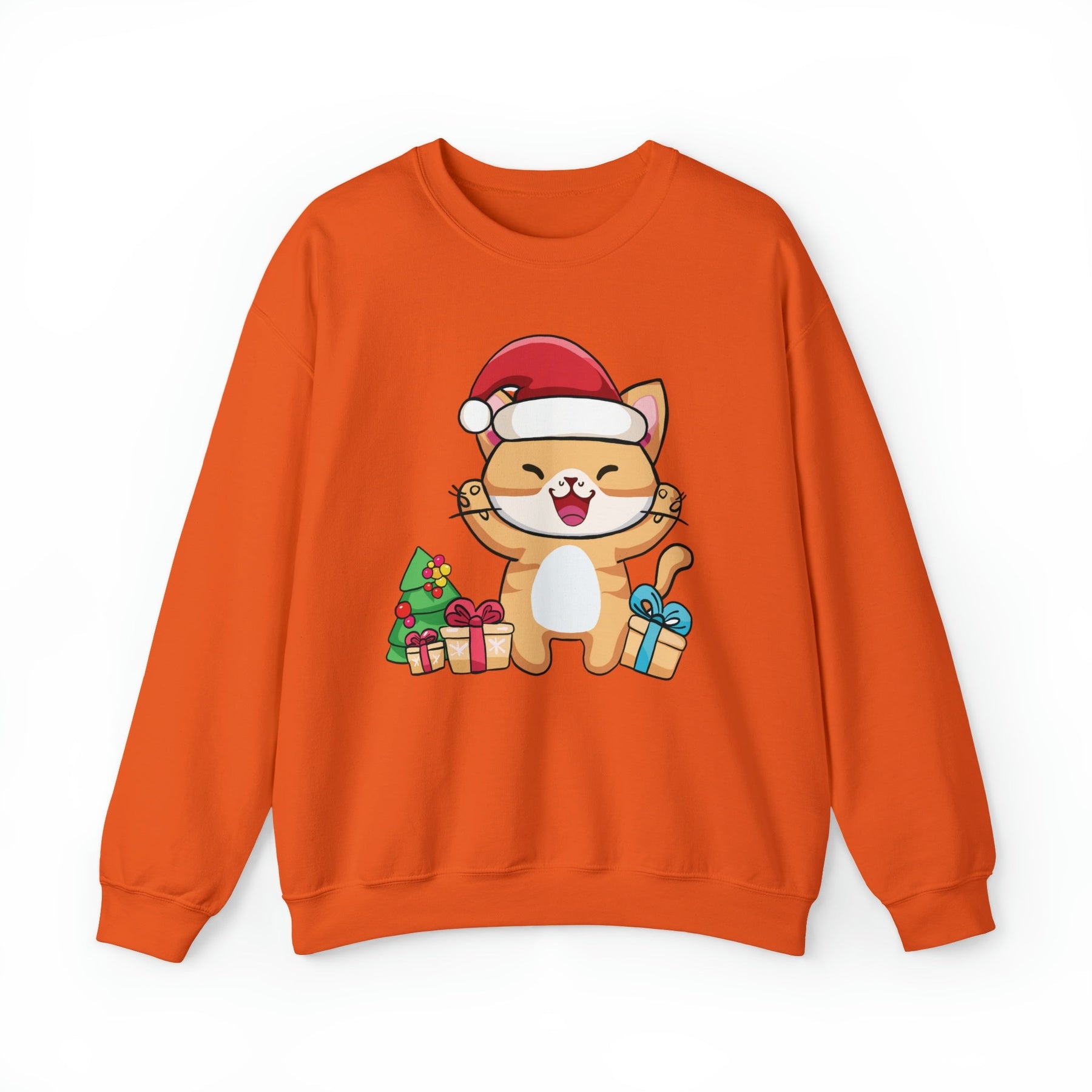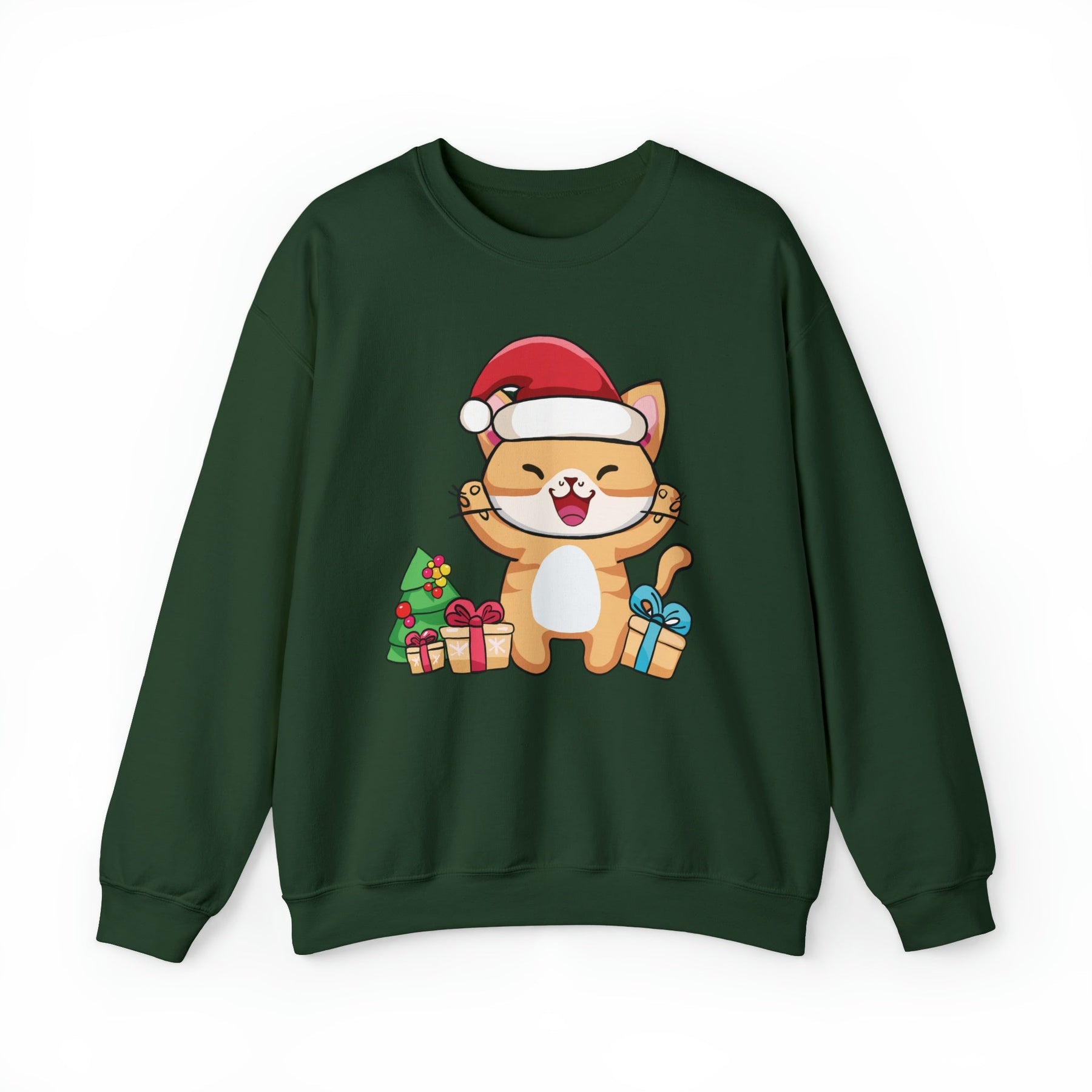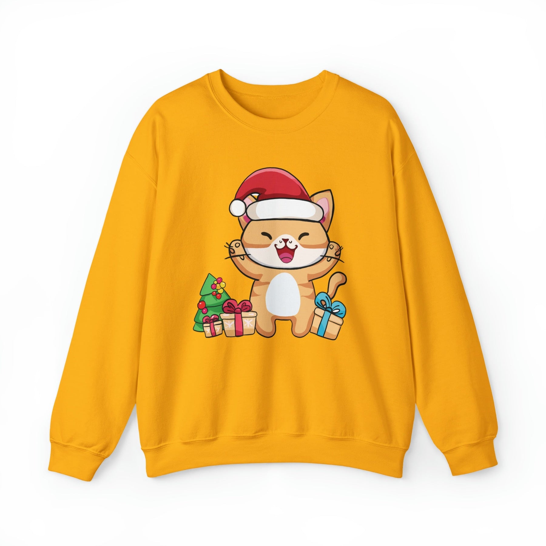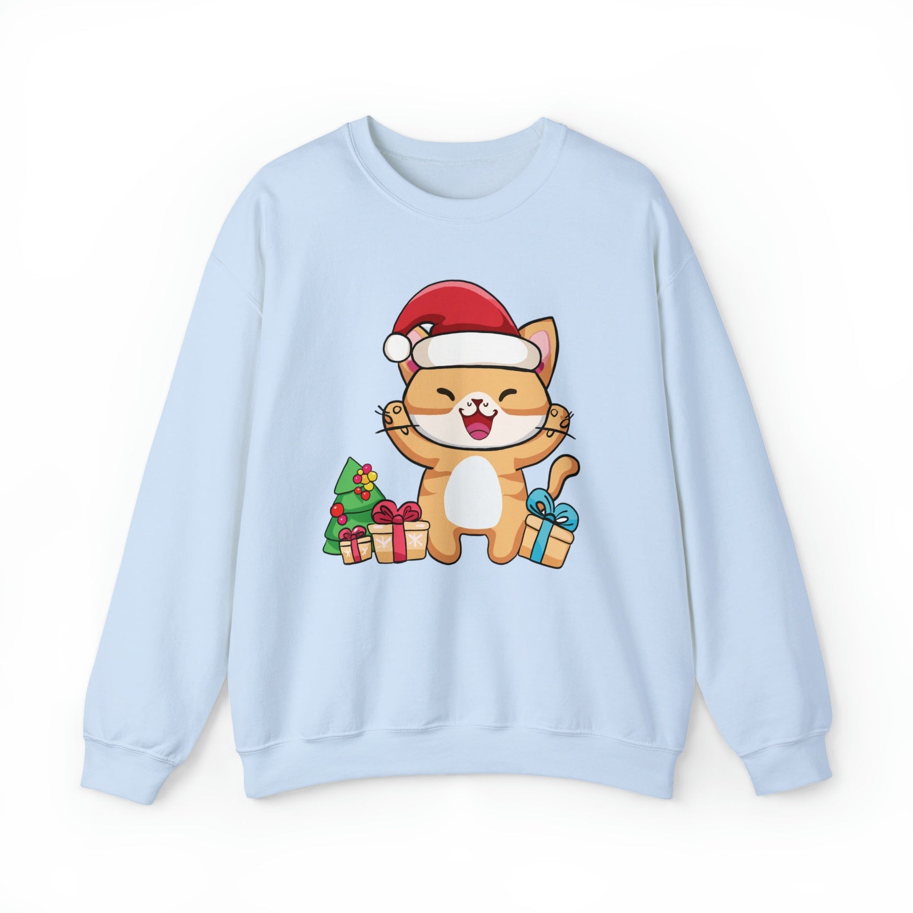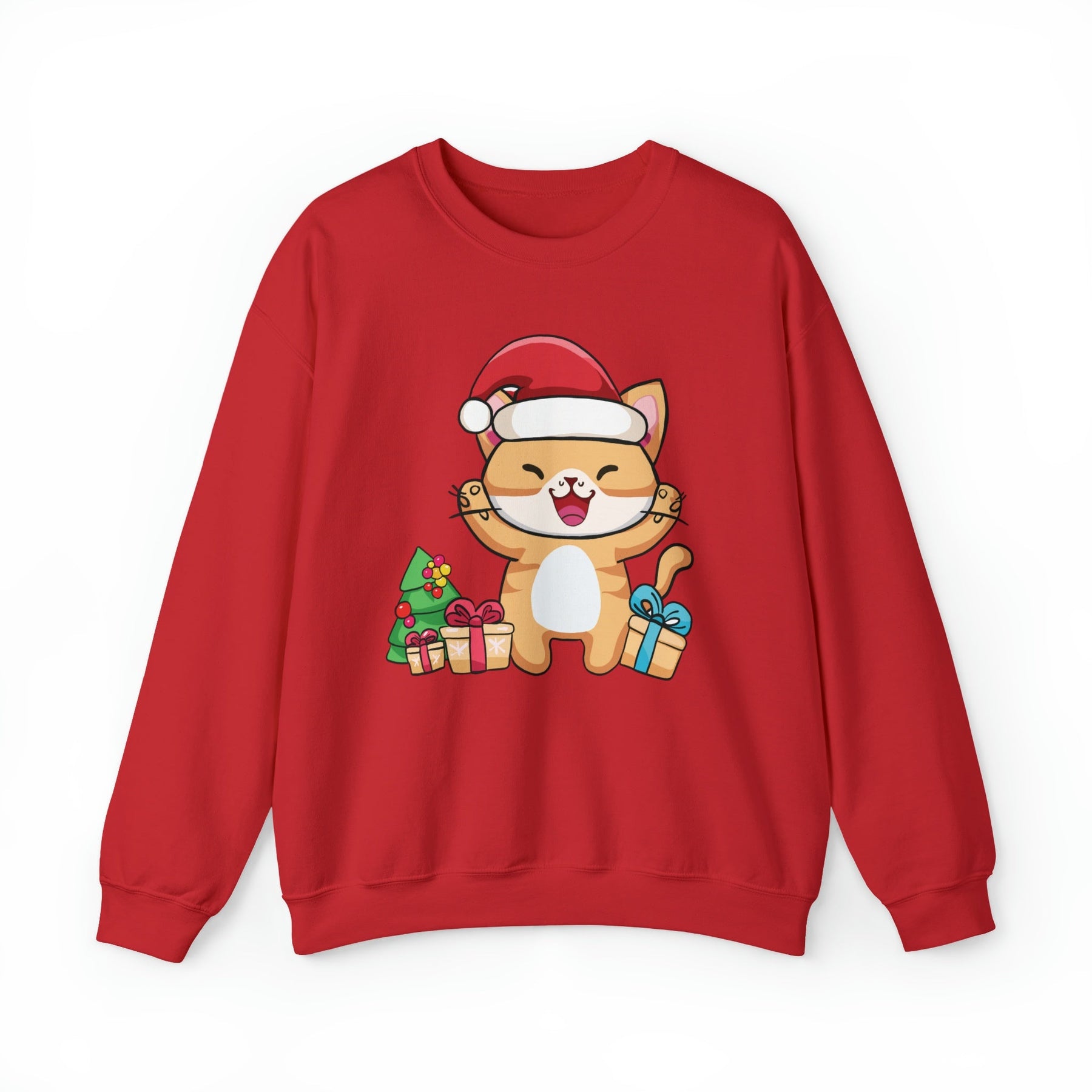Get into the holiday spirit with our Happy Santa Cat Crewneck Sweatshirt! This adorable and playful sweatshirt features a tan cartoon cat donning a jolly Santa hat, with its arms joyfully raised in celebration. You can't help but smile when you see this festive feline proudly showing off its holiday cheer!