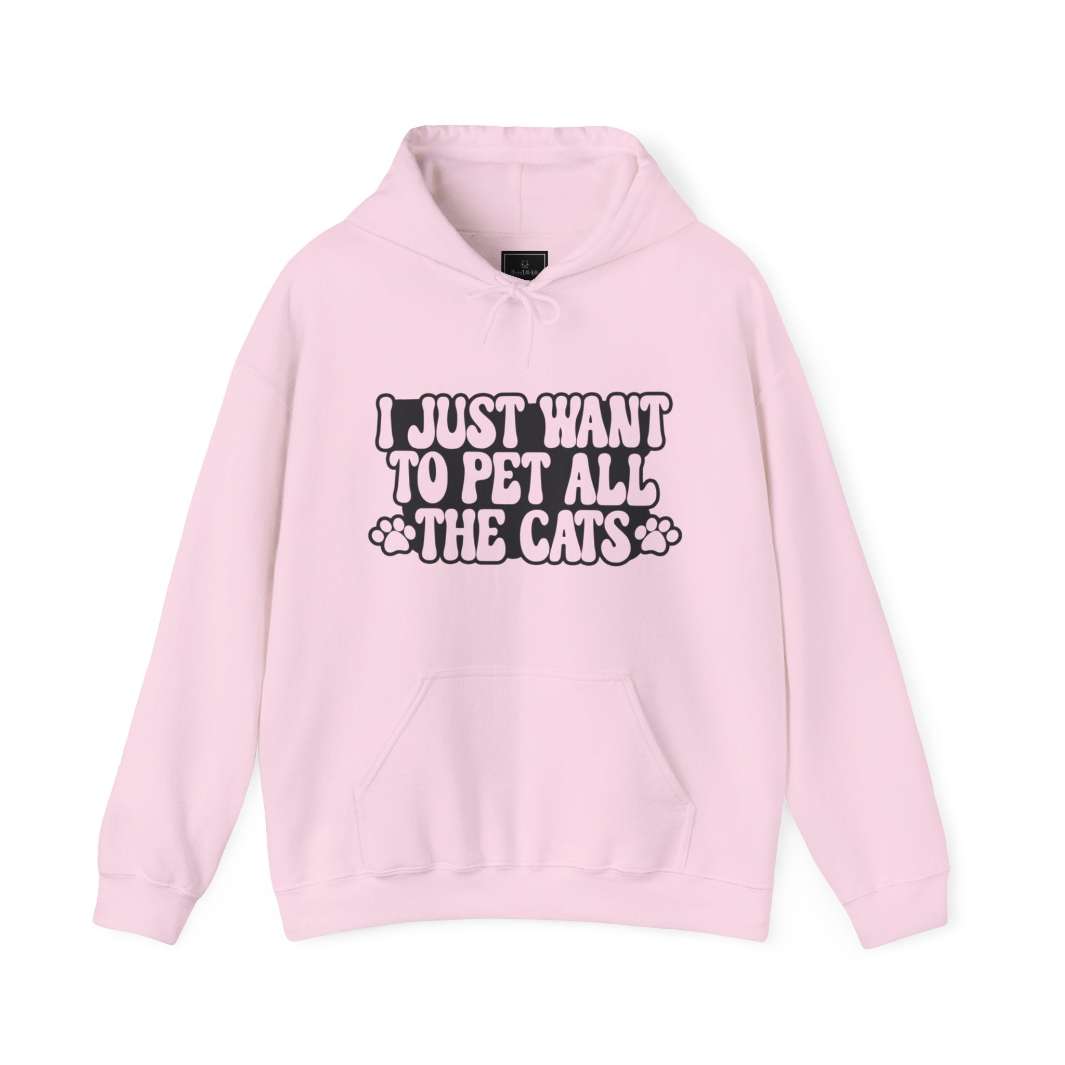 With its adorable design proclaiming "I Just Want To Pet All The Cats" alongside charming paw prints on the side, this hoodie is a proud declaration of your deep affection for our furry friends. But it's not just about the message; this hoodie has much more to offer.