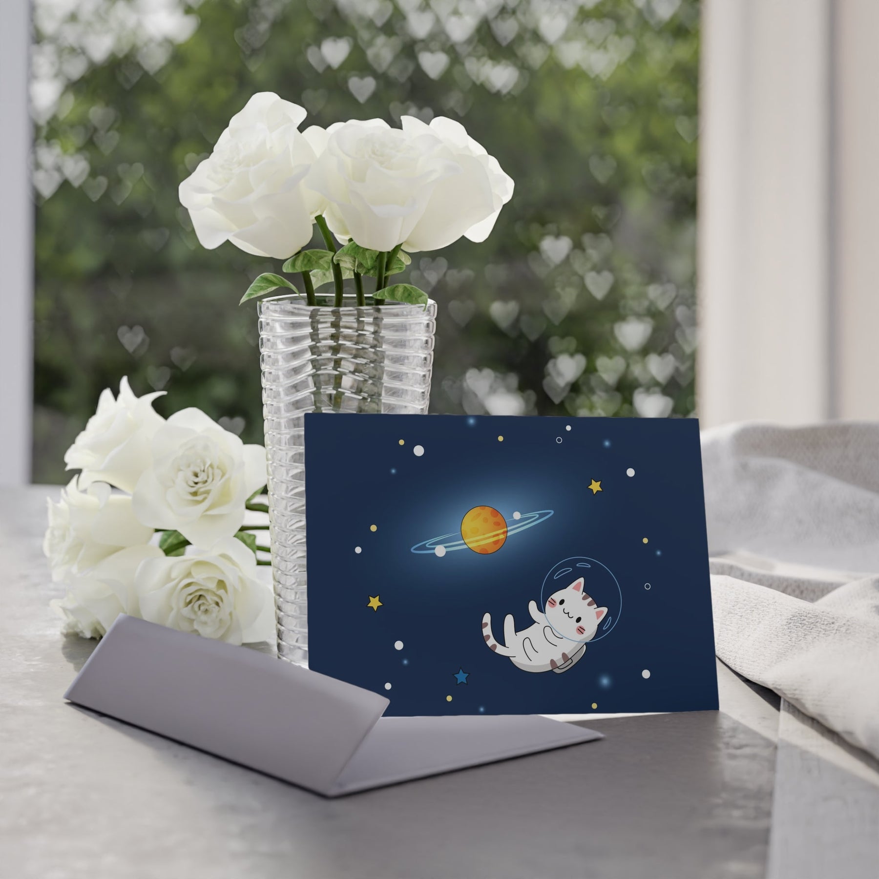 With every purchase, you will receive a crisp white envelope, ensuring that your precious creation arrives safely and in style. Share in the enchantment of space exploration with your loved ones by sending them this extraordinary card that captures the magic of feline curiosity and the vast expanse of the universe.