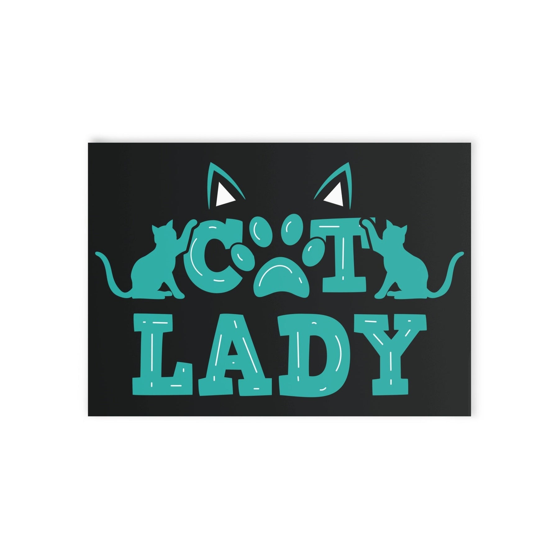 This adorable greeting card will bring sweetness and joy to the recipient due to its charming design. The black background card features the words “Cat Lady” in a distinctive teal hue with two realistic cat ears, a paw print, and the outline of two cats that will make any cat lover smile!