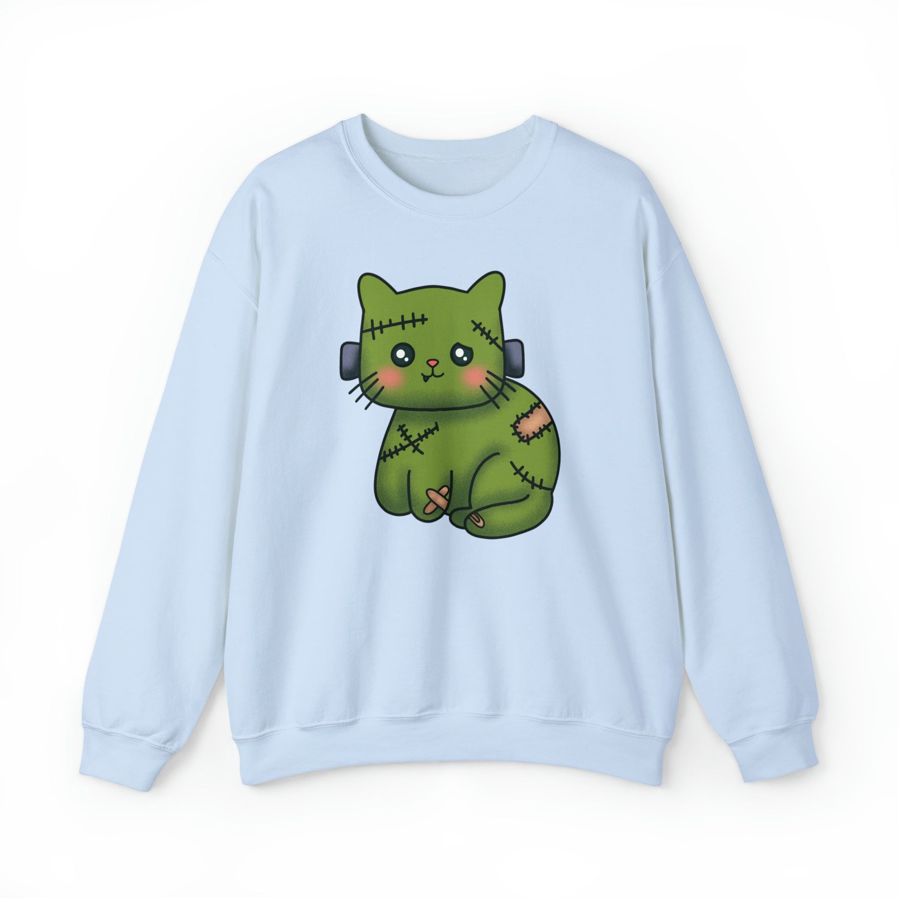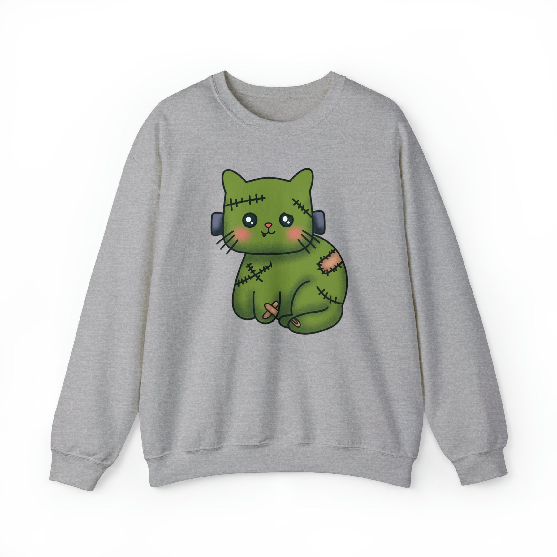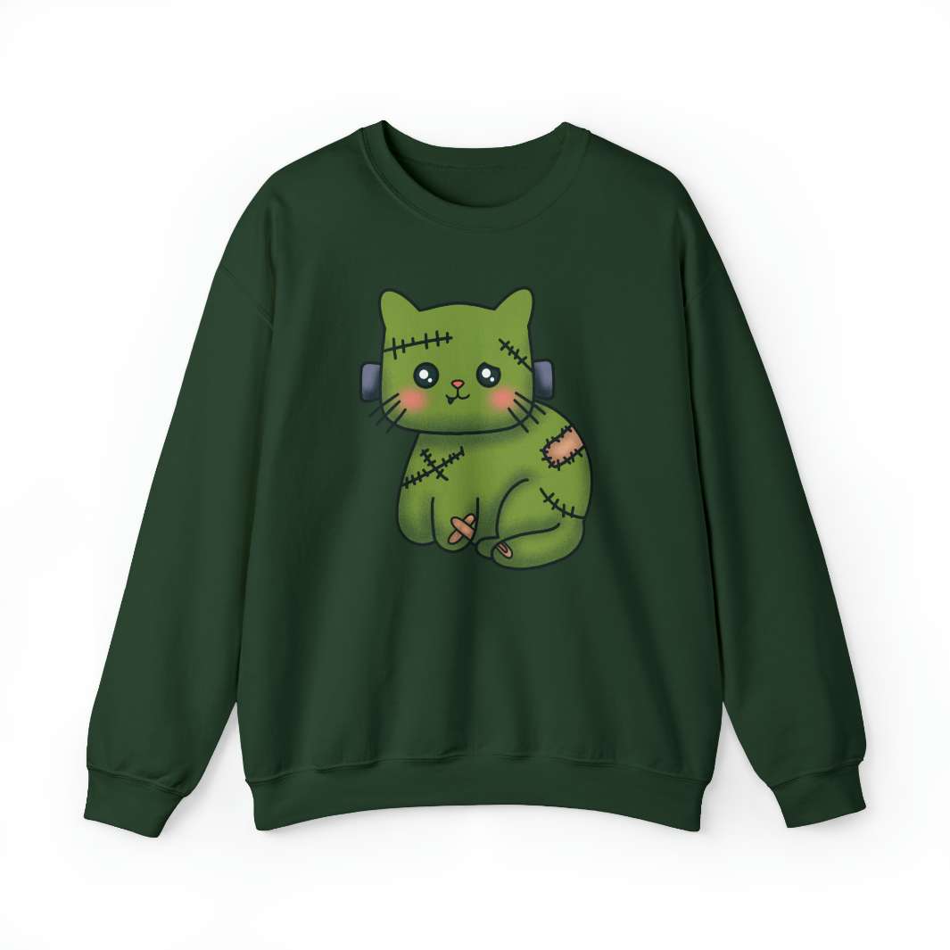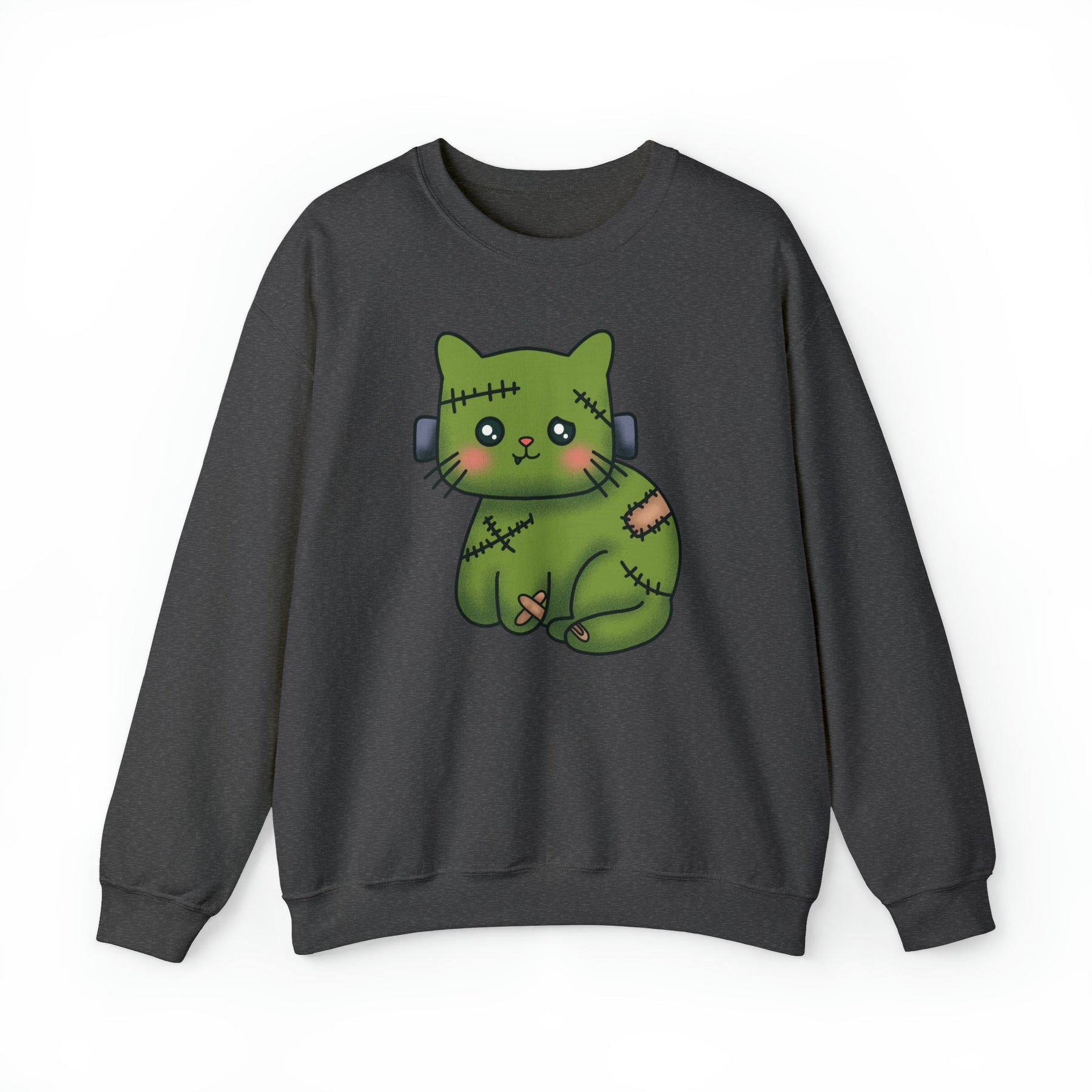 Stay cozy and look groovy with the one-of-a-kind Frankenkitty Unisex Crewneck Sweatshirt! This fun and unique design features a cartoon green cat dressed up like Frankenstein, complete with stitches and a band aid. Get ready to make a statement and turn heads as you rock this fun look this Halloween!