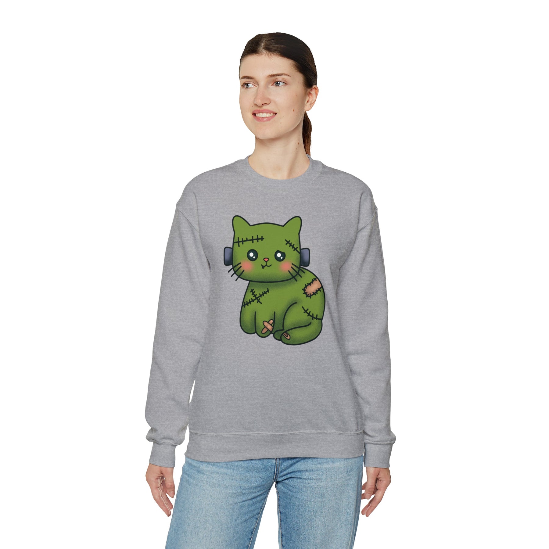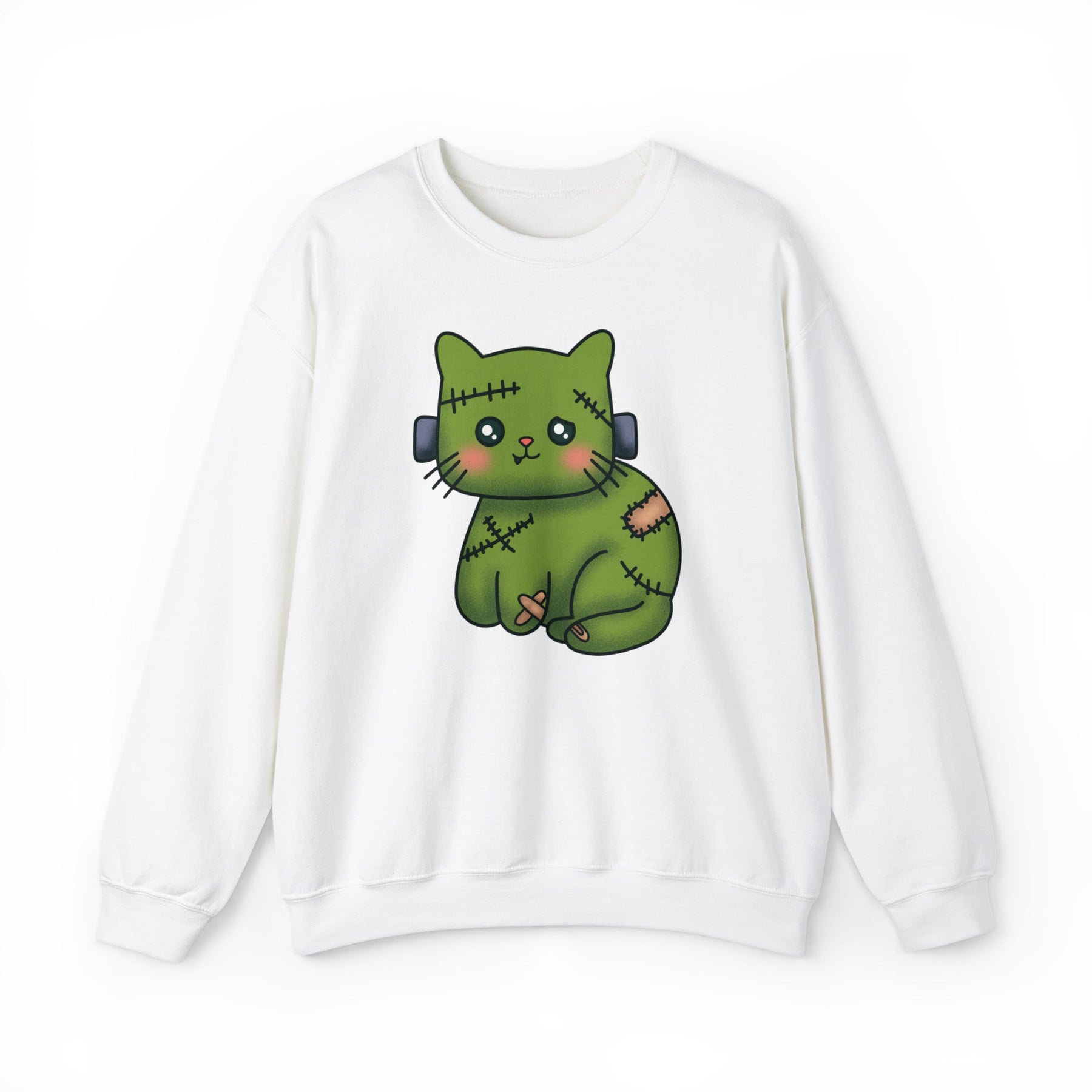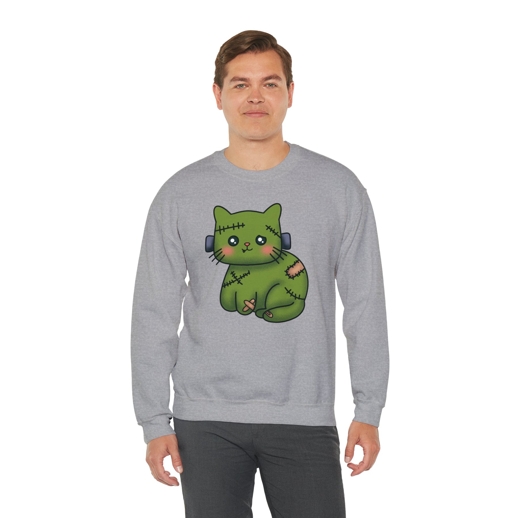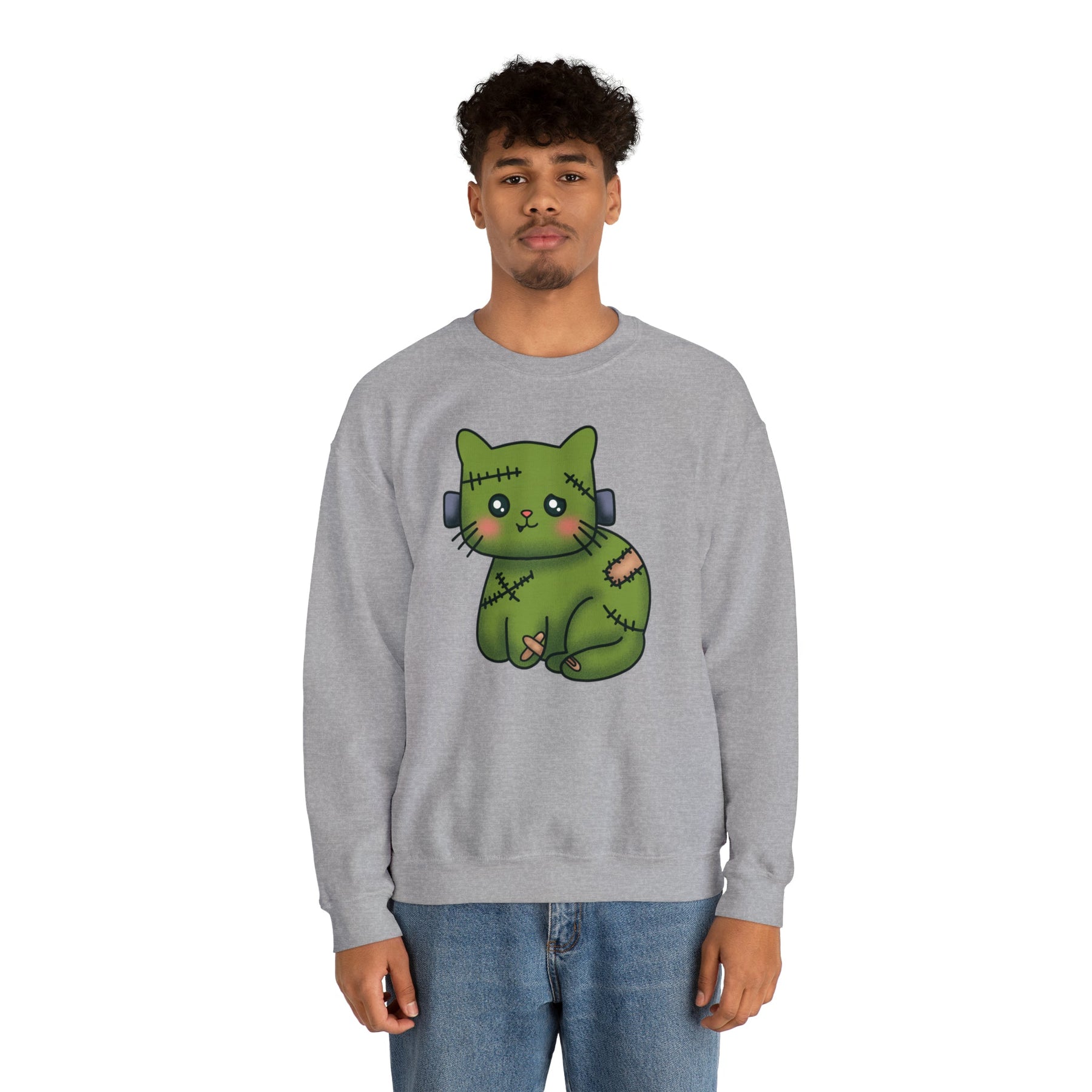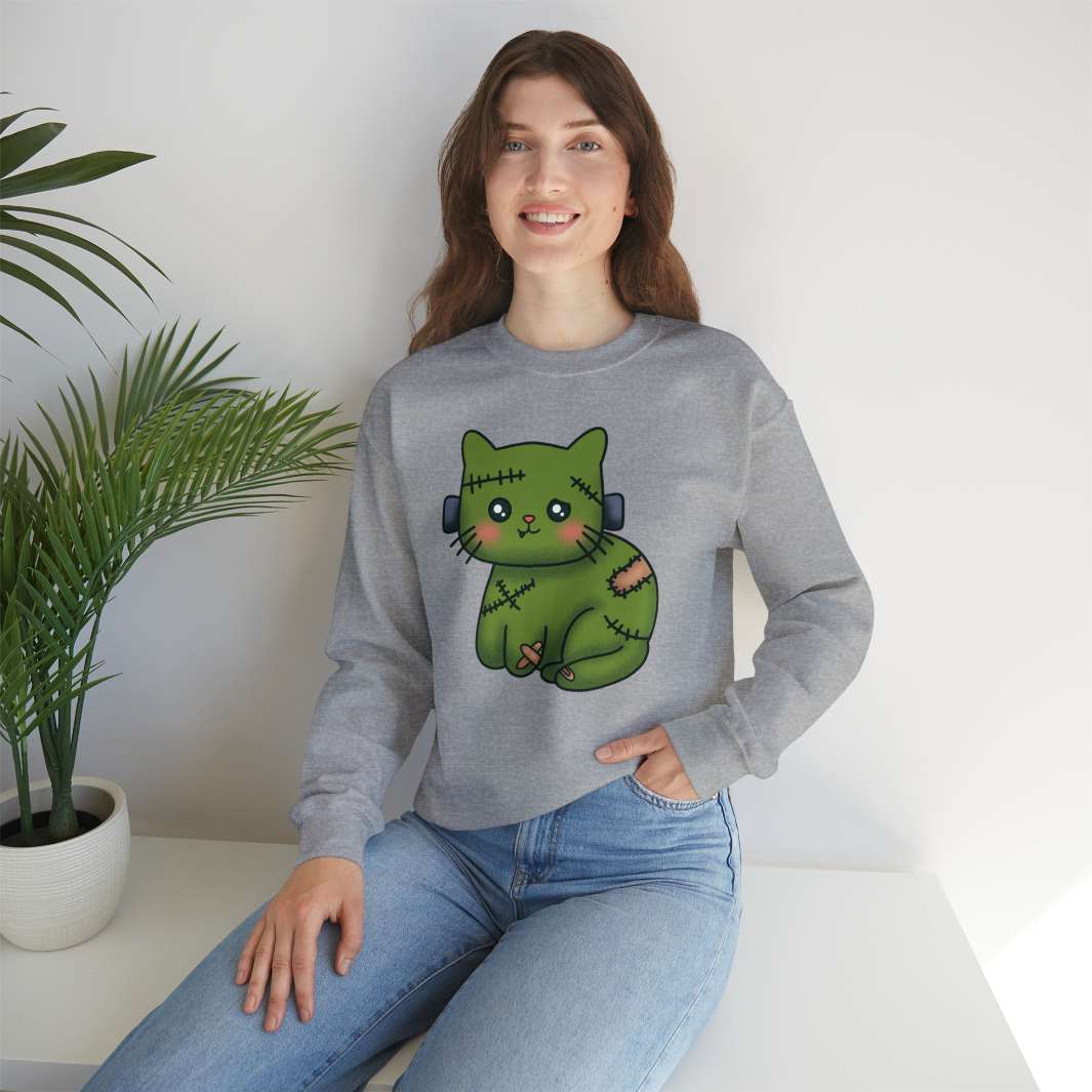 Stay cozy and look groovy with the one-of-a-kind Frankenkitty Unisex Crewneck Sweatshirt! This fun and unique design features a cartoon green cat dressed up like Frankenstein, complete with stitches and a band aid. Get ready to make a statement and turn heads as you rock this fun look this Halloween!