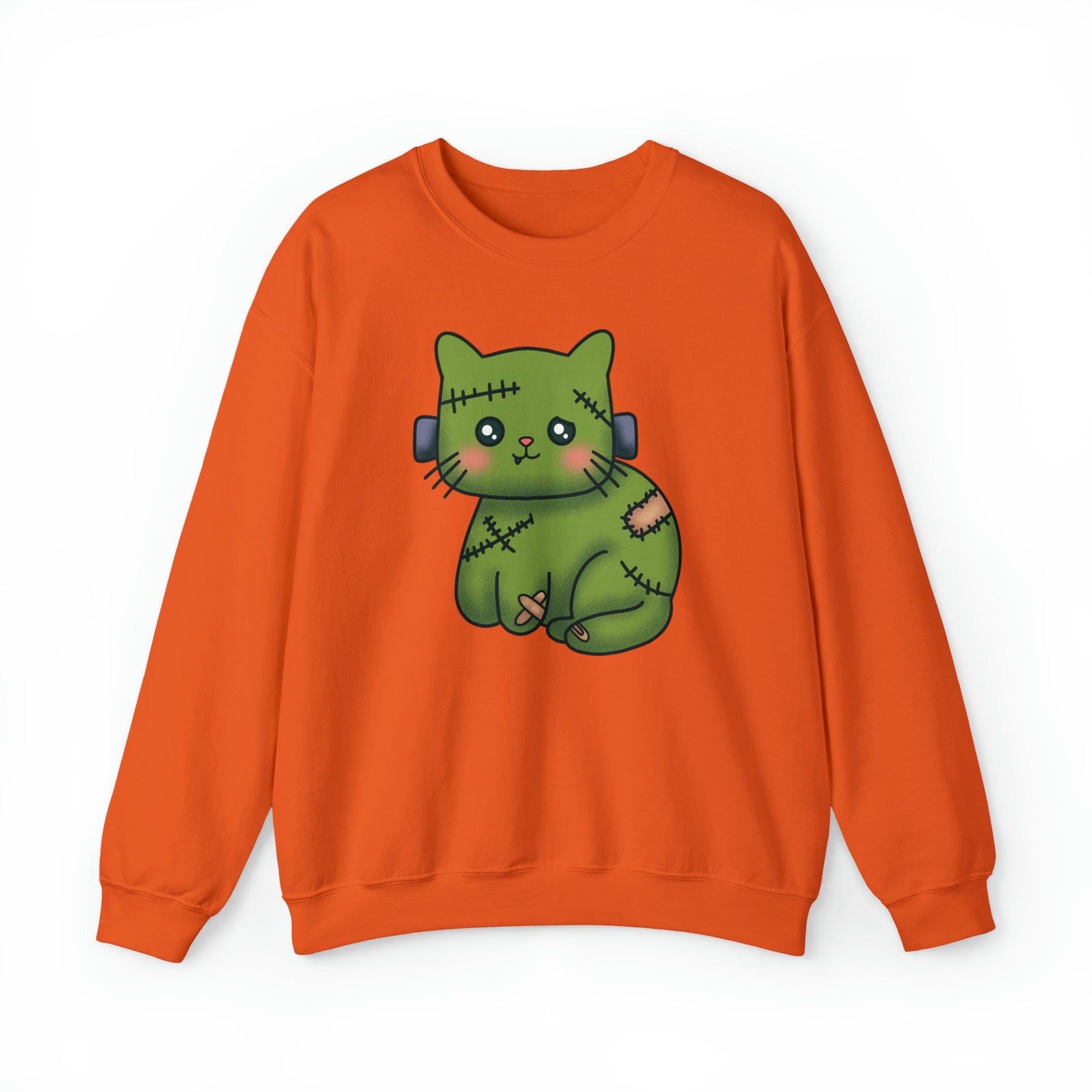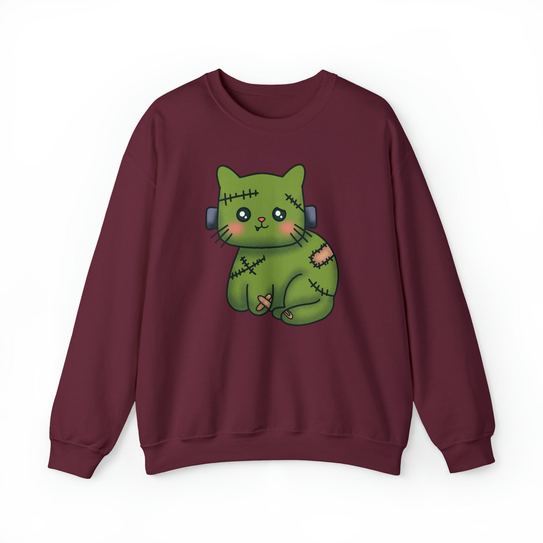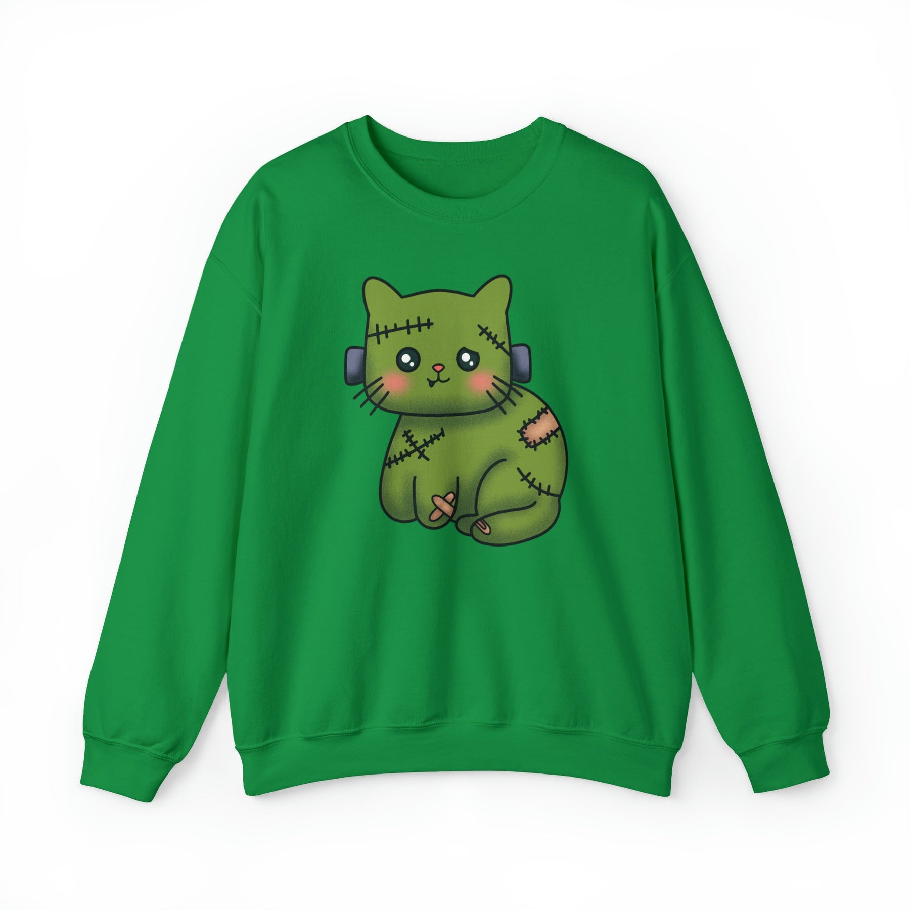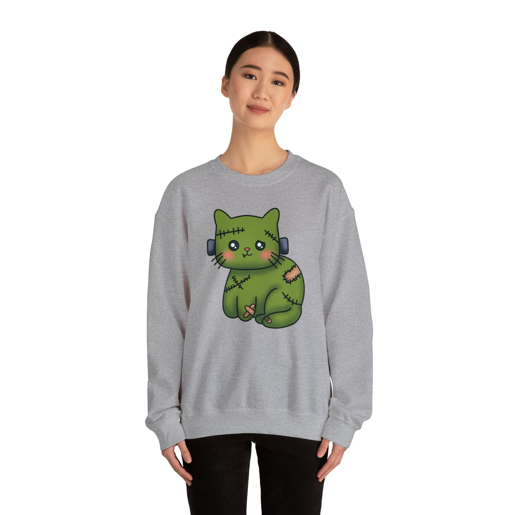 Stay cozy and look groovy with the one-of-a-kind Frankenkitty Unisex Crewneck Sweatshirt! This fun and unique design features a cartoon green cat dressed up like Frankenstein, complete with stitches and a band aid. Get ready to make a statement and turn heads as you rock this fun look this Halloween!