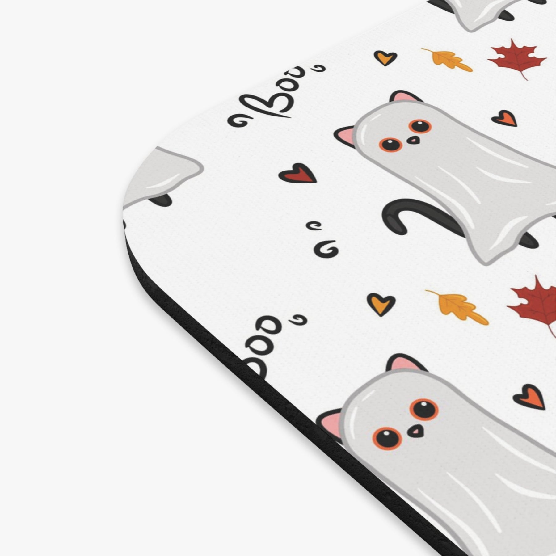 This fun and festive mouse pad boasts bright colors and is covered in a cute cartoon cat dressed in an adorable white sheet ghost costume. Red and yellow fall leaves surround it, and the bold word "BOO" will bring a smile to even the most stoic face.