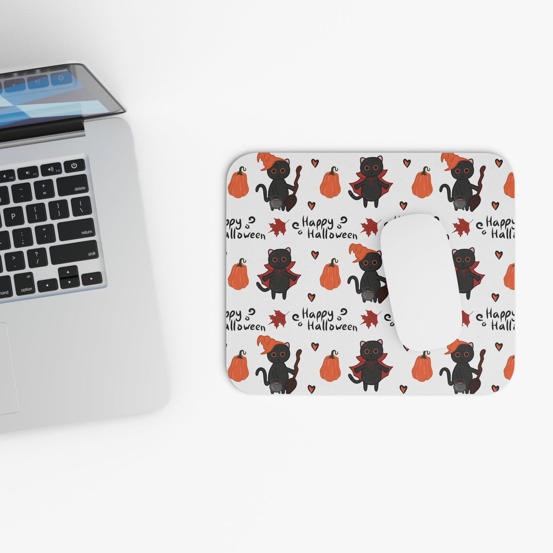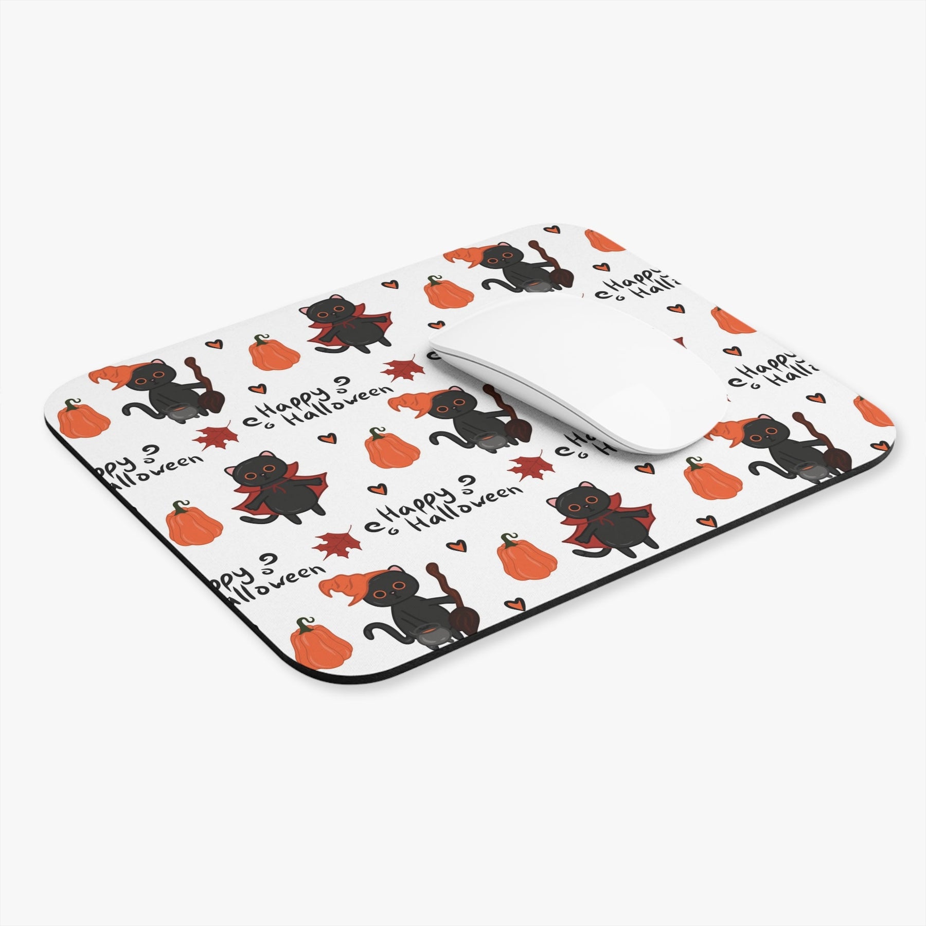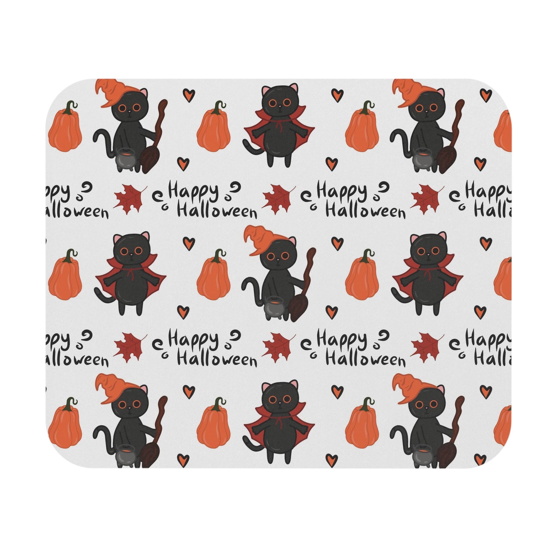 This mouse pad is the purr-fect way to add a touch of Halloween fun to your computer desk. Featuring a white background adorned with cartoon black cats wearing red capes and orange witch's hats, each ready to take off on a Halloween escapade. There’s also a little pumpkin and some fall leaves all around, as well as the words “Happy Halloween”!