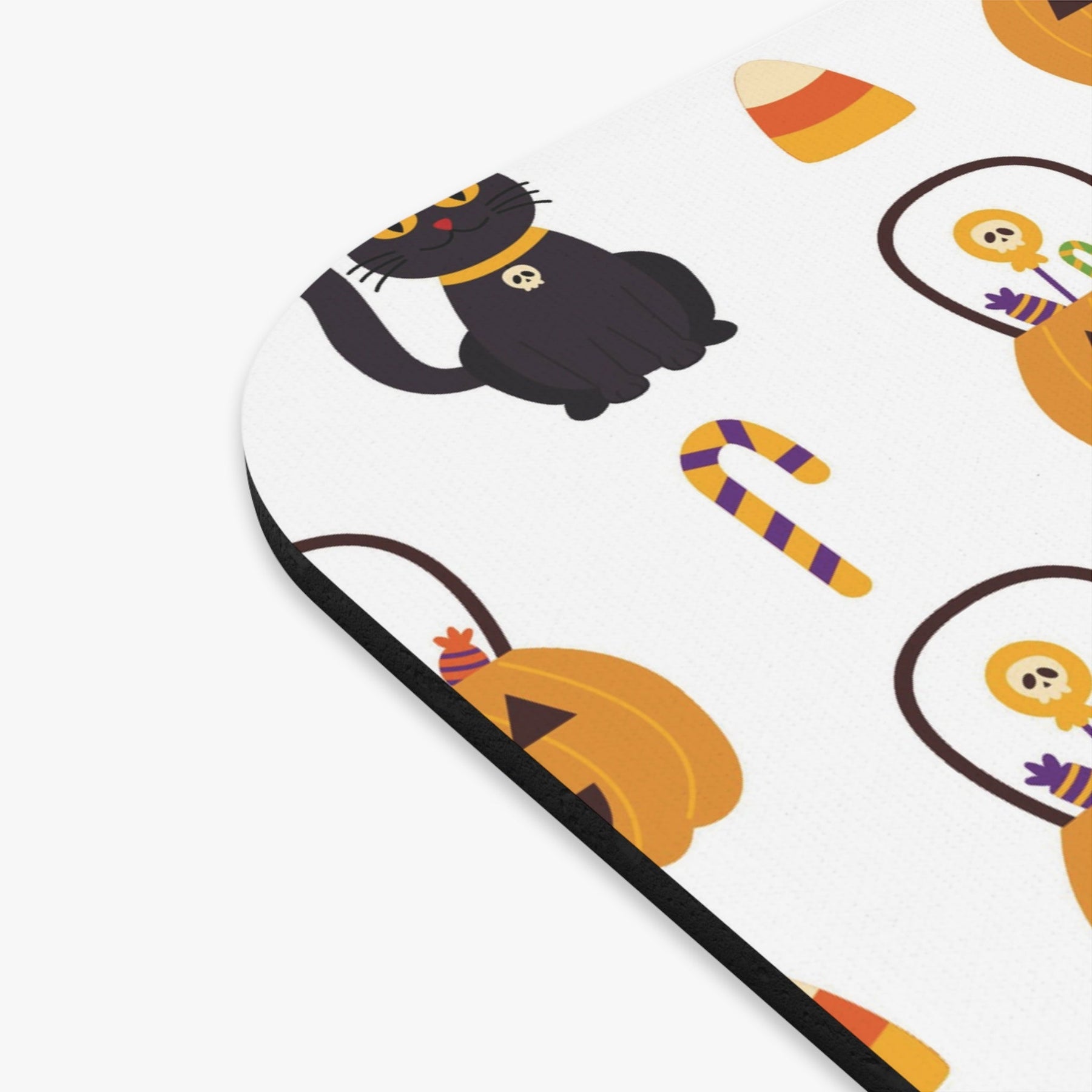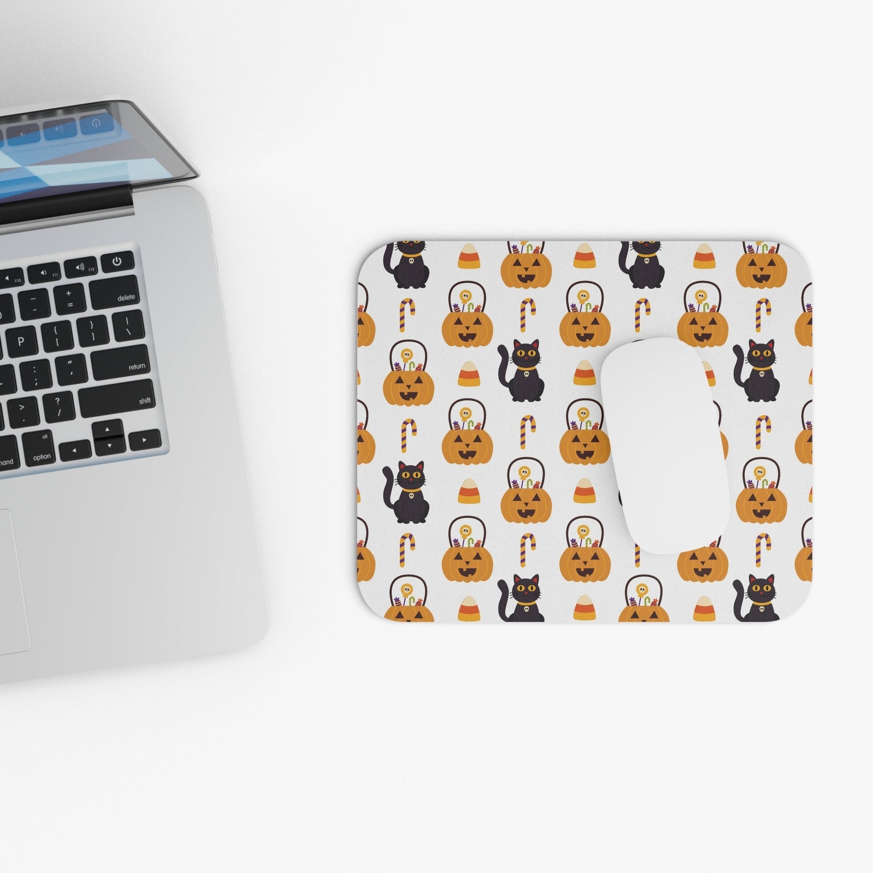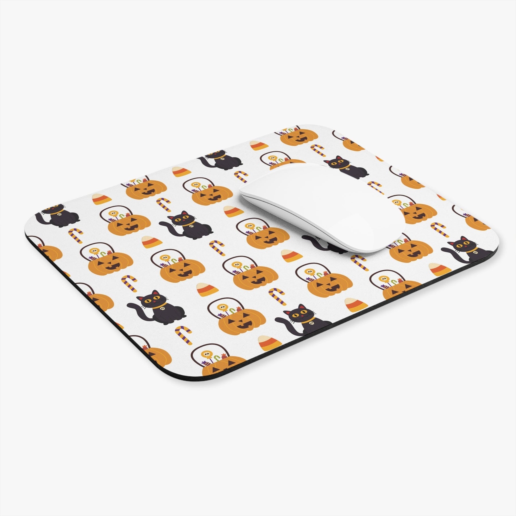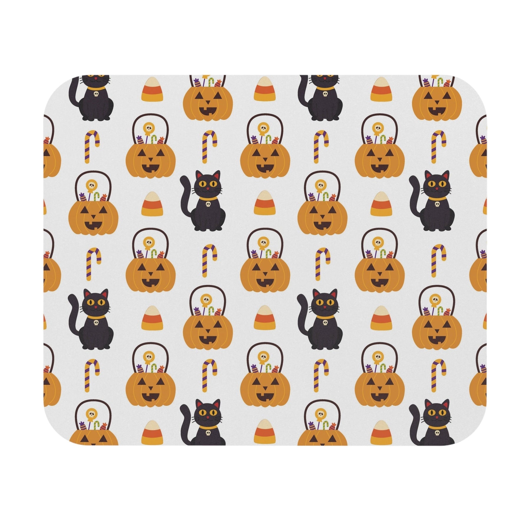 This mouse pad has been expertly designed with cat lovers in mind. It features an inviting white background adorned with vibrant orange jack o lanterns—complete with candy spilling out—and charming black cats. Throw in some classic candy corn to round out the design and you have a perfect mousepad for both amateur and professional cat-lovers alike!