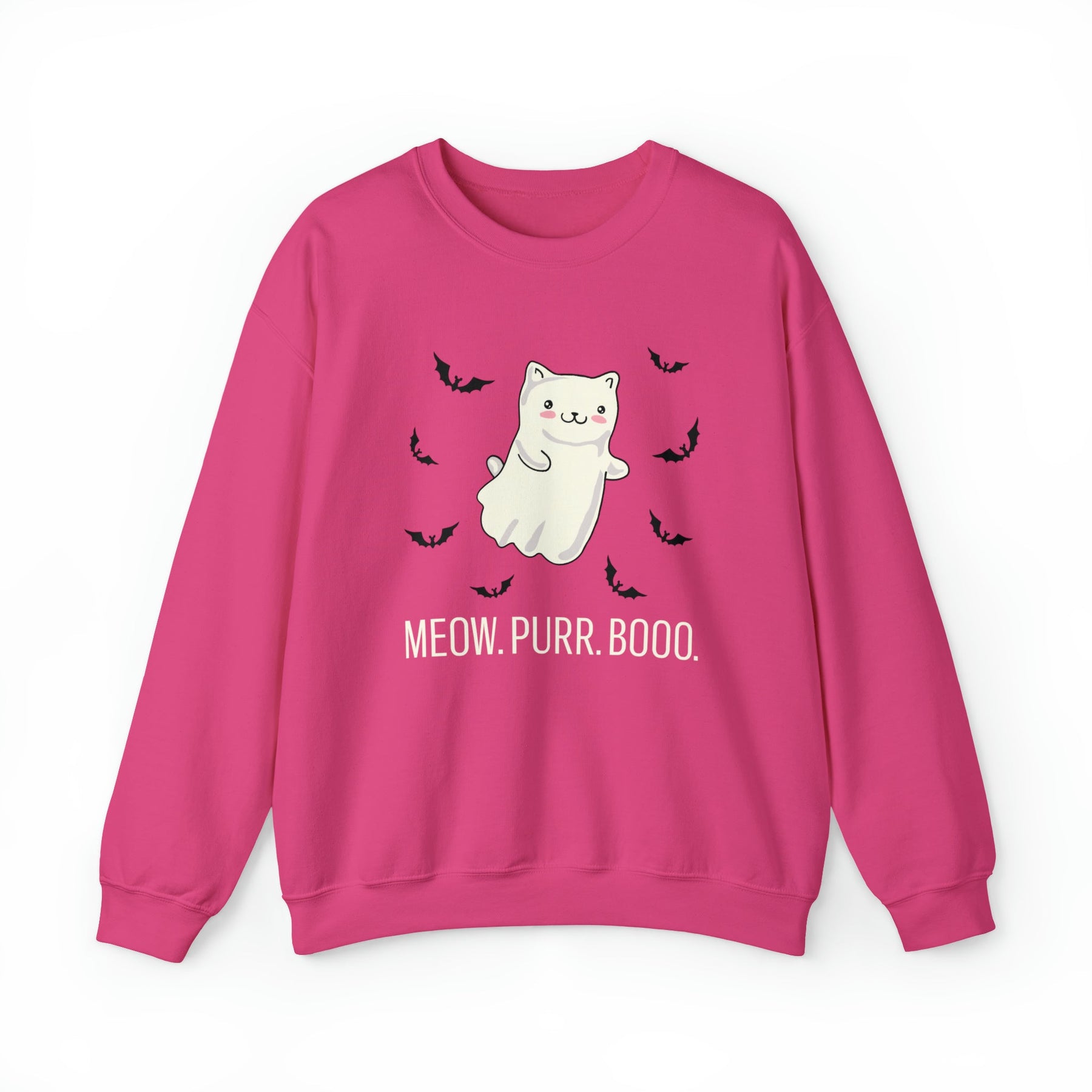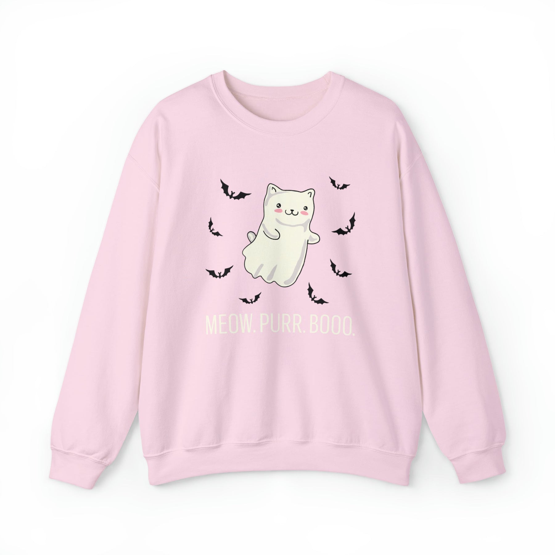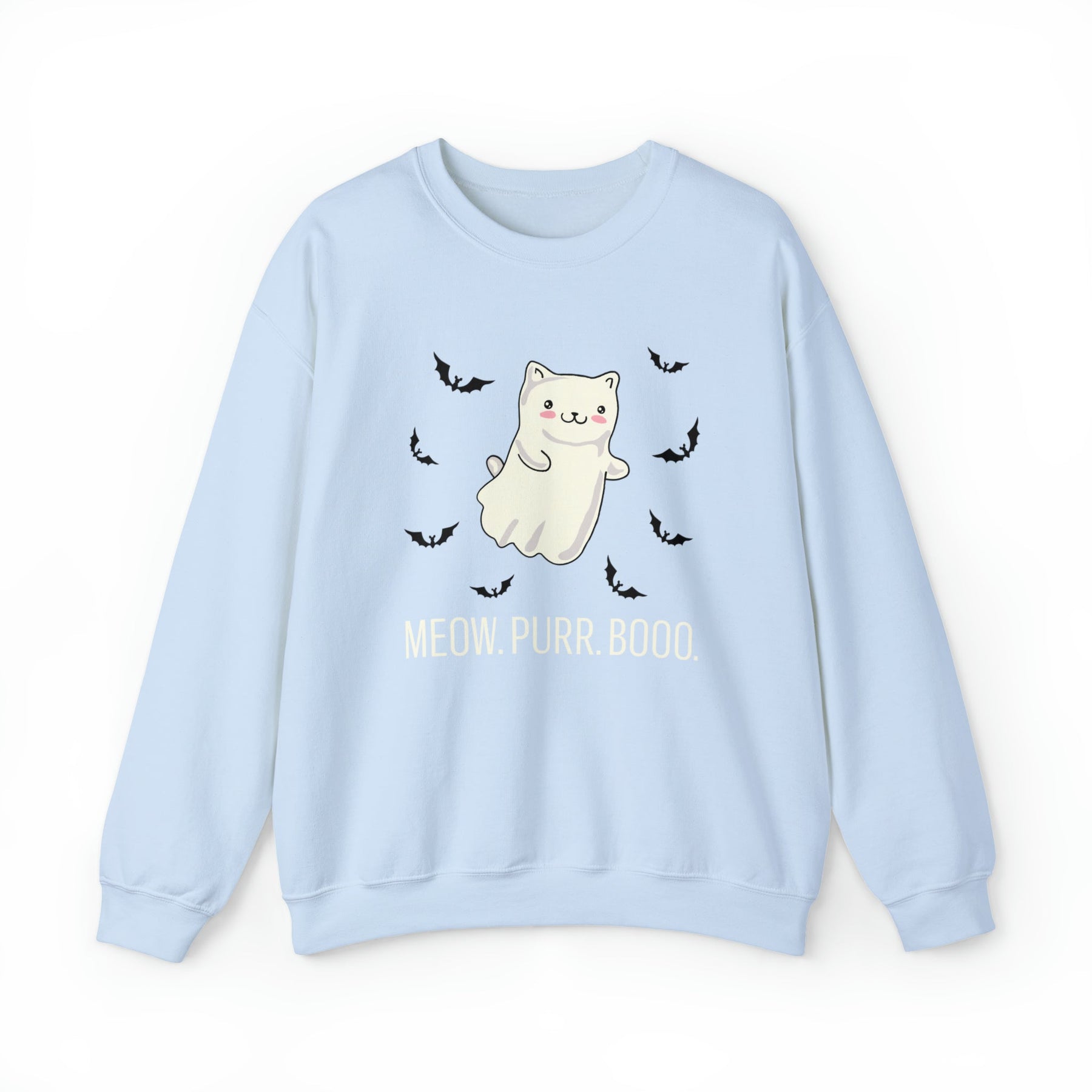 Designed with love and attention to detail, this unique and stylish sweatshirt features an enchanting backdrop, framed by tiny bats that give it a whimsical look. At the center is a friendly kitty dressed up as a ghost, making it the perfect symbol of cozy companionship and Halloween mischief. Made with a comfortable medium blend fabric and the playfully included words “Meow. Purr. Boo.”, this one-of-a-kind piece brings together all of the autumnal vibes without sacrificing style.