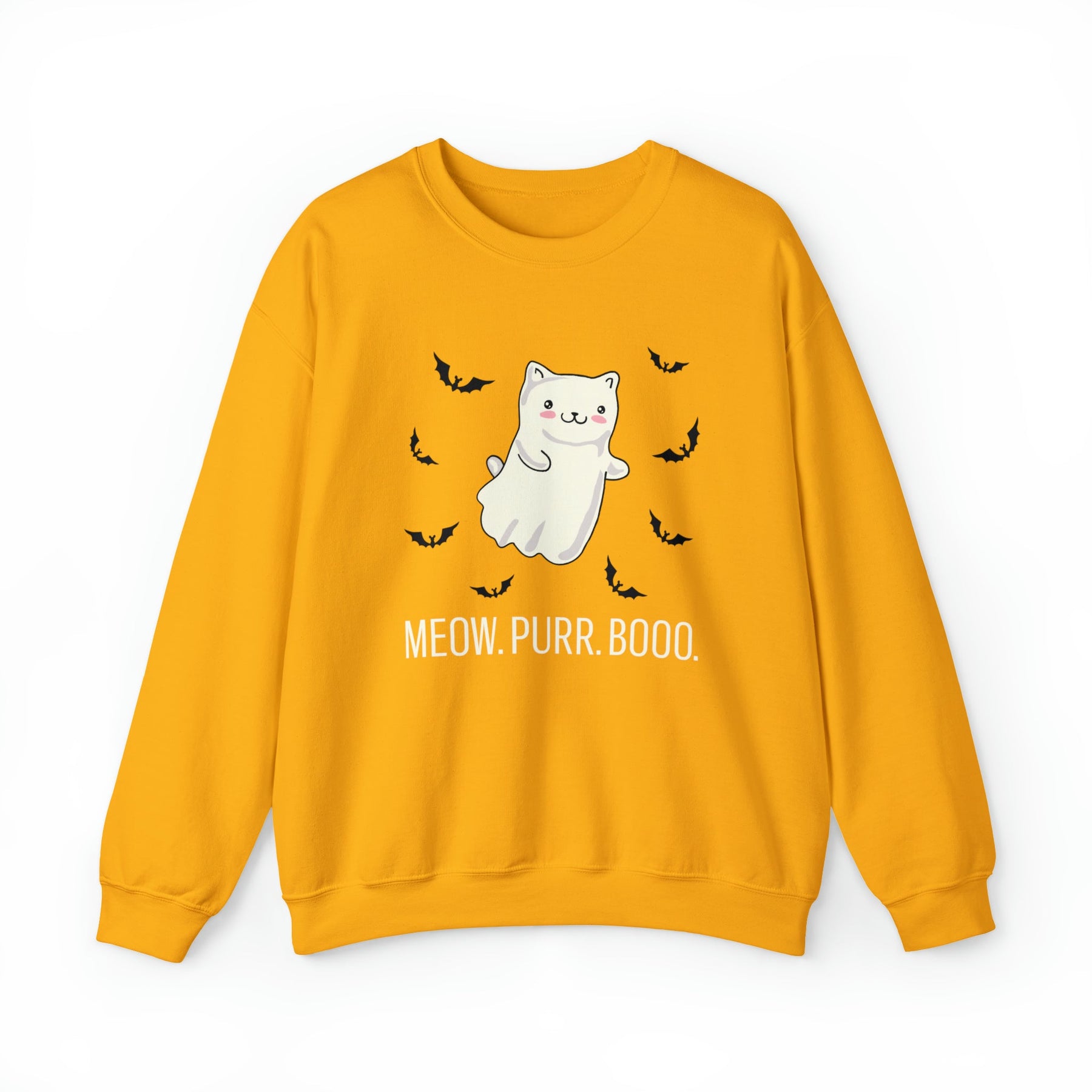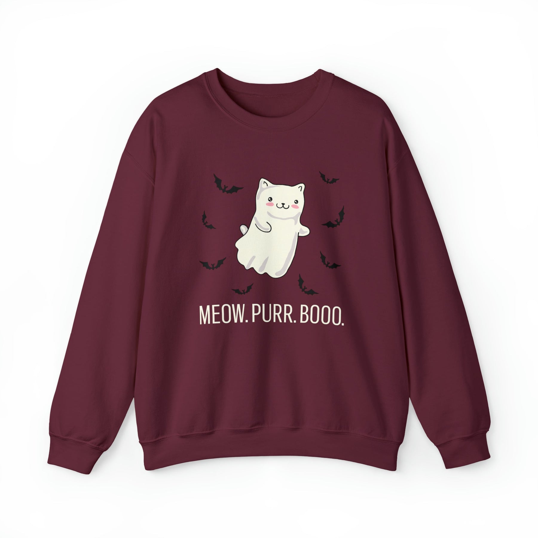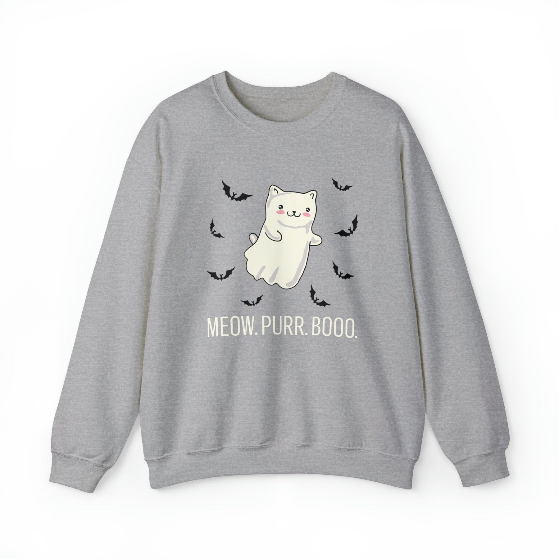 Designed with love and attention to detail, this unique and stylish sweatshirt features an enchanting backdrop, framed by tiny bats that give it a whimsical look. At the center is a friendly kitty dressed up as a ghost, making it the perfect symbol of cozy companionship and Halloween mischief. Made with a comfortable medium blend fabric and the playfully included words “Meow. Purr. Boo.”, this one-of-a-kind piece brings together all of the autumnal vibes without sacrificing style.