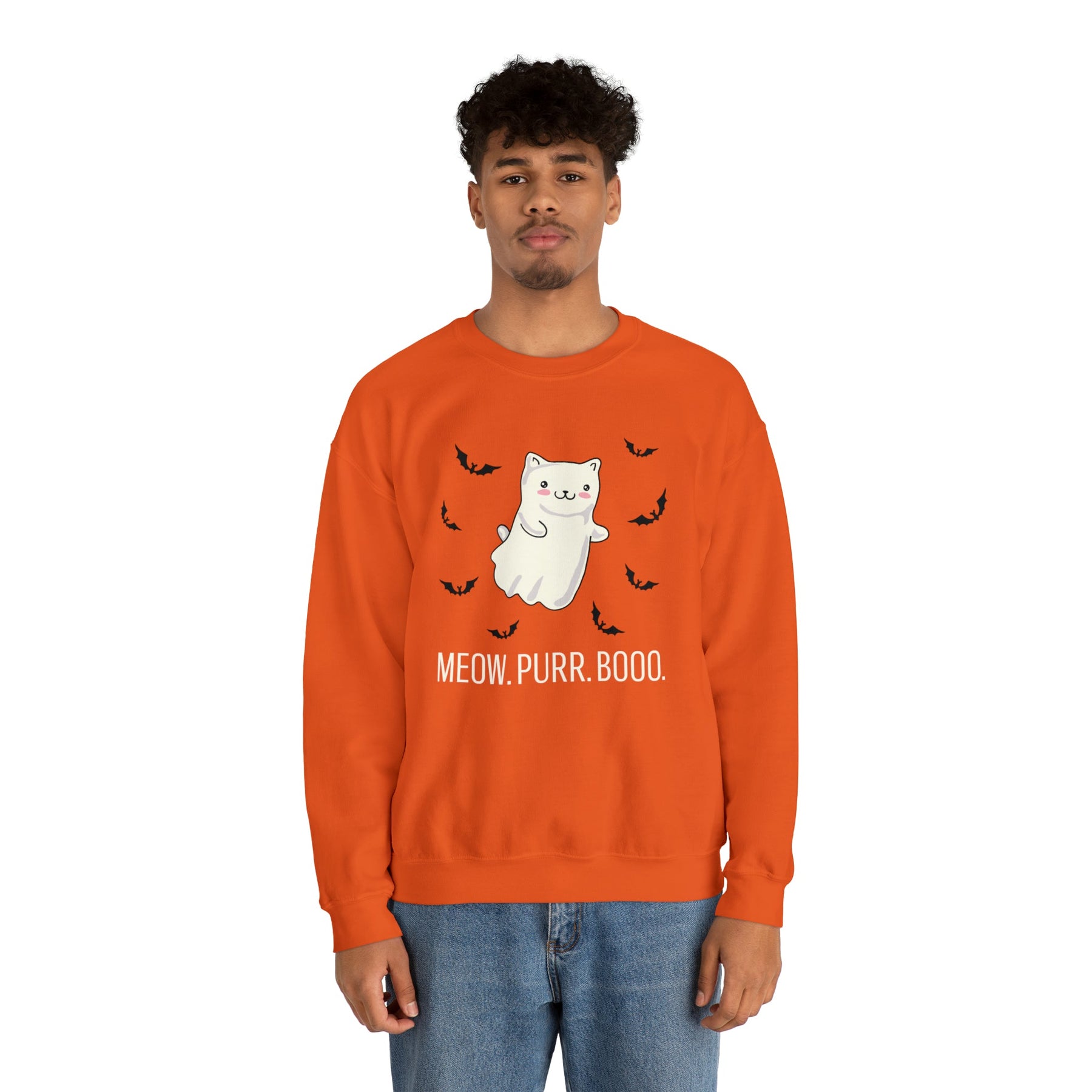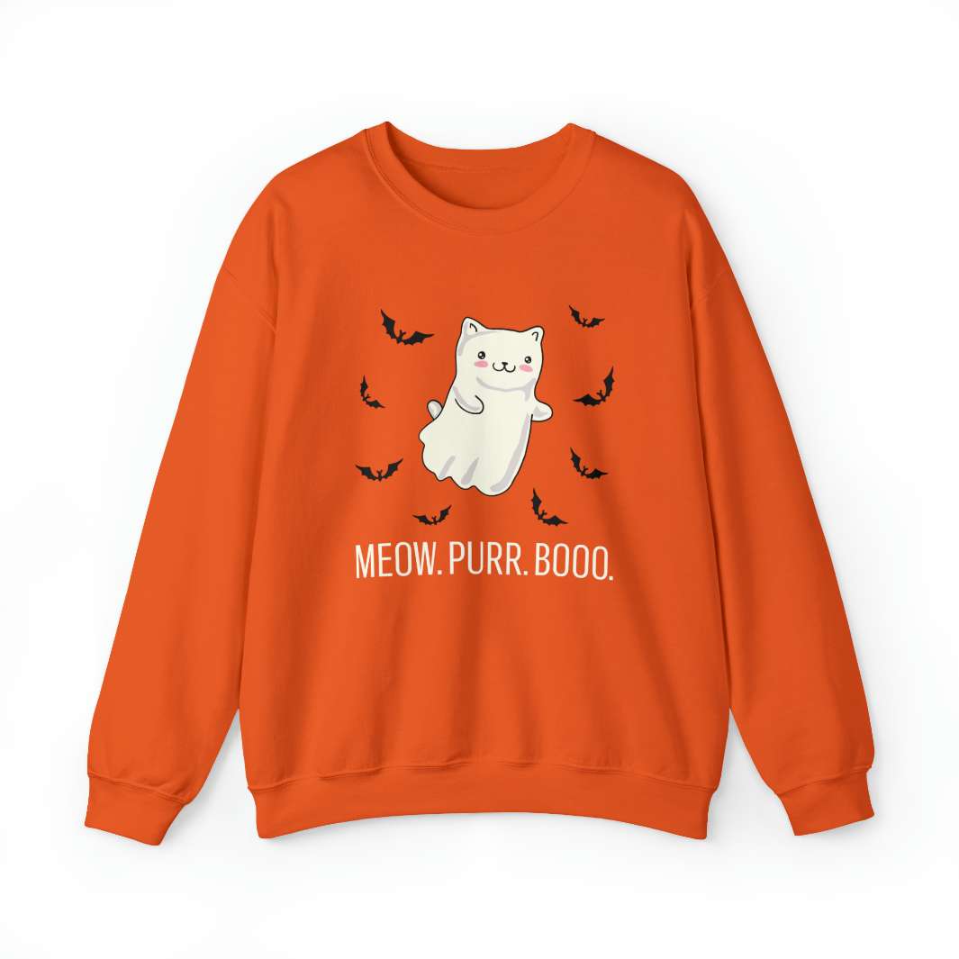 So, for those of you looking to express your inner feline while adding a touch of spookiness to your wardrobe, look no further than the Meow. Purr. Boo. Unisex Crewneck Sweatshirt! It'll have you purring with joy and feeling pawsitively cute!