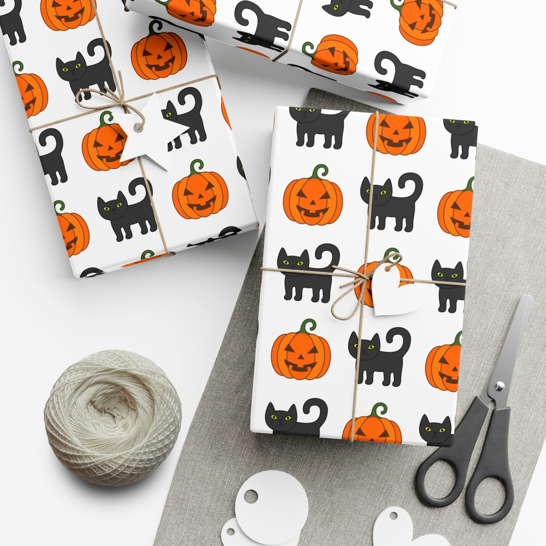 With its crisp white background, this gift wrap serves as the perfect canvas for our smiling orange jack o lanterns and playful black cats. Each print is designed with intricate detail, capturing the mischievous and lovable nature of our feline friends. You'll find yourself smiling as you wrap each gift, imagining the joy it will bring to the recipient.