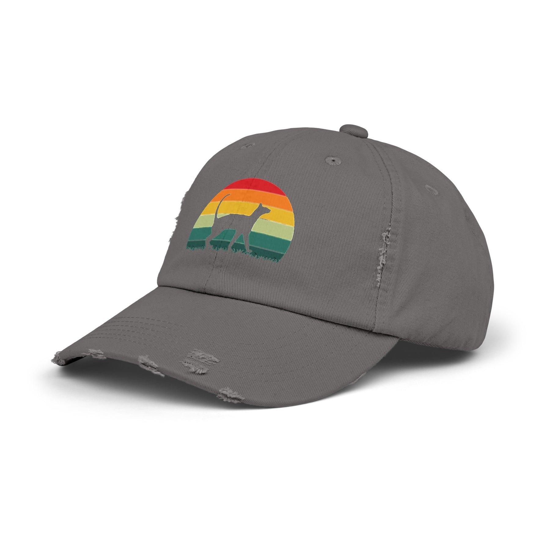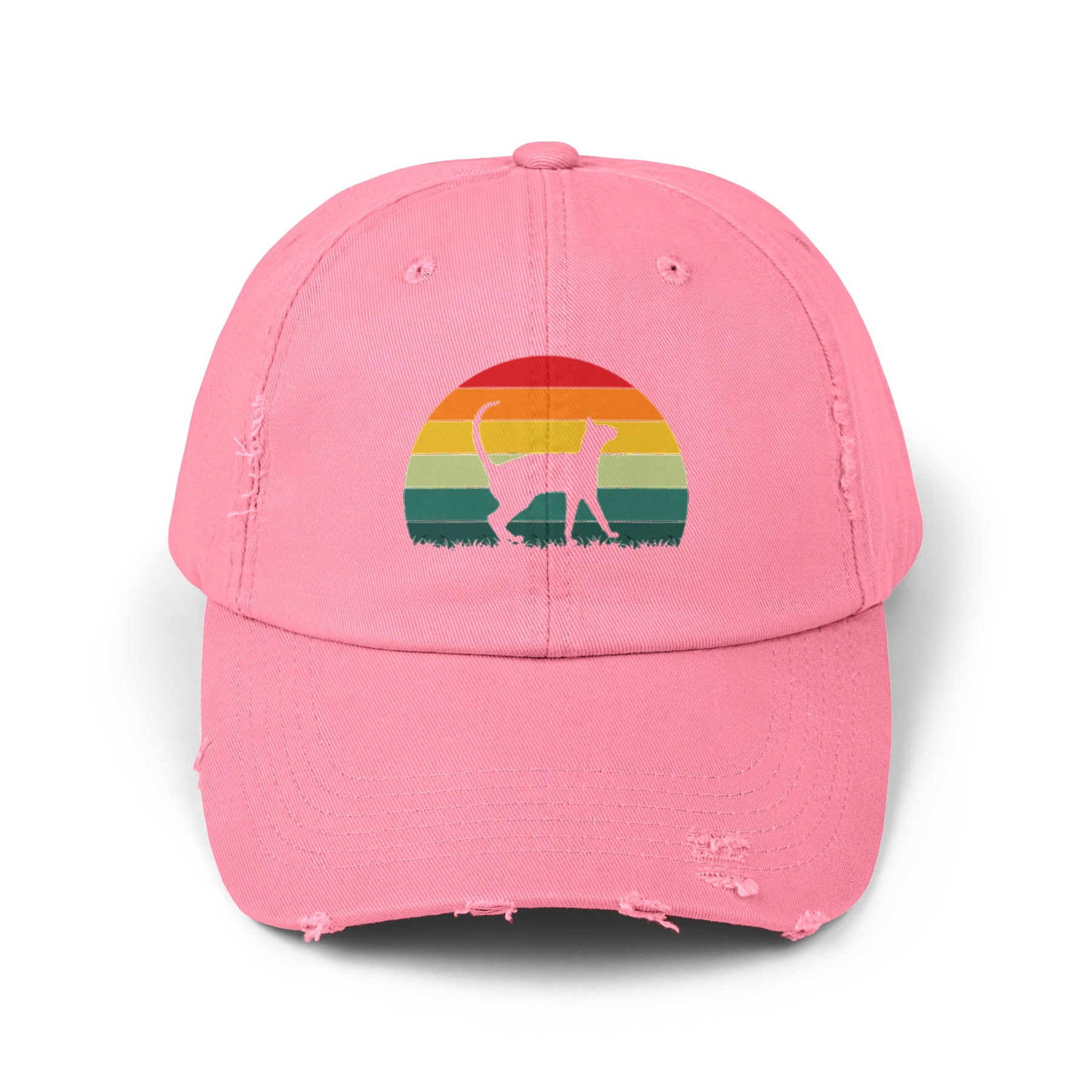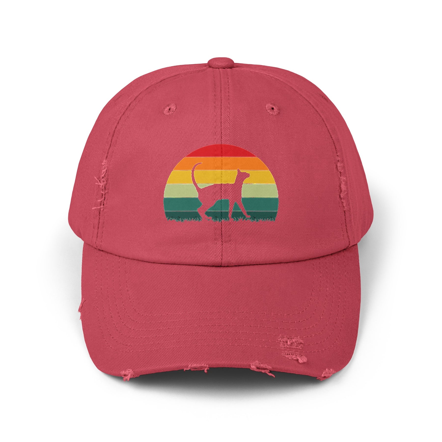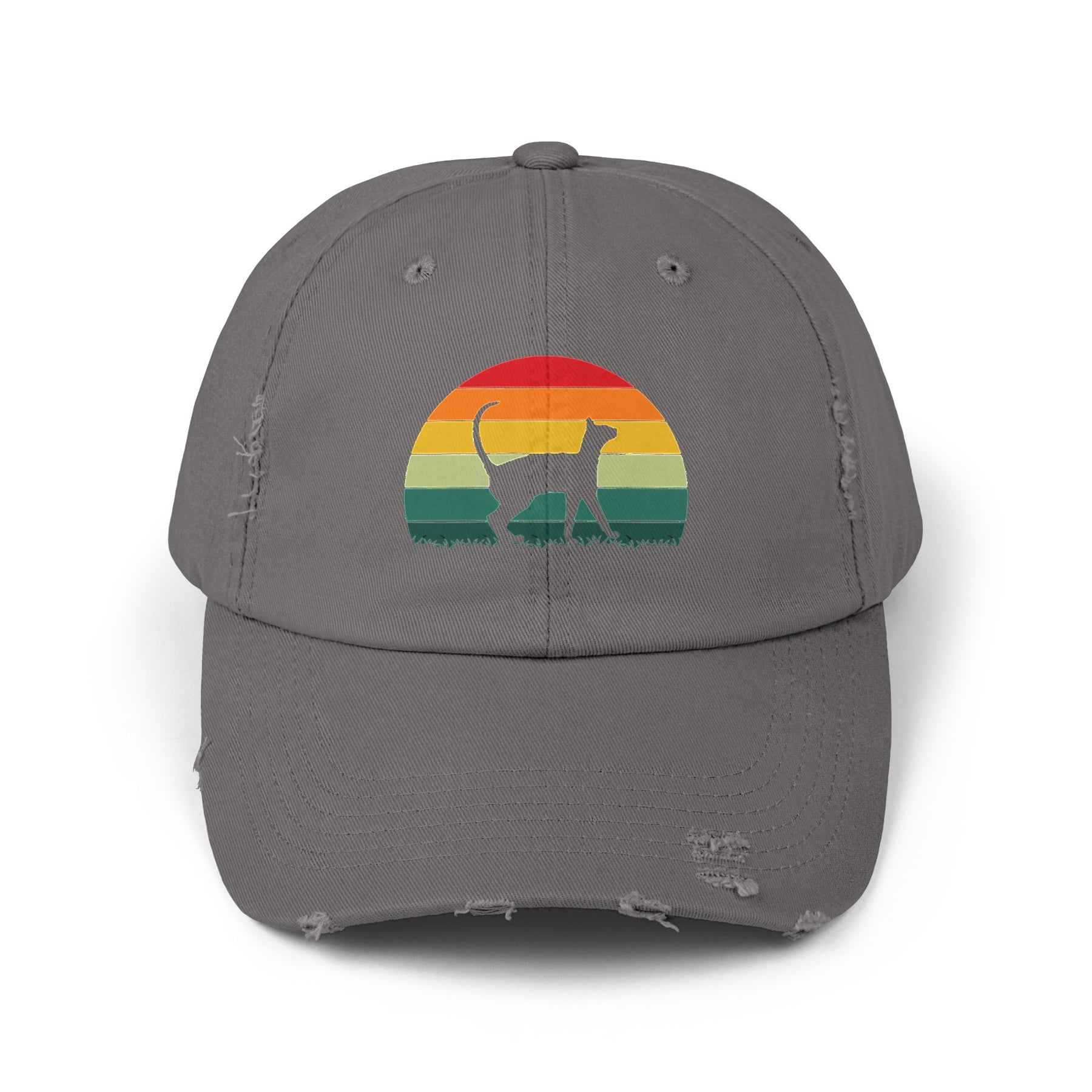 Don't miss out on this must-have accessory that combines vintage charm with a modern twist. Upgrade your outfit and show off your love for all things retro with our Sunset Cat Unisex Distressed Hat.