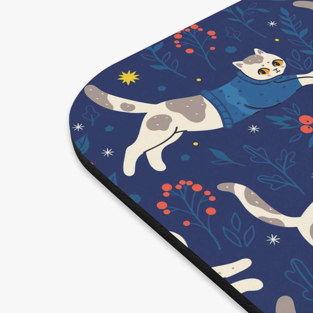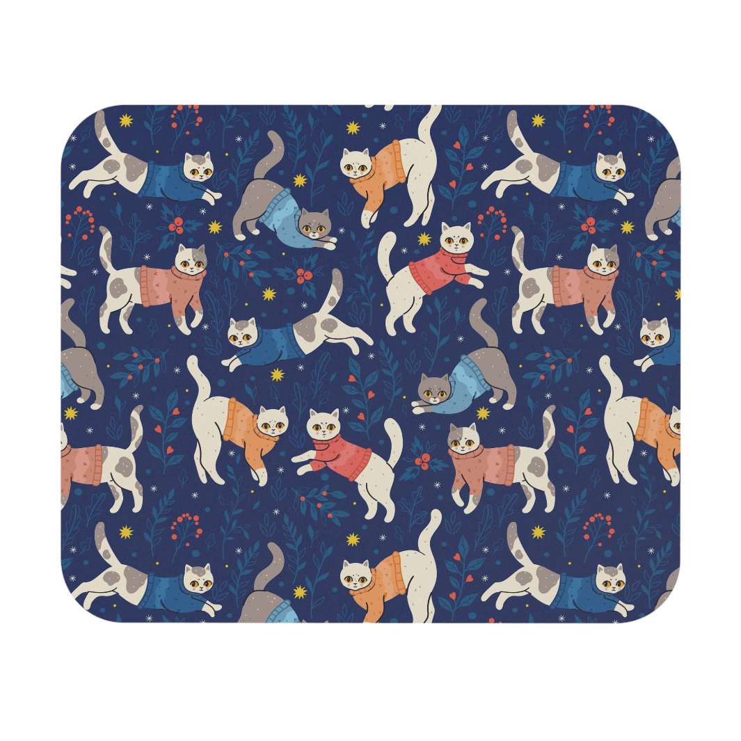 Bring a bit of adorable holiday cheer to your workspace with this Cats in Sweaters Mouse Pad. Perfect for the office or home, this vibrant mouse pad features a deep blue background with a festive design of two cartoon gray and white cats wearing sweaters, surrounded by holly leaves and berries. Invite a heartwarming feeling to your workspace while you get your work done with this cheerful mouse pad.