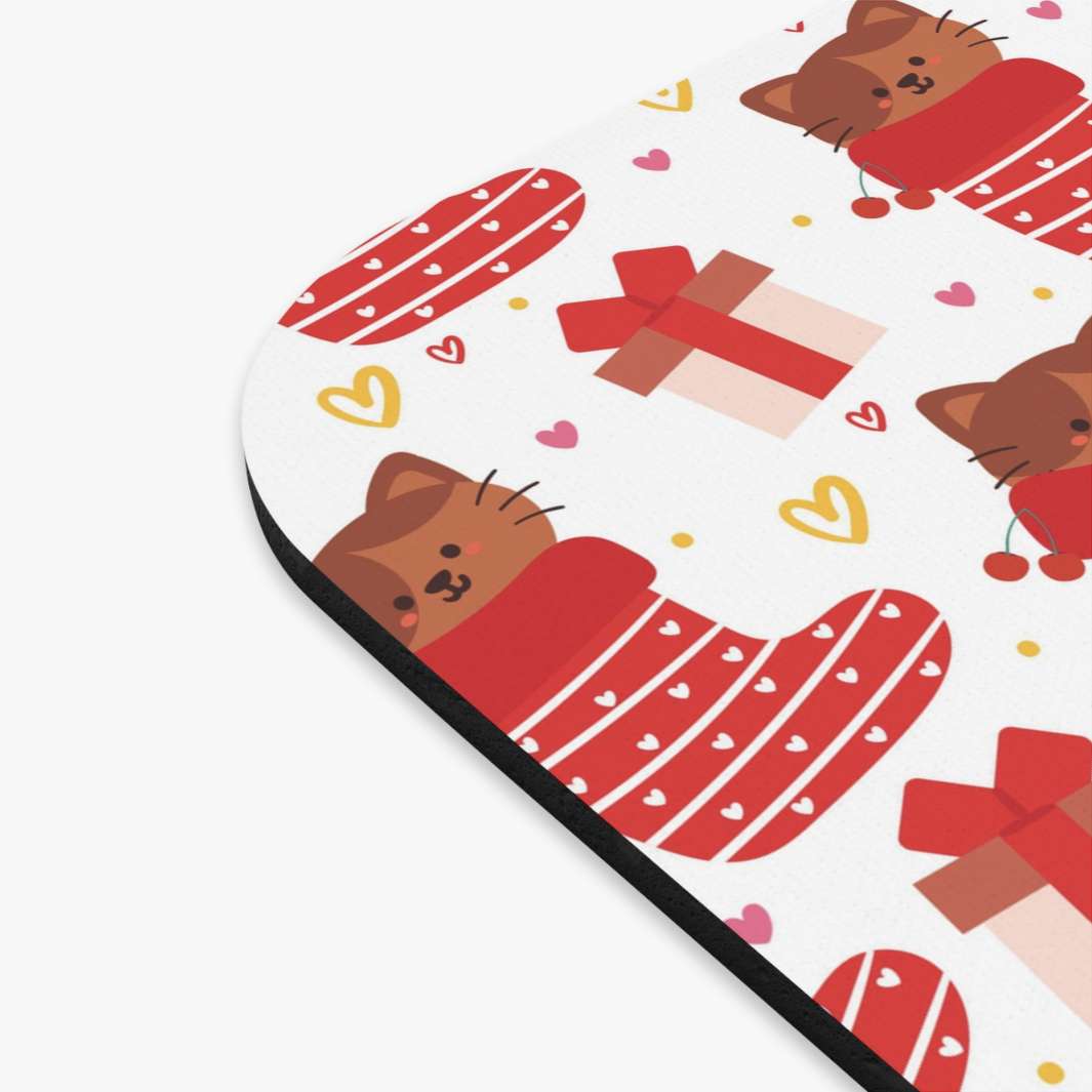 This fun, festive pad is the perfect way to keep your mouse working smoothly while spreading holiday cheer. The vibrant colors and adorable design of the white background with brown cartoon cat in a red Christmas stocking gives off a warm and happy feeling that’s perfect for the season. Pairs of wrapped presents with red bows and little hearts complete the look and will bring some holiday magic to your home or office.
