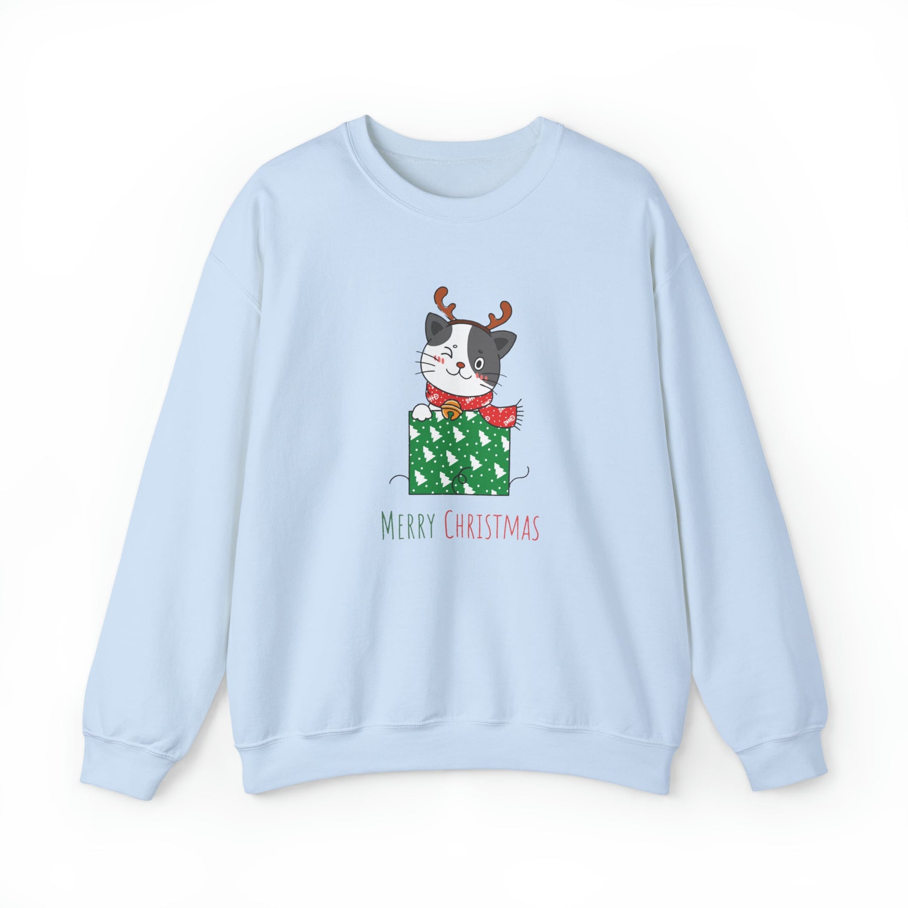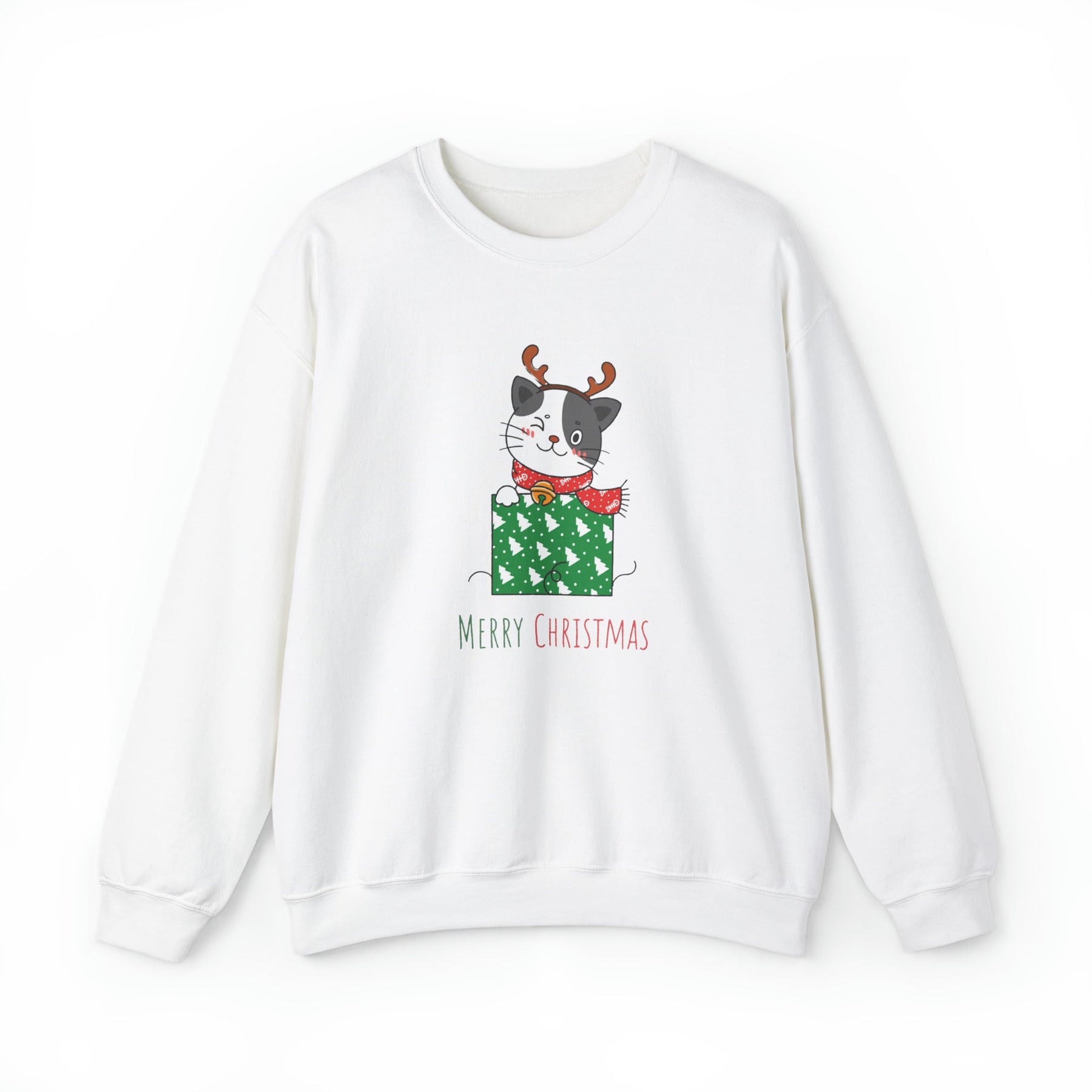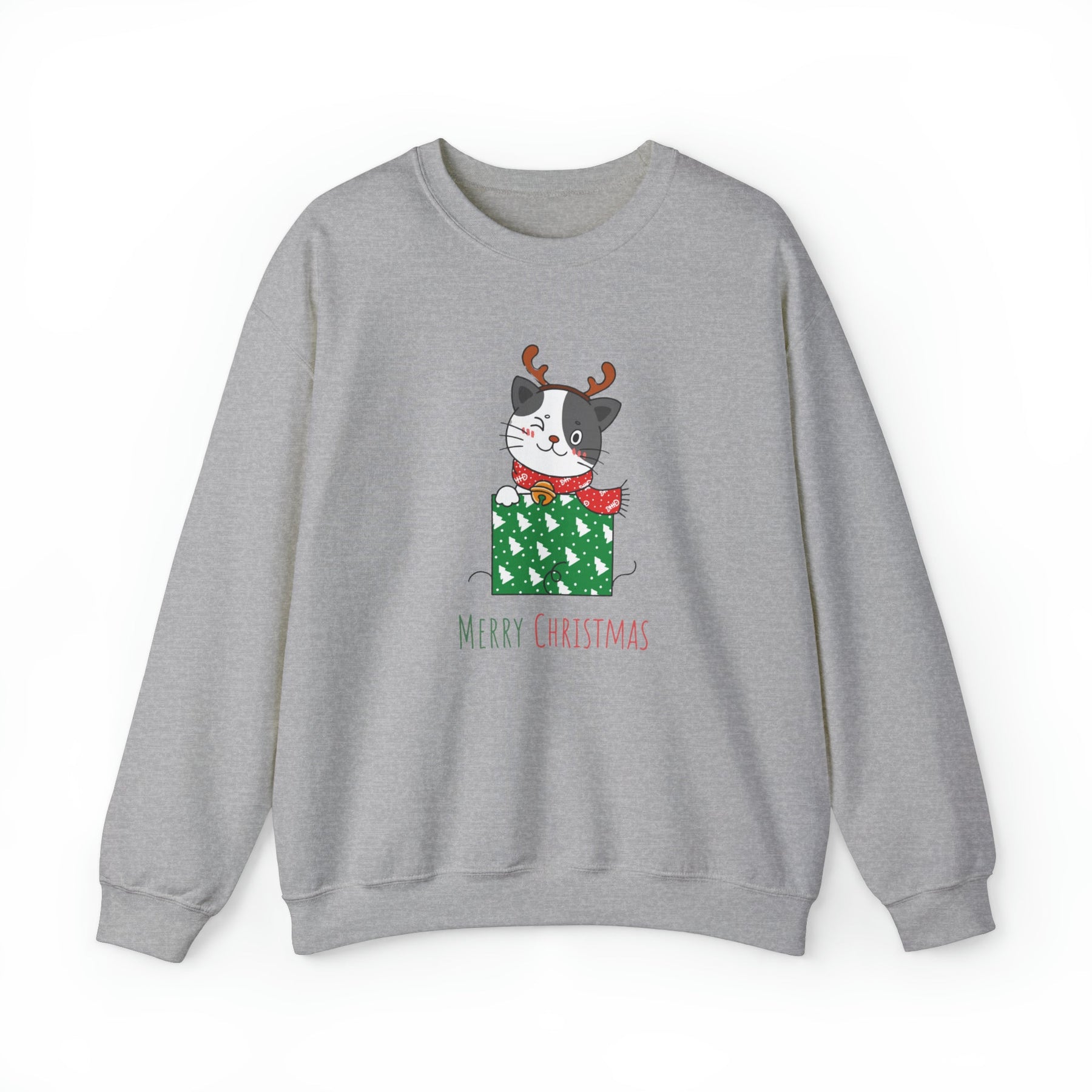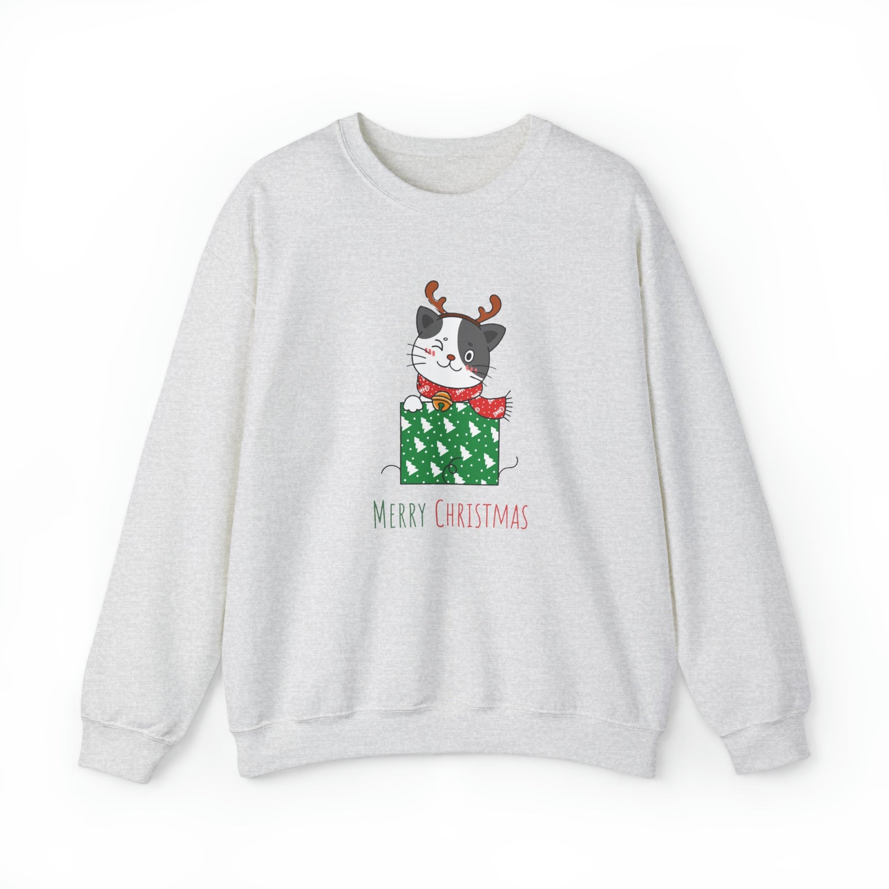 Introducing the purr-fect gift for all the cat lovers out there - the Gift Wrapped Cat Crewneck Sweatshirt! Get ready to cozy up and embrace the holiday spirit with this delightful gray and white cartoon cat. Adorned with adorable reindeer antlers, this feline friend is sitting comfortably in a wrapped box covered in vibrant green wrap, complete with enchanting white trees that add a touch of whimsy to this festive scene.