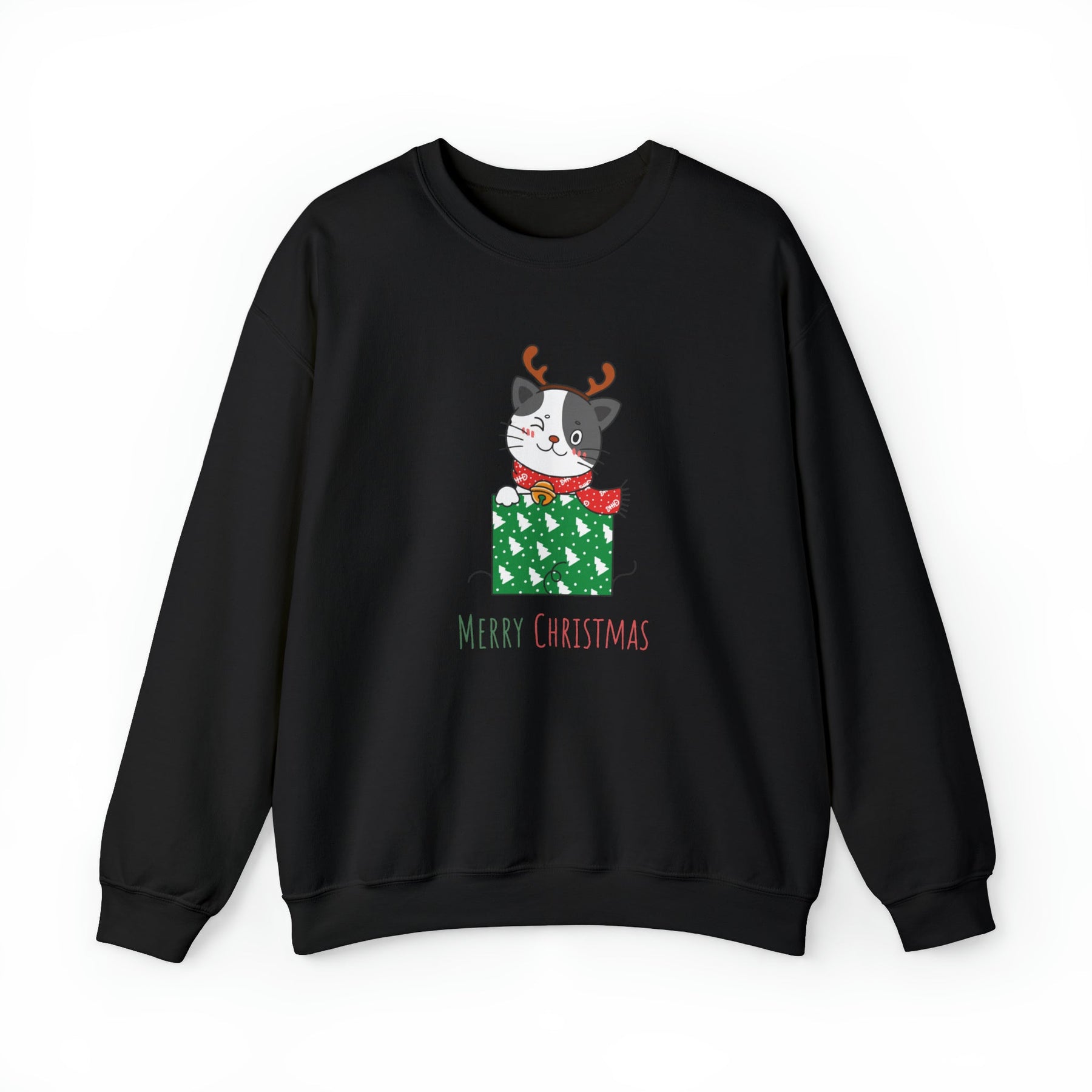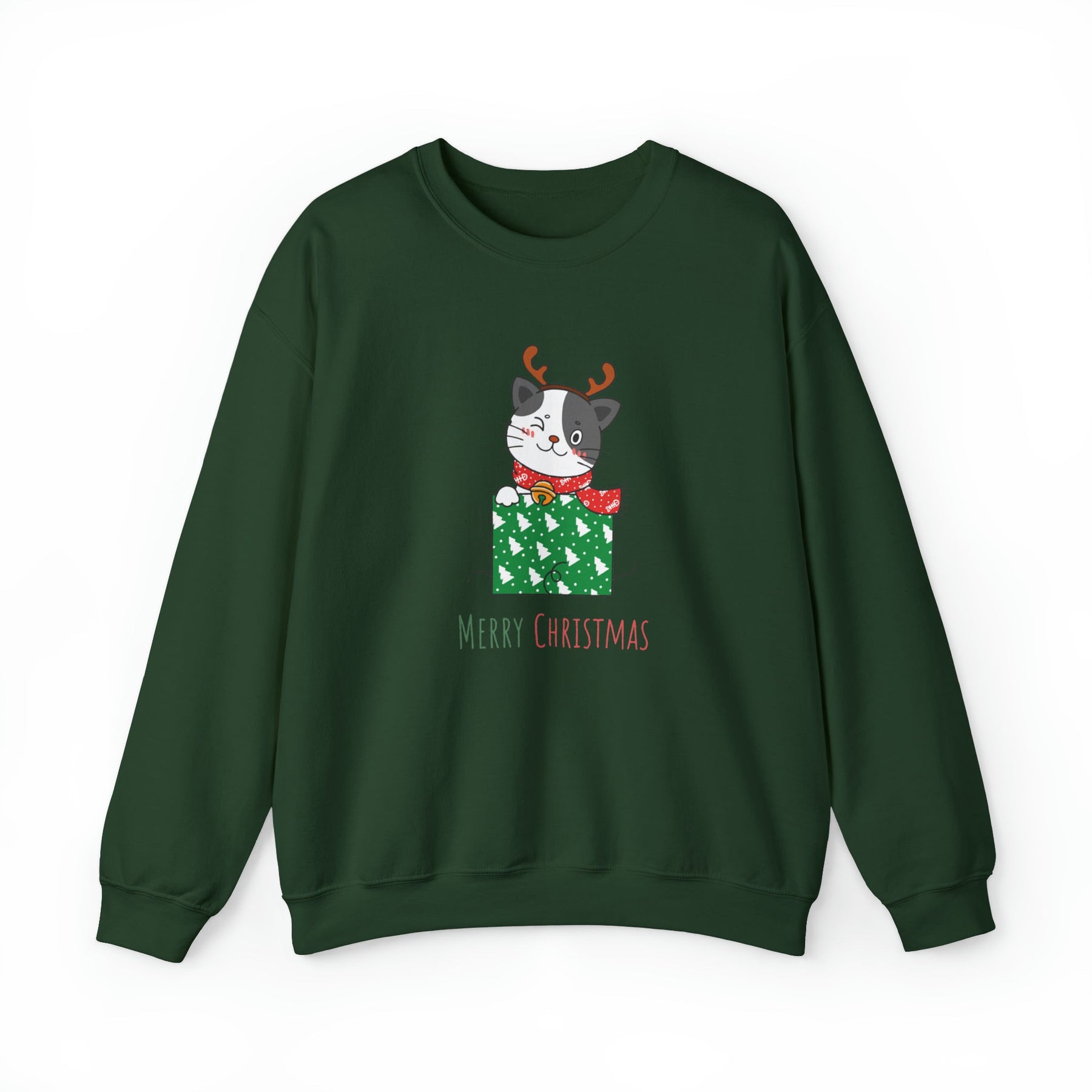 But that's not all! Our cheerful cat is dressed to impress, sporting a stylish red scarf and a majestic gold bell that will jingle all the way through the season. And to spread the holiday cheer far and wide, the sweatshirt proudly boasts the heartfelt message "Merry Christmas" right underneath this charming holiday tableau.