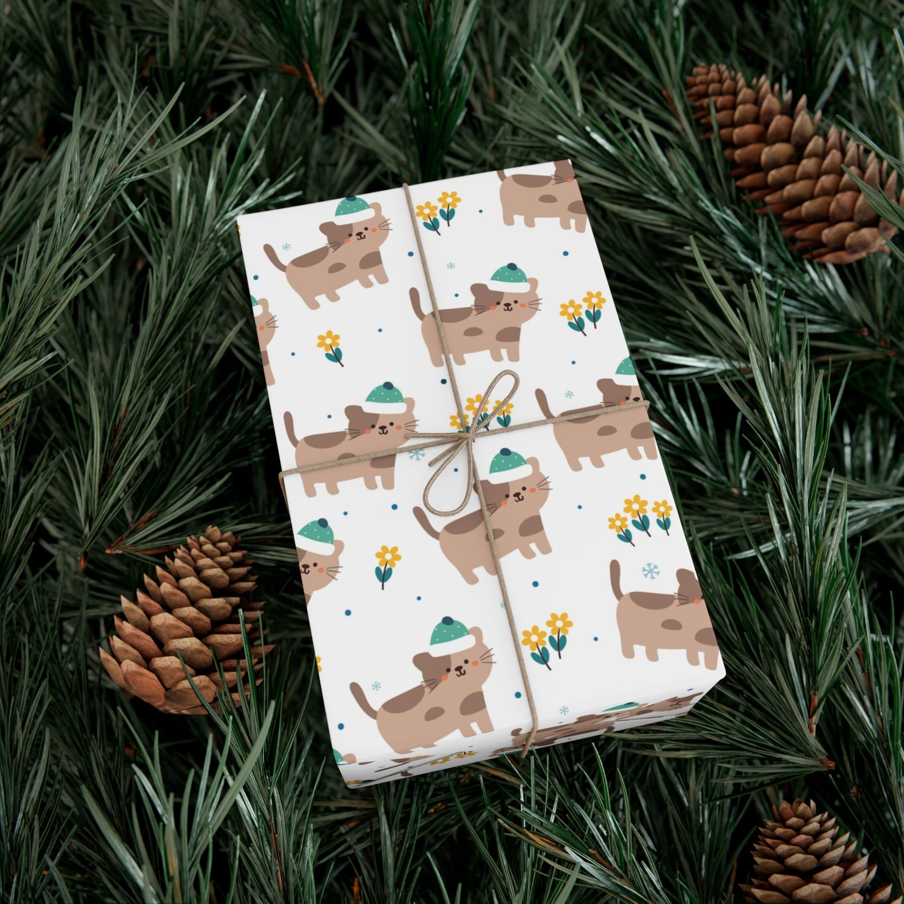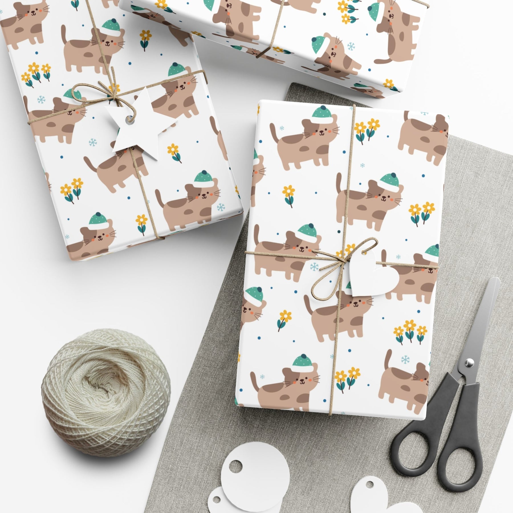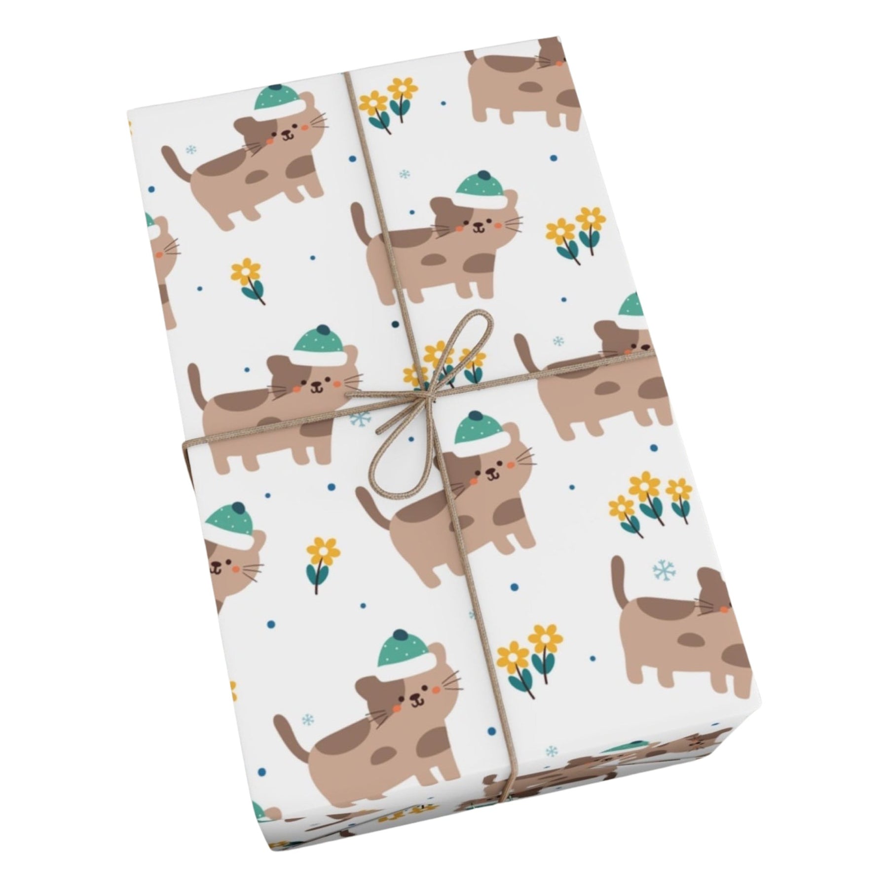 Introducing the purr-fect way to add a touch of whimsy and charm to your gift-giving season - the Stocking Hat Cat Gift Wrap! This delightful wrapping paper features a playful white background adorned with a lovable brown cartoon cat, who is proudly donning a teal stocking hat. As if that wasn't already adorable enough, the paper is also sprinkled with petite teal snowflakes, dainty polka dots, and itty-bitty yellow flowers.