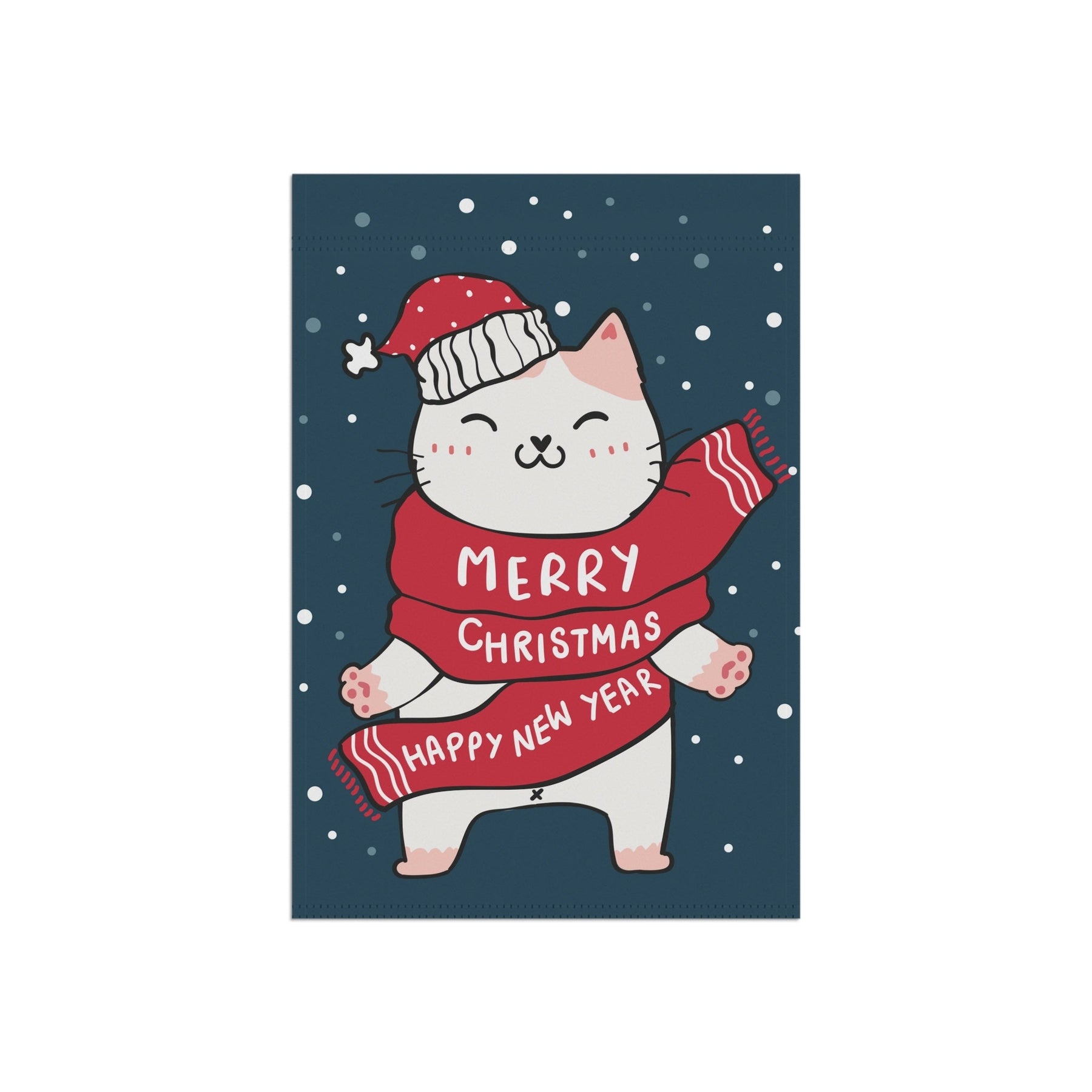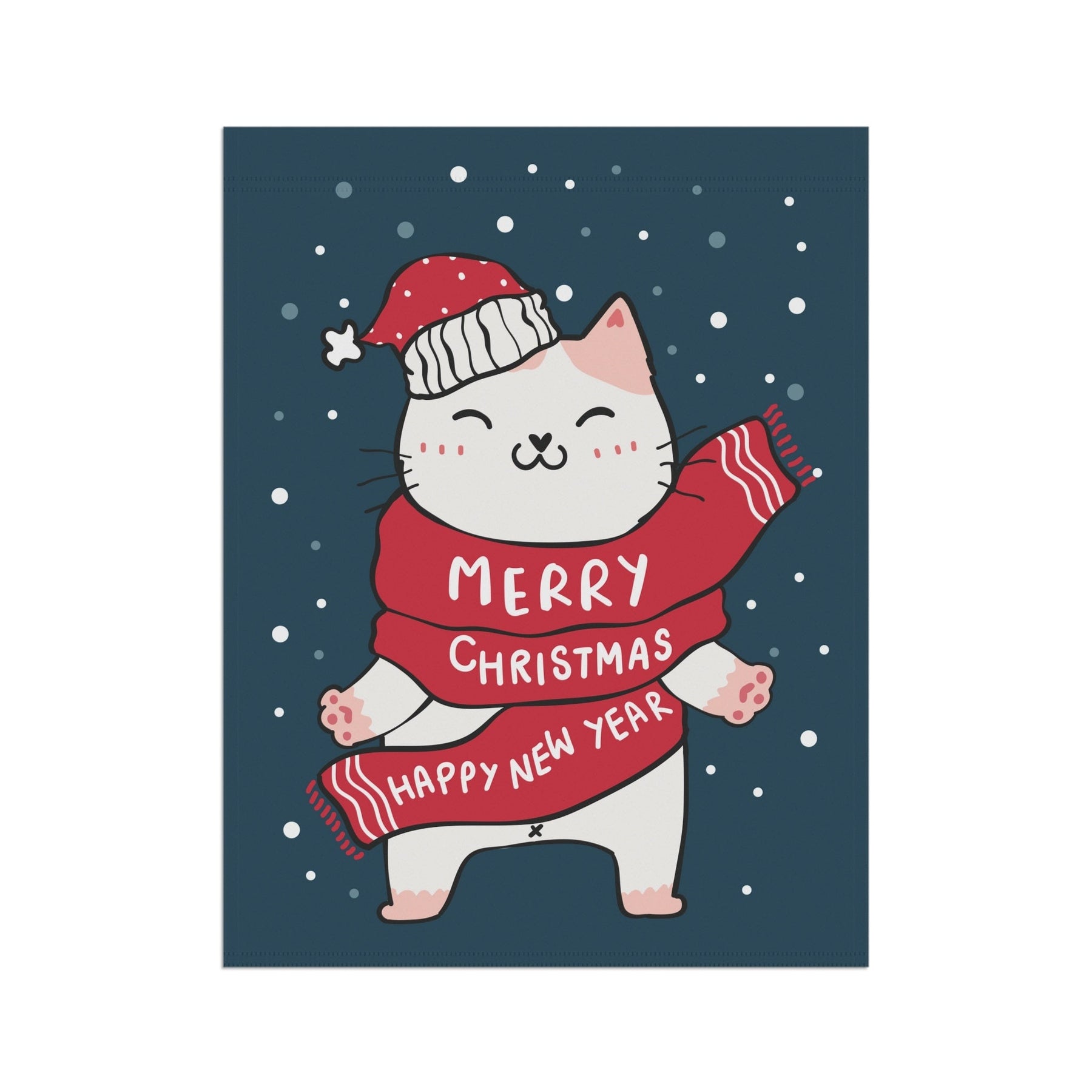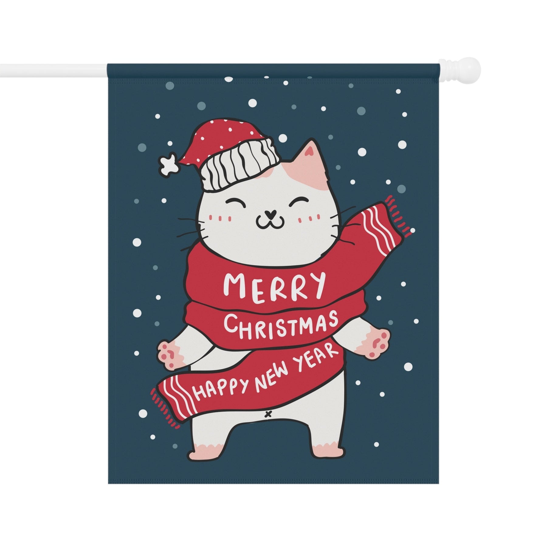 Featuring a vibrant blue background, our banner showcases a whimsical white cartoon cat wearing a red scarf that proudly displays the message "Merry Christmas and Happy New Year." With a red Santa hat perched upon its head, this adorable feline is ready to join in on the holiday festivities.