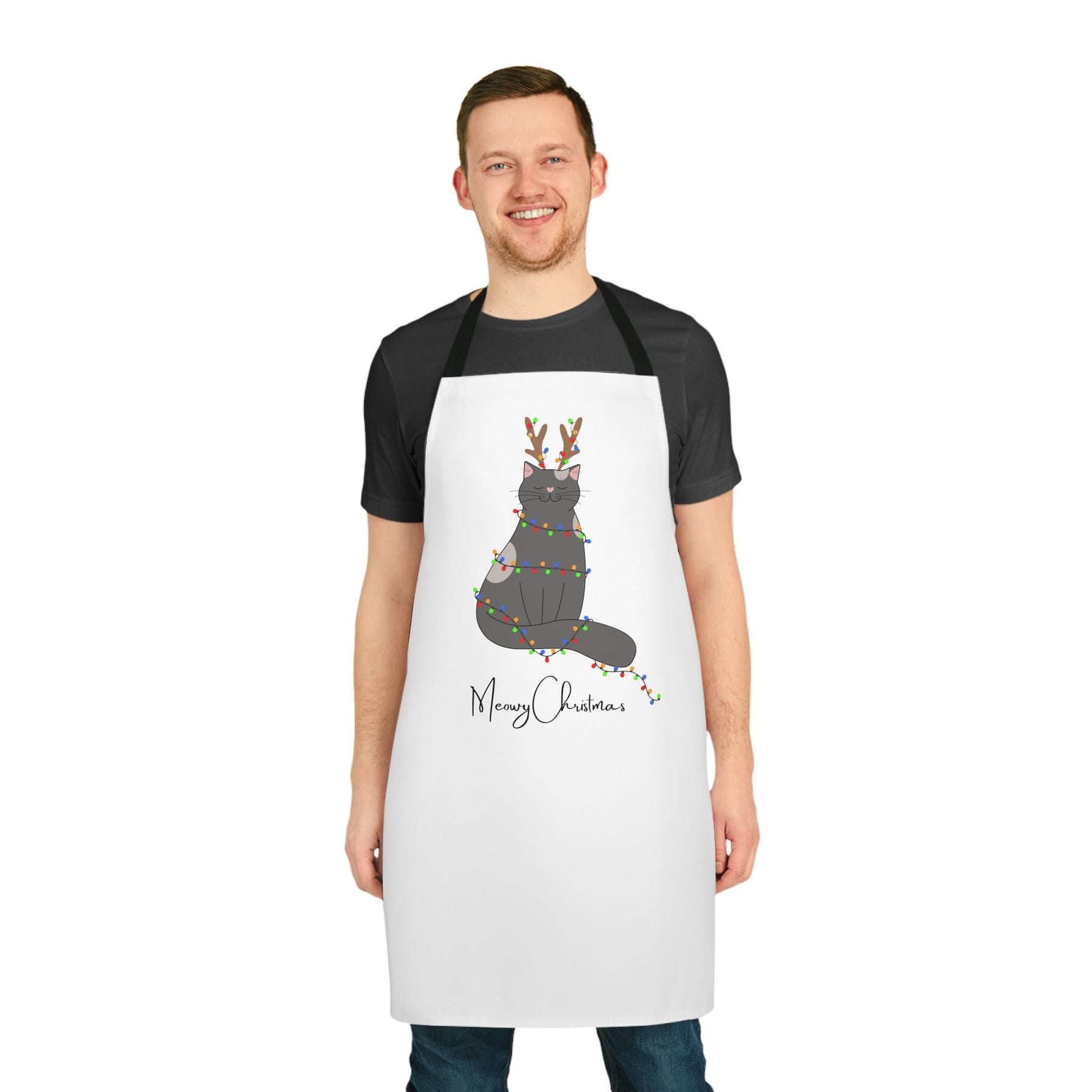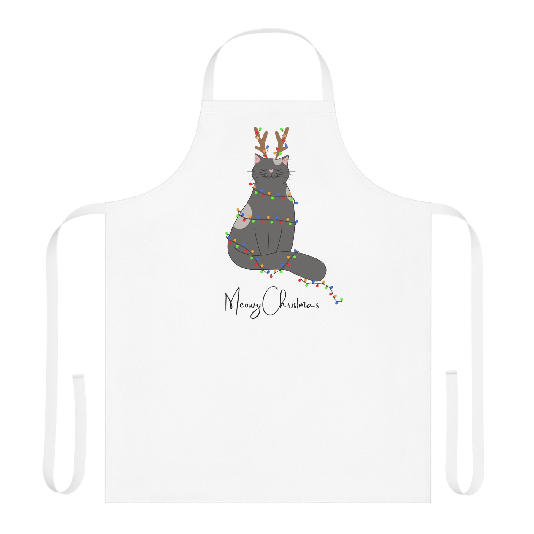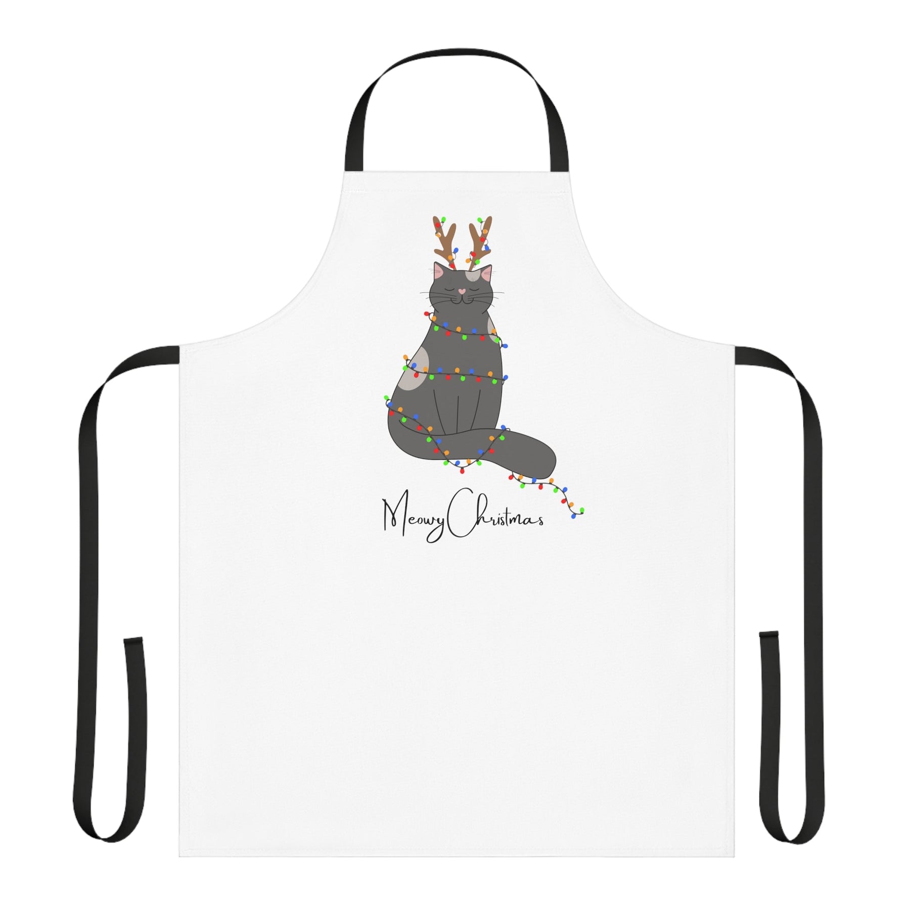 This isn't just any ordinary apron, folks. Oh no, this apron is a real game-changer. Picture a crisp white background that reminds you of freshly fallen snow on a winter morning. Now, let's amp up the cuteness factor with a mischievous cartoon cat dressed up as a reindeer, complete with adorable antlers that are sure to make even Rudolph jealous!