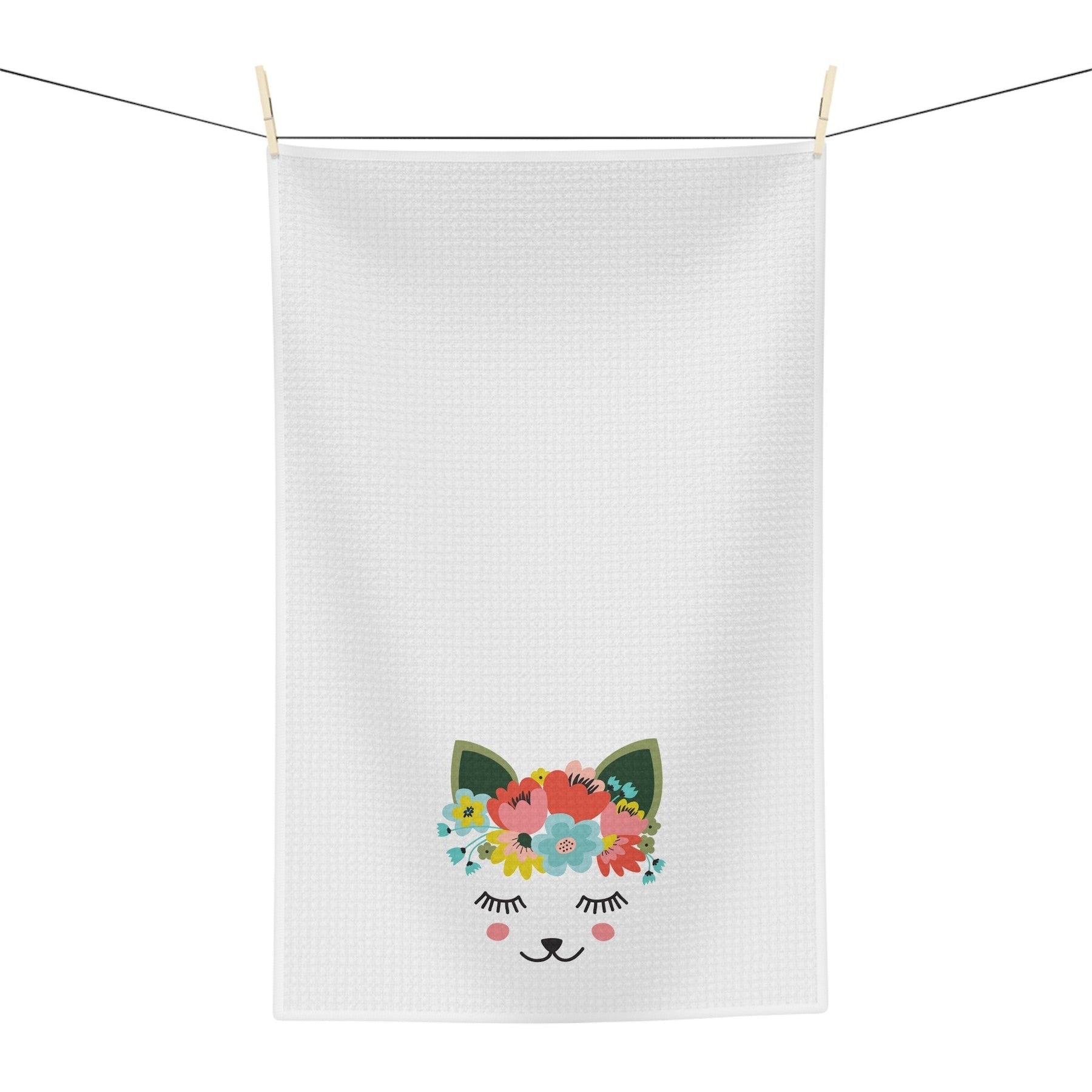 Bring an air of beauty and serenity to your kitchen with the Floral Kitty Tea Towel. It features a peaceful, serene illustration of a cat's head with bright and colorfully woven floral crown in muted pastel shades. The white background gives an ethereal look and feel to this versatile tea towel.