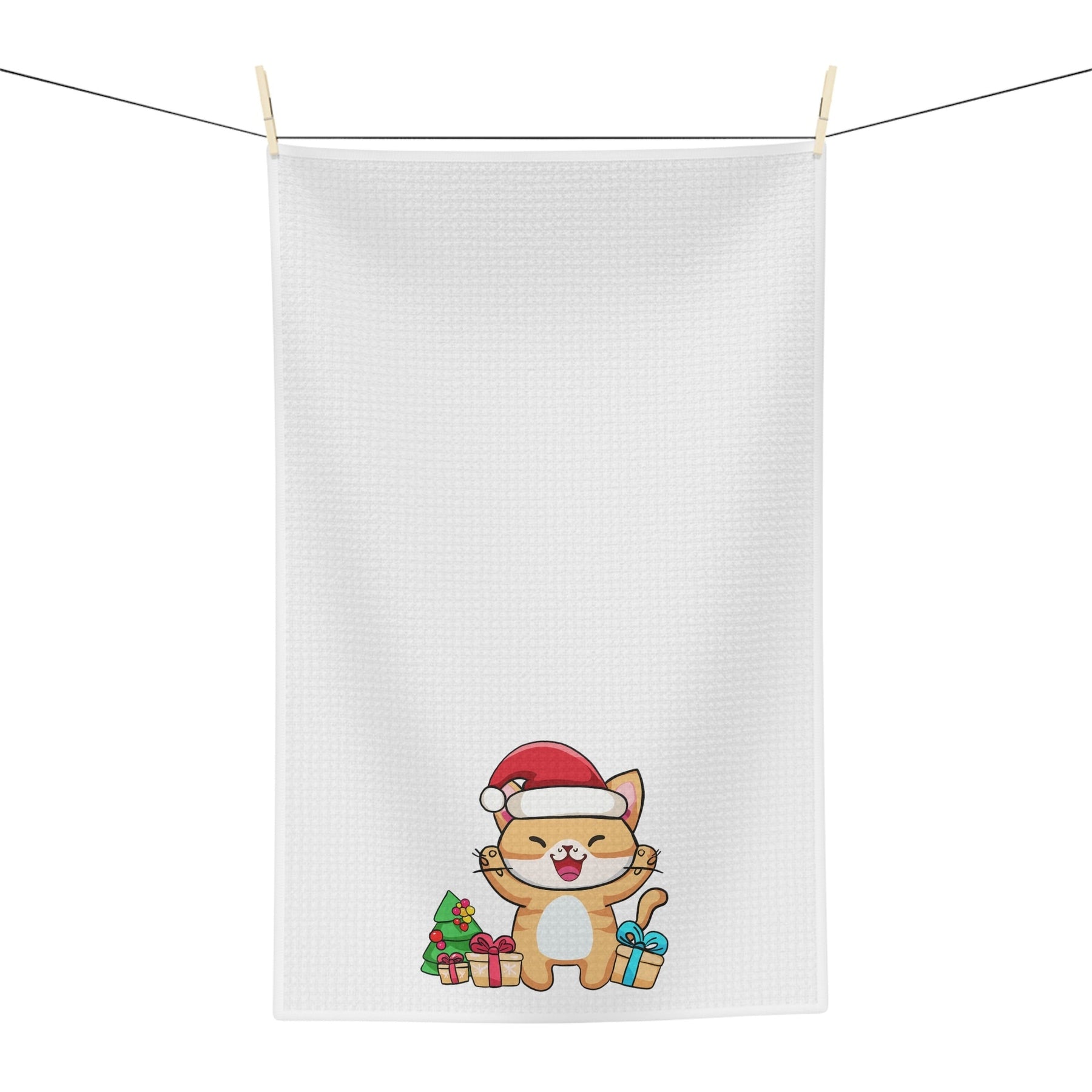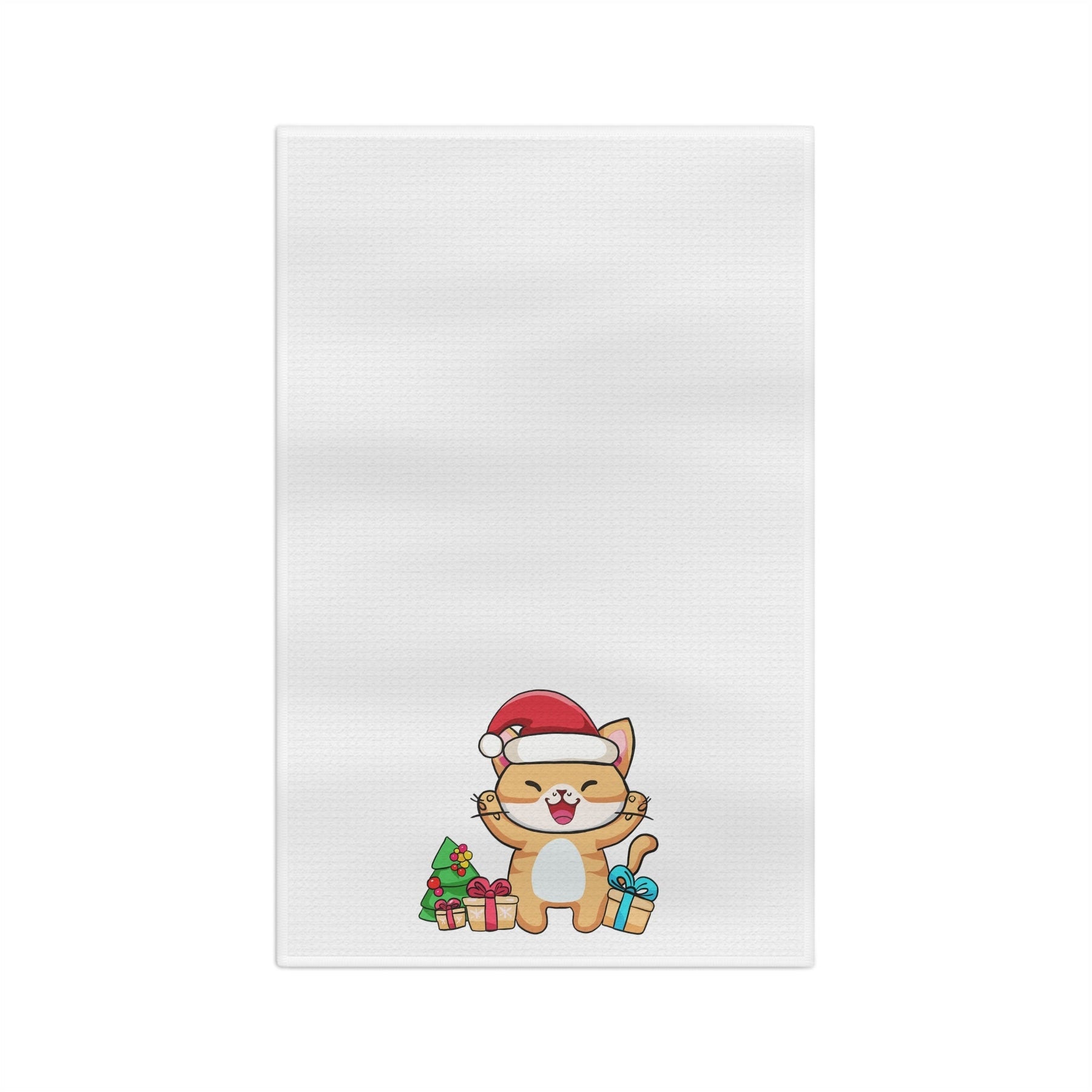 Welcome the festivity of the holiday season with the uplifting presence of the Happy Santa Cat Tea Towel! Perfect to spruce up your kitchen for the holidays, this festive design features a white background, contrasted by a tan cartoon cat dressed up in a Santa hat, arm raised in celebration of the joyous occasion - a Christmas tree and packages imparting a merry holiday mood.
