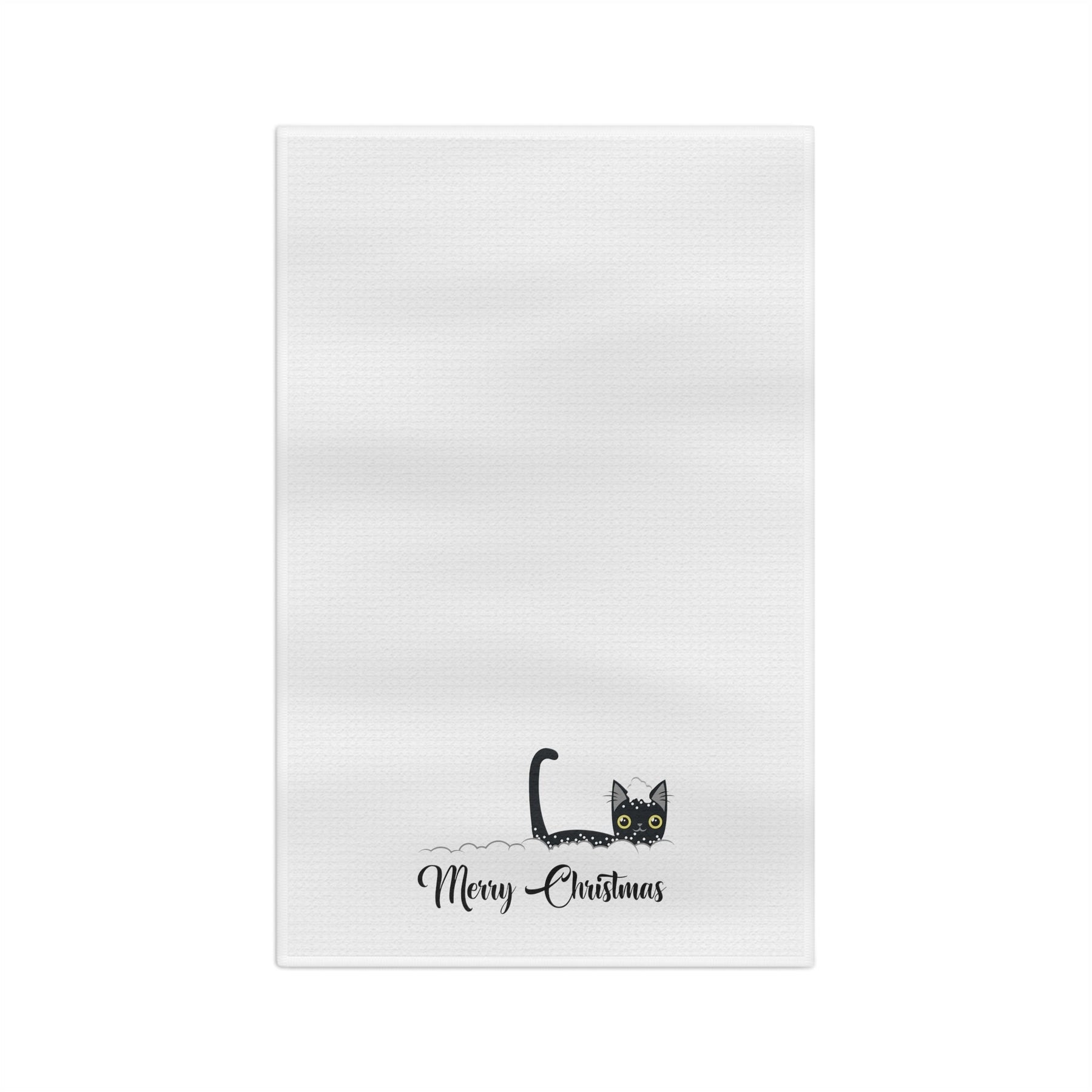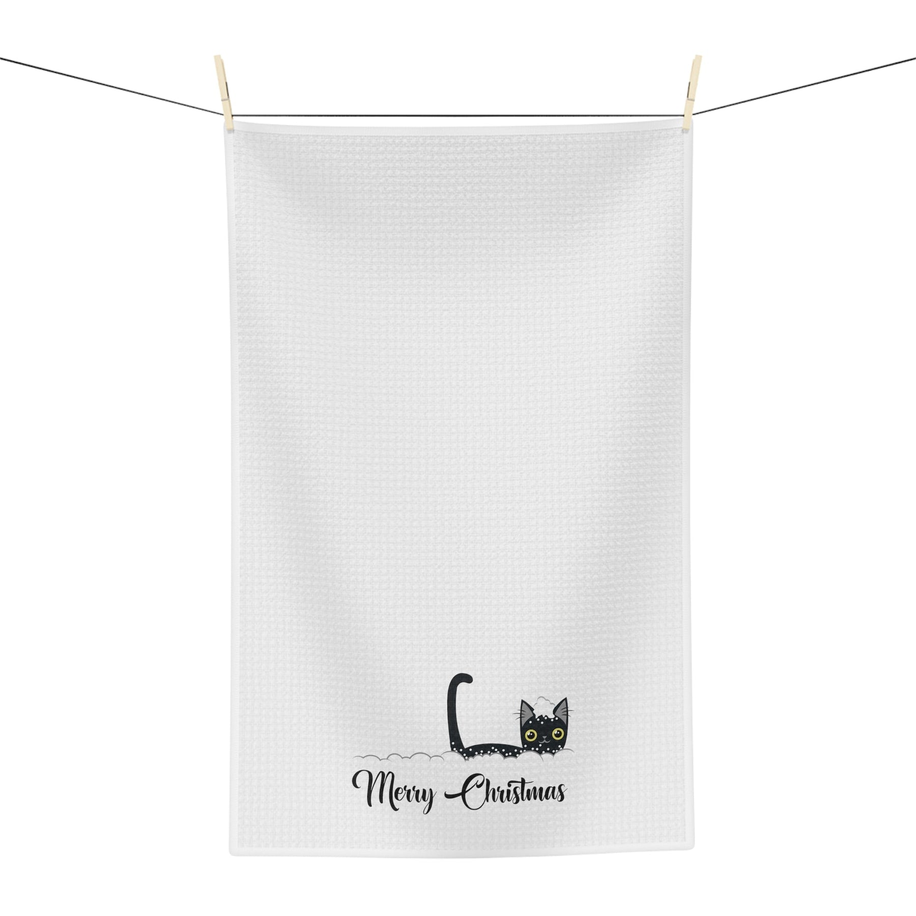 Featuring a classic holiday scene, this tea towel showcases an irresistibly cute black cartoon cat happily nestled in a snow-filled bank. The background and text elegantly read "Merry Christmas," completing the ultimate festive look. But the magic doesn't stop there! The towel itself is made of a soft and lightweight white fabric, making it an absolute dream to dry dishes or wipe down counters. It's so cozy, you'll want to snuggle up with it by the fireplace!