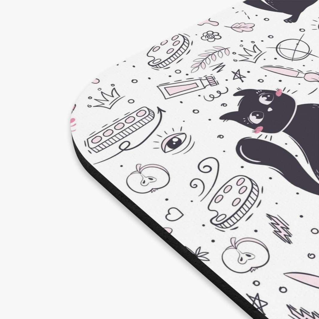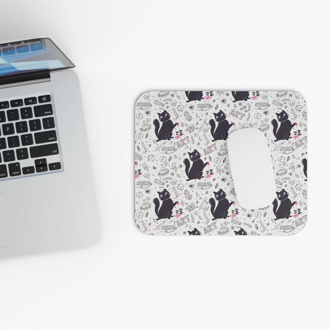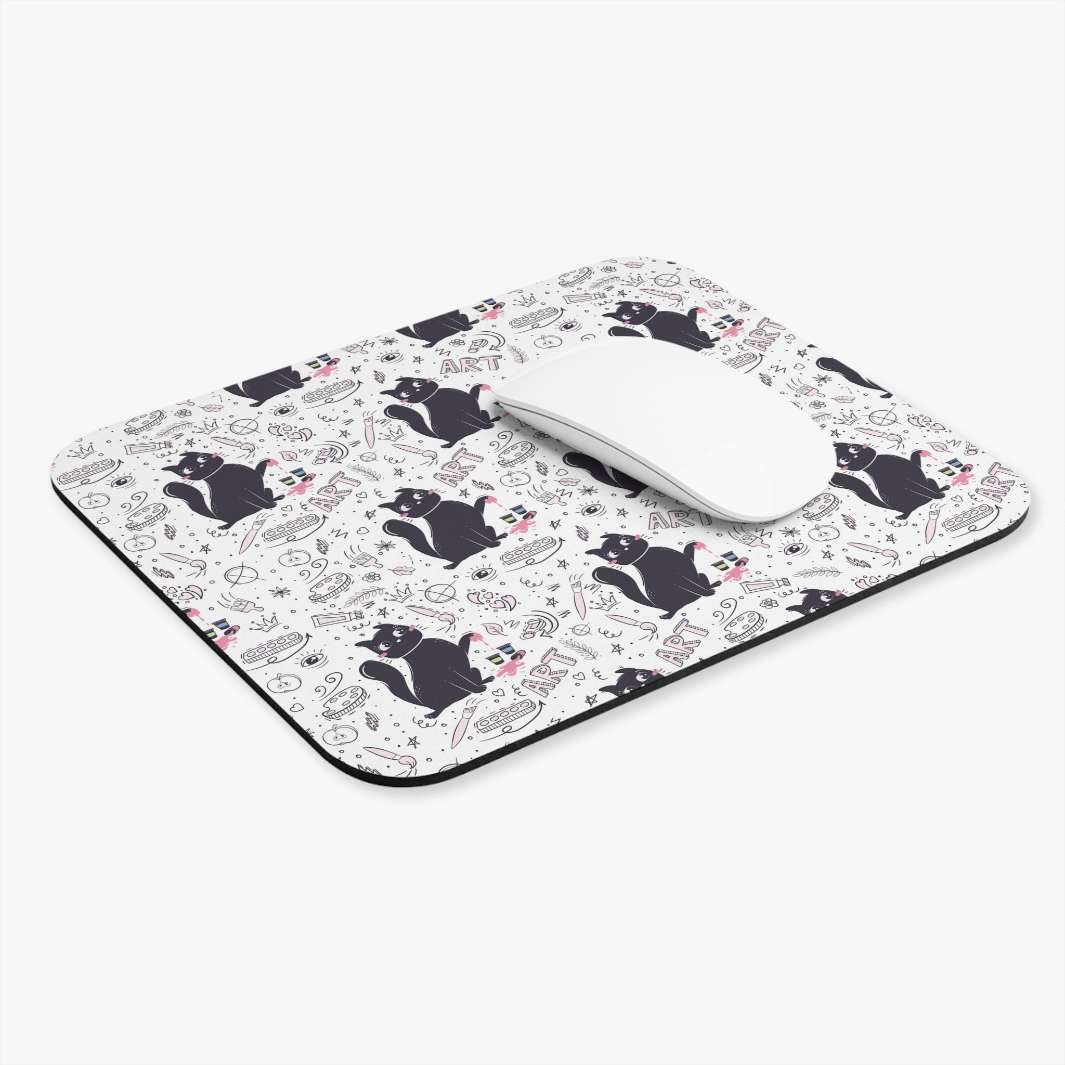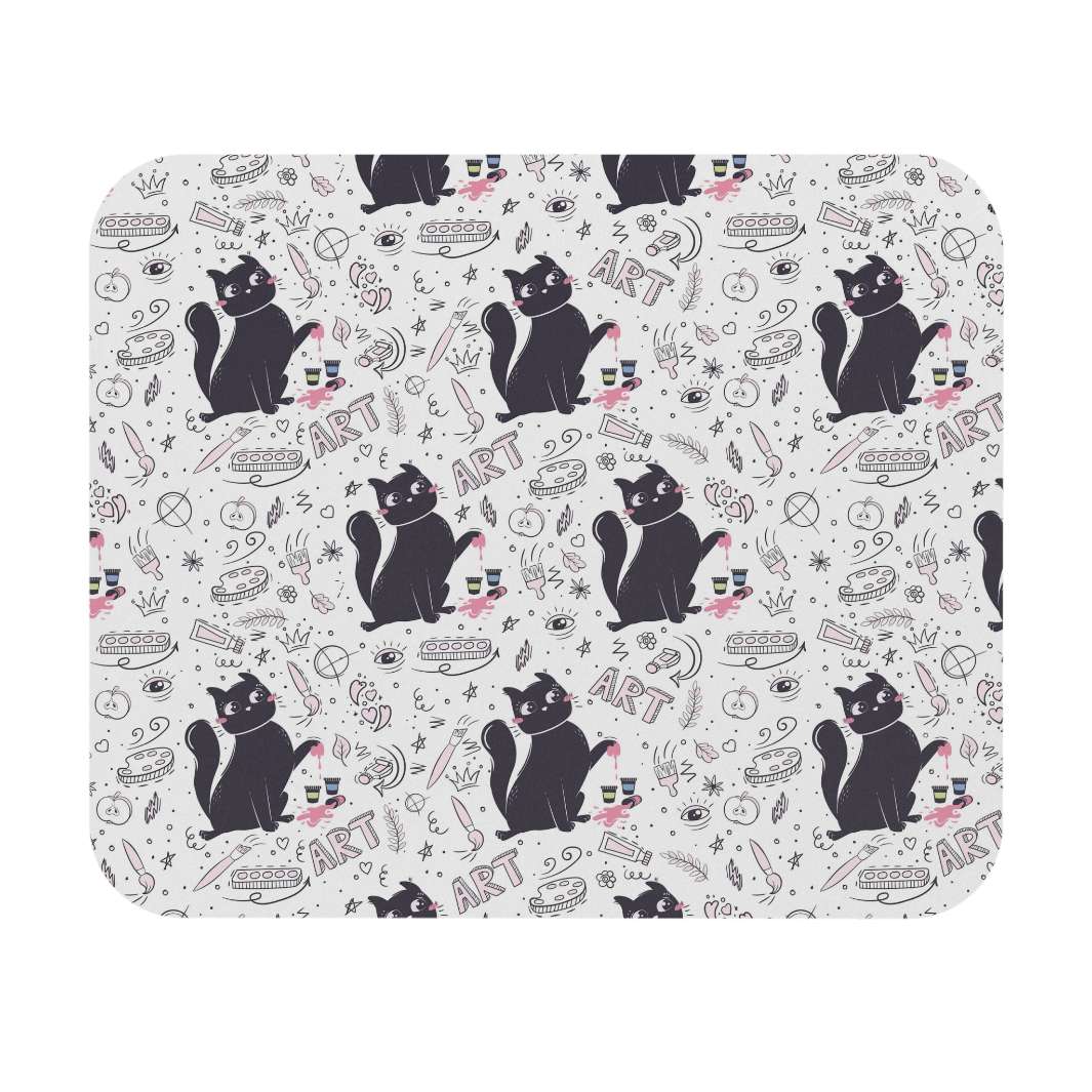 Adorned with a sweet cartoon black cat, this mousepad is perfect for cat lovers. Imagining that the cat is in the middle of a painting session, the white background is surrounded by classic, paint-filled art supplies like a paintbrush, paint palette, and paint tubes – plus the word “Art” right in the middle. This cute graphic and classic design lend a timeless quality to your work space.