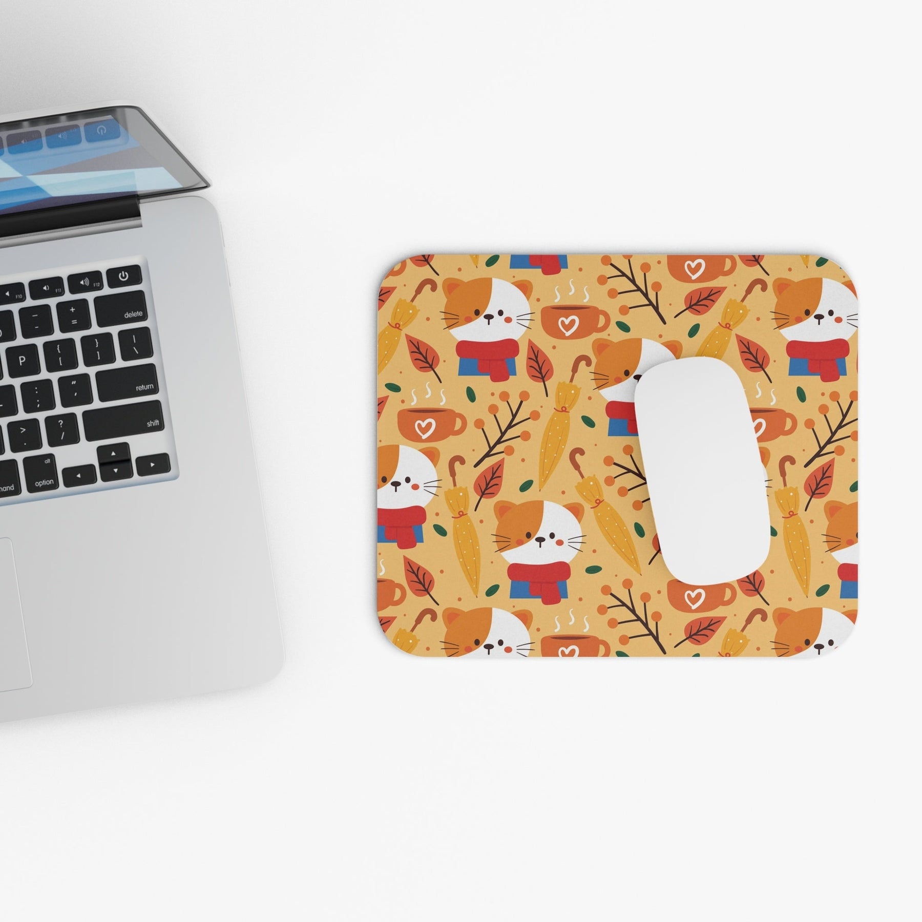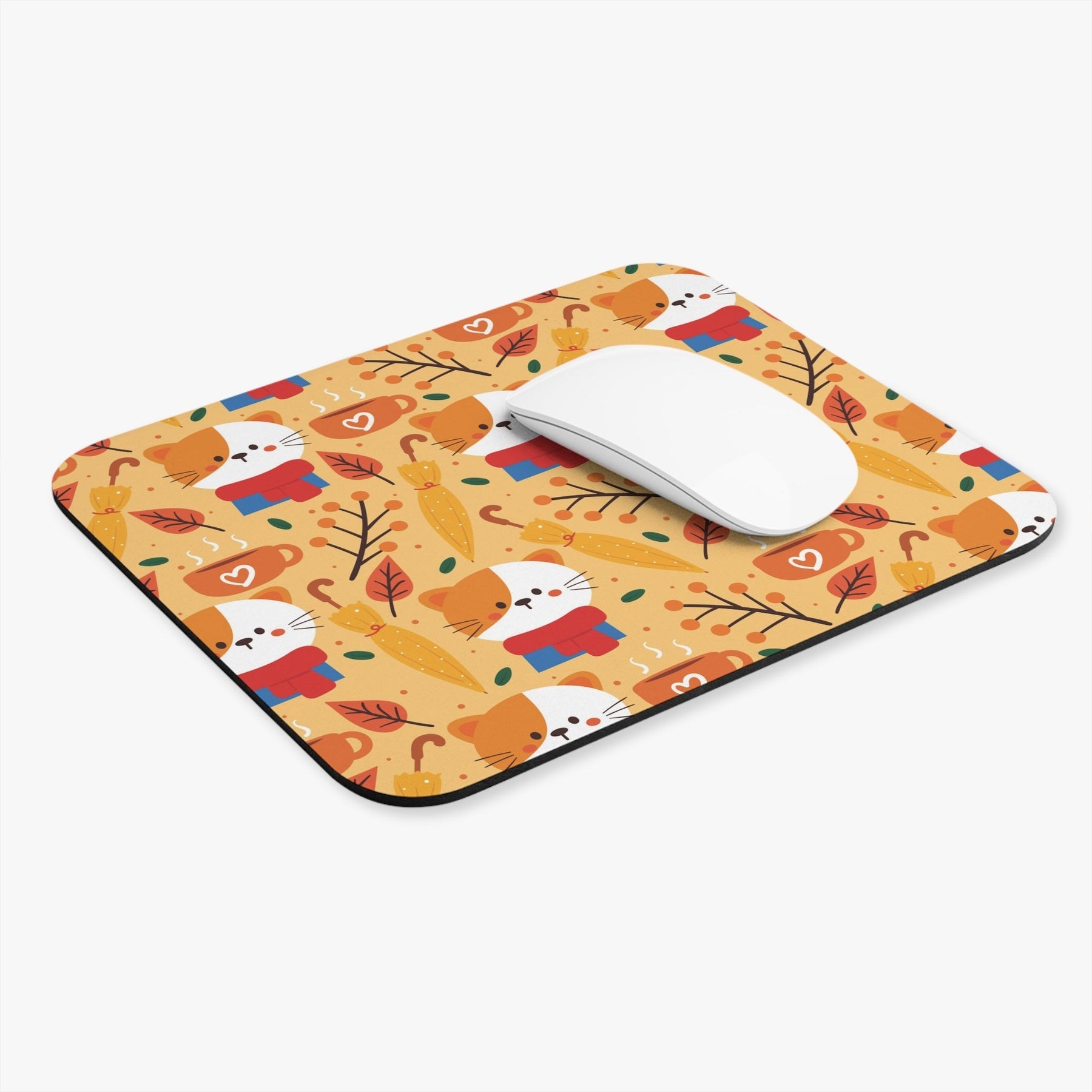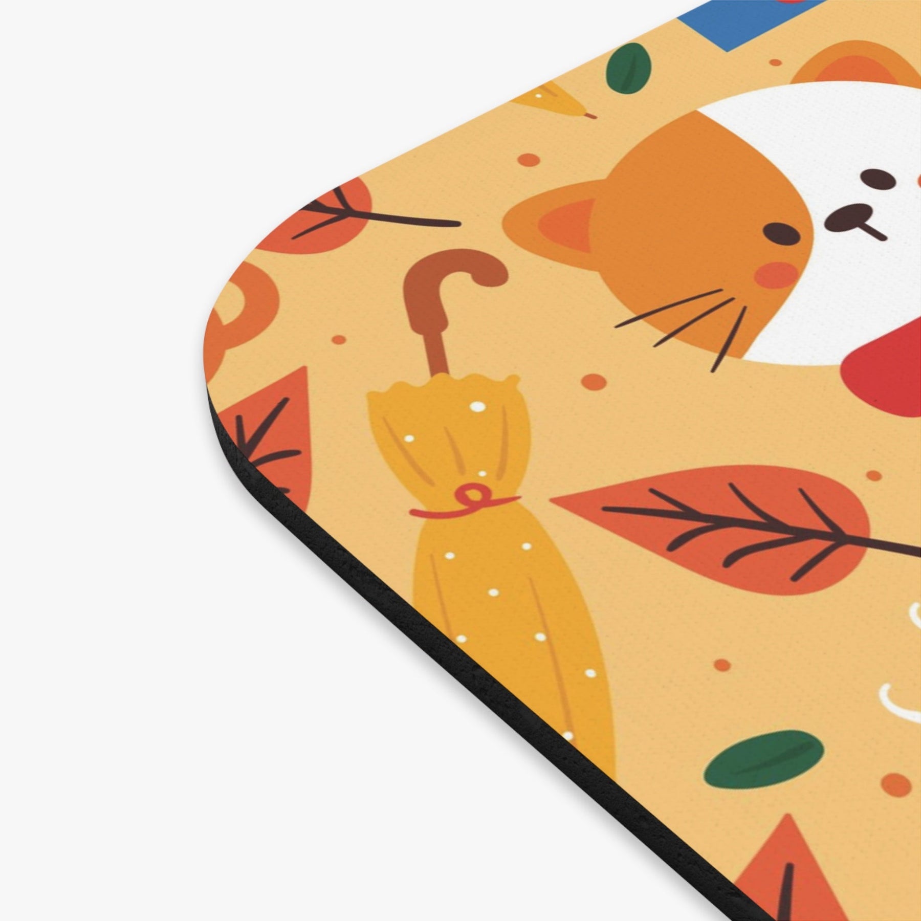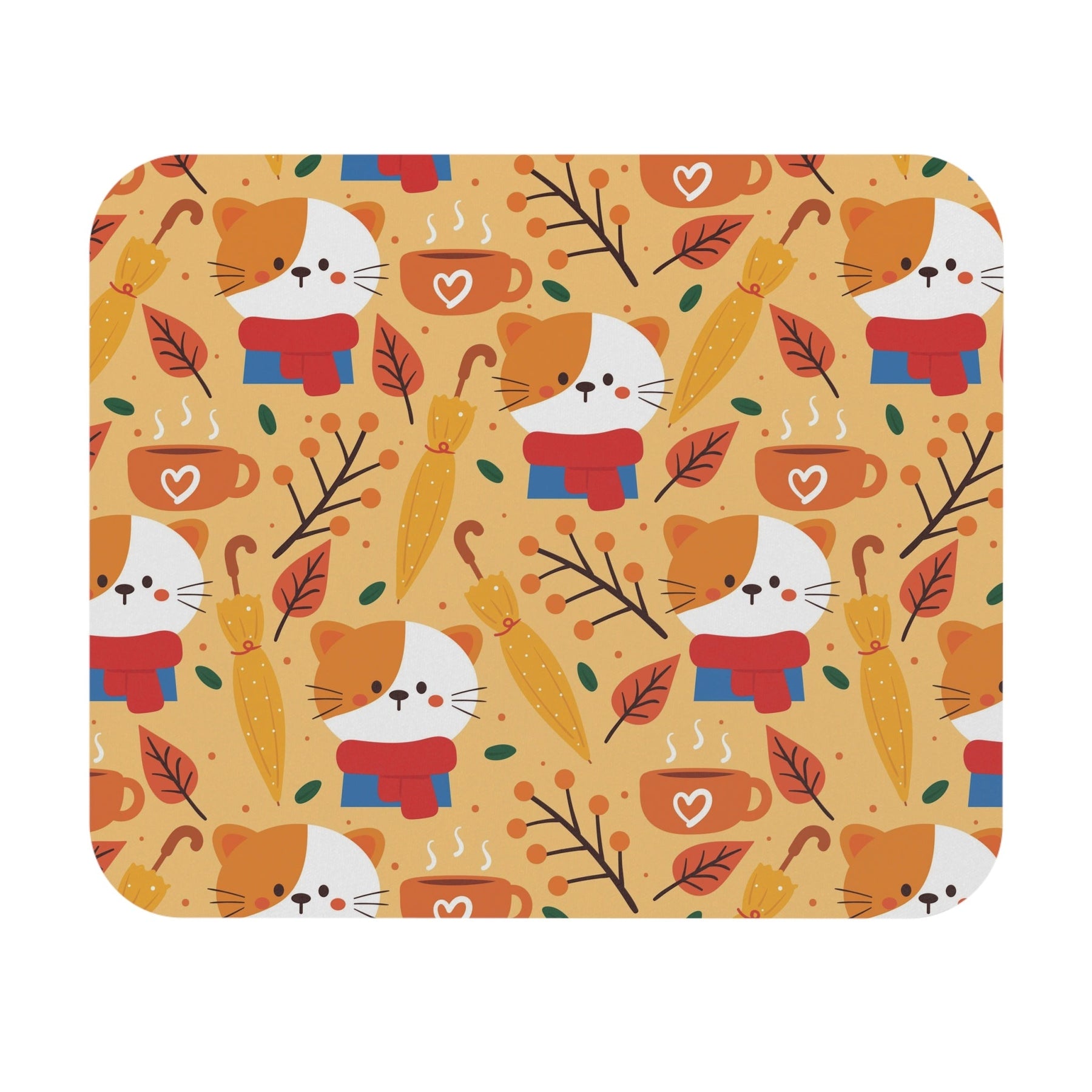 Why not enjoy the beauty of a cozy fall afternoon all year round? The Cozy Fall Cat Mouse Pad features a golden yellow background to bring a warm and sun-kissed glow to your day. An adorable cartoon cat wearing a blue sweater and a red scarf is the main attraction, and you’ll be delighted to find cute yellow closed umbrellas, fall leaves, and orange coffee cups with white hearts for added charm.