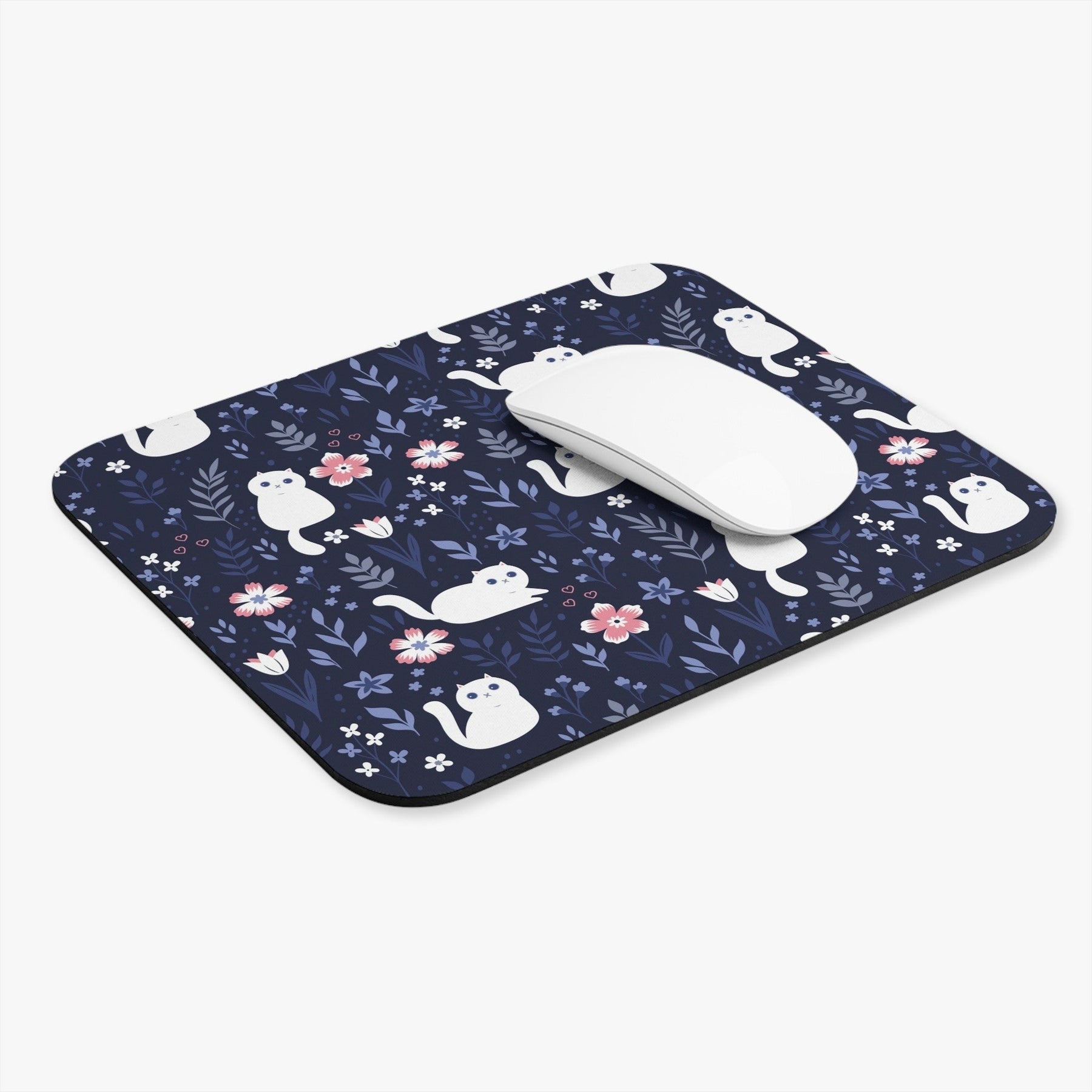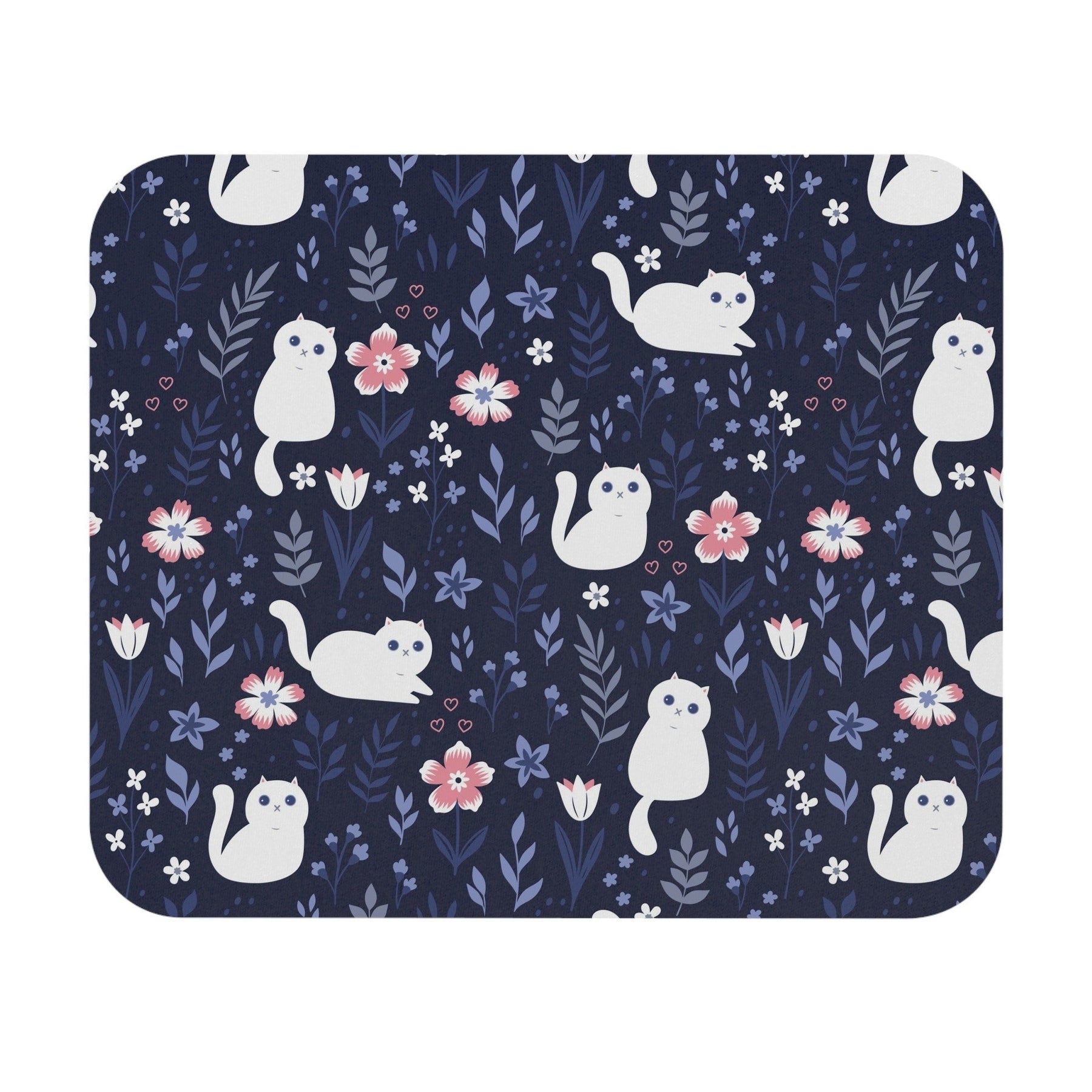 Indulge in a whimsical world of feline charm with our enchanting Folk Art Kitty Mouse Pad! This delightful accessory is tailor-made for cat lovers and cat owners alike, adorned with a navy blue background that sets the stage for the starring character - a white cartoon cat that brings folk art to life!