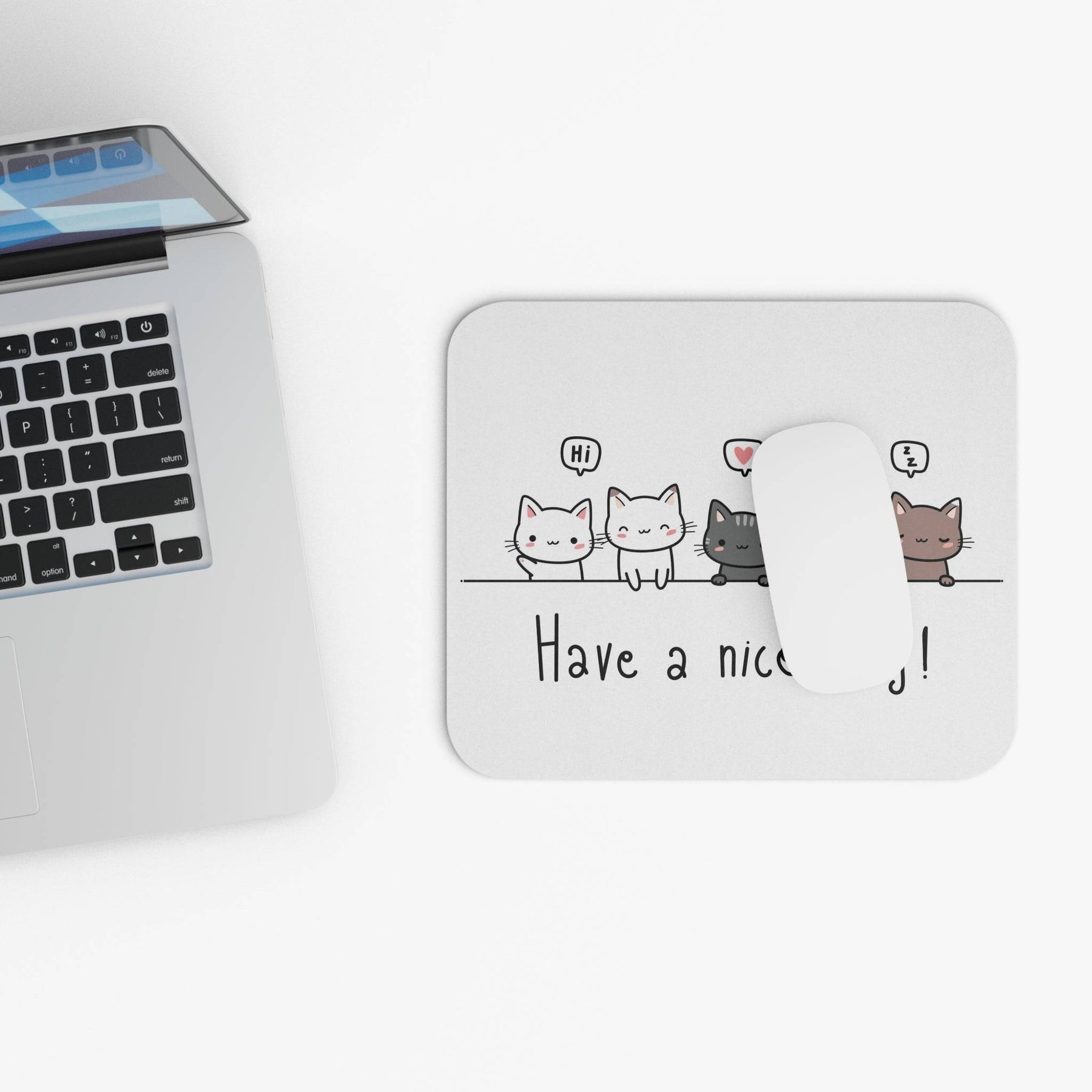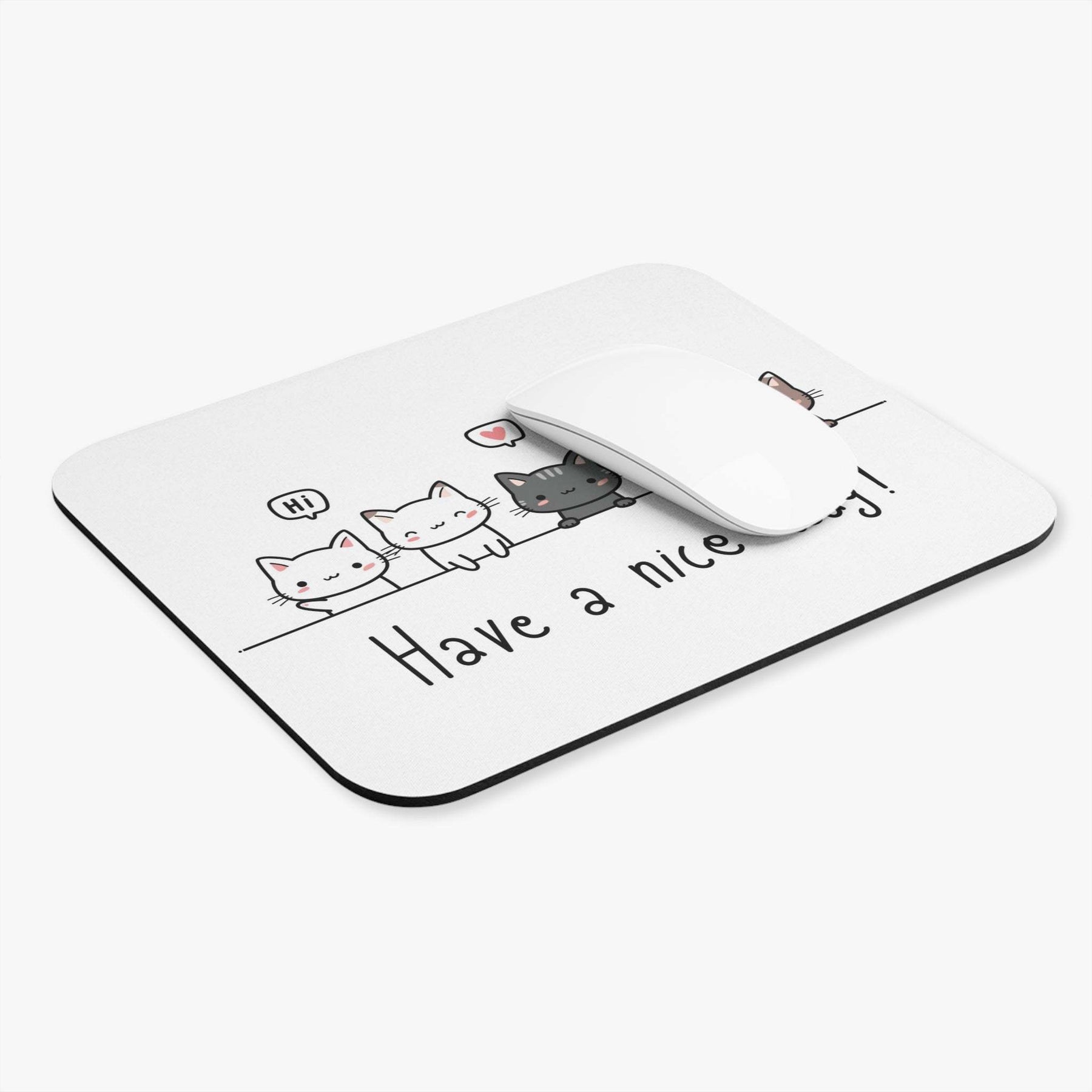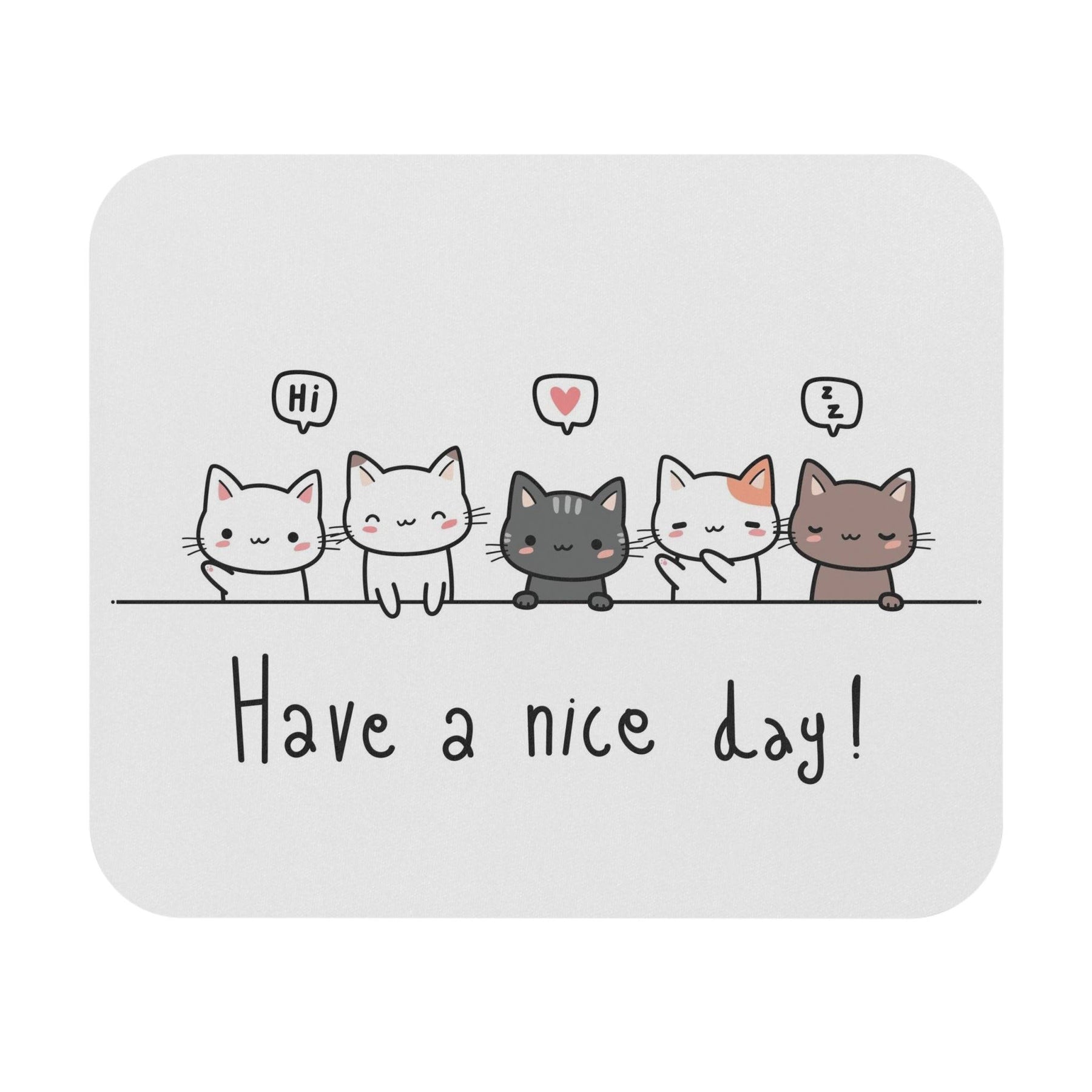 Are you a feline fan, but still need all the perks and practicality of a modern mouse pad? Dreams do come true! Introducing the Have A Nice Day Cat Mouse Pad! This vibrant mouse pad is perfectly white and boldly emblazoned with a row of cartoon cats, each one wishing you a cheery "Have A Nice Day".