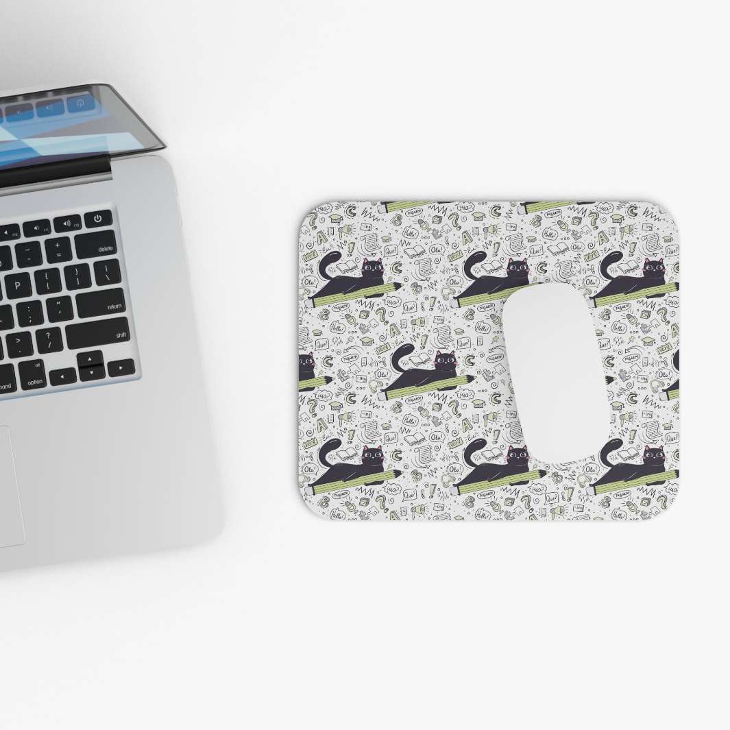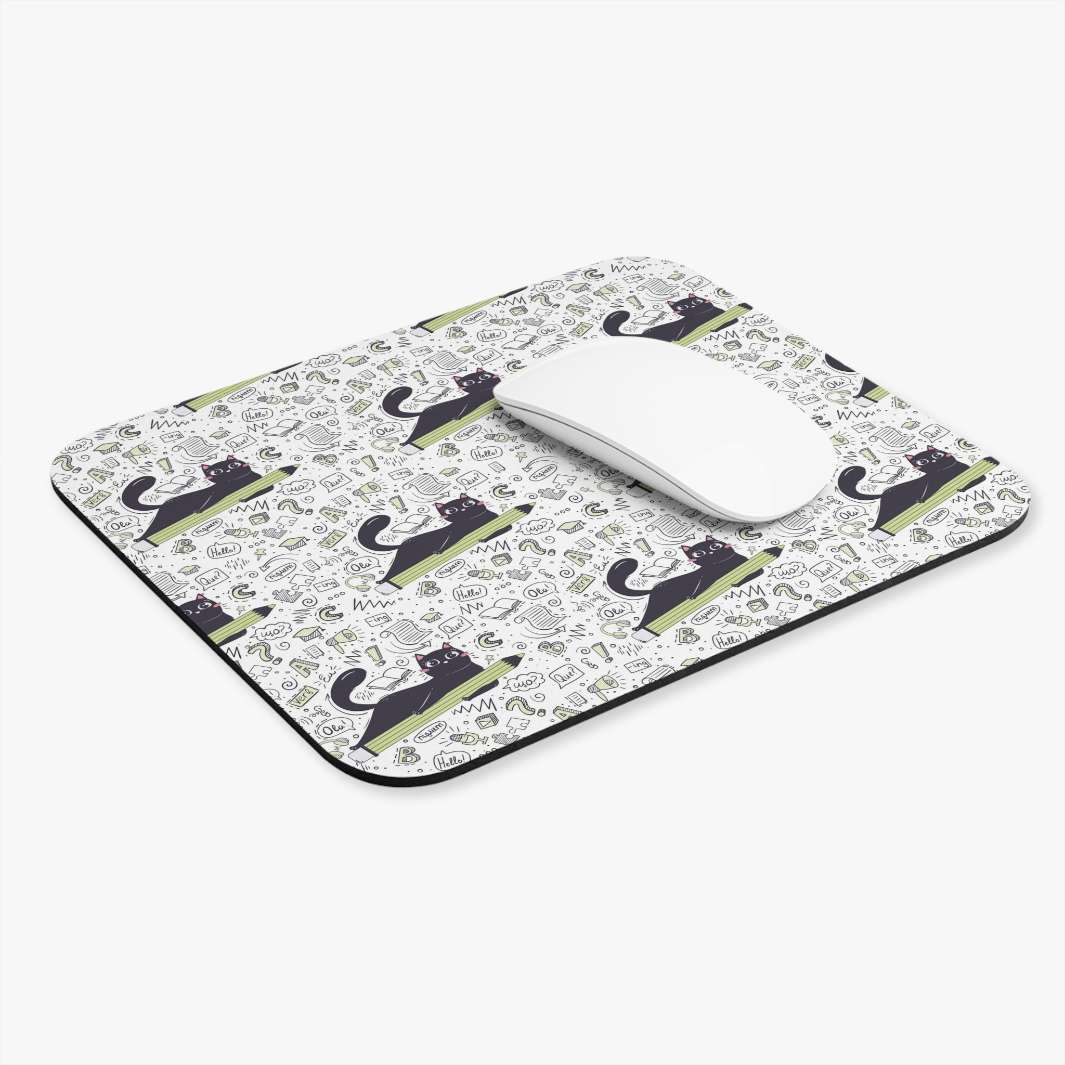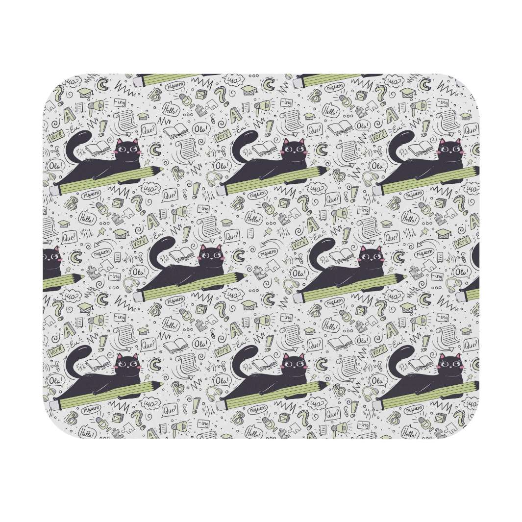 This adorable mouse pad stars a cute cartoon cat surrounded by books, letters, and school supplies. The white background provides the perfect backdrop for the black outline of the cat and its bright yellow pencil, leaving an eye-catching impression.