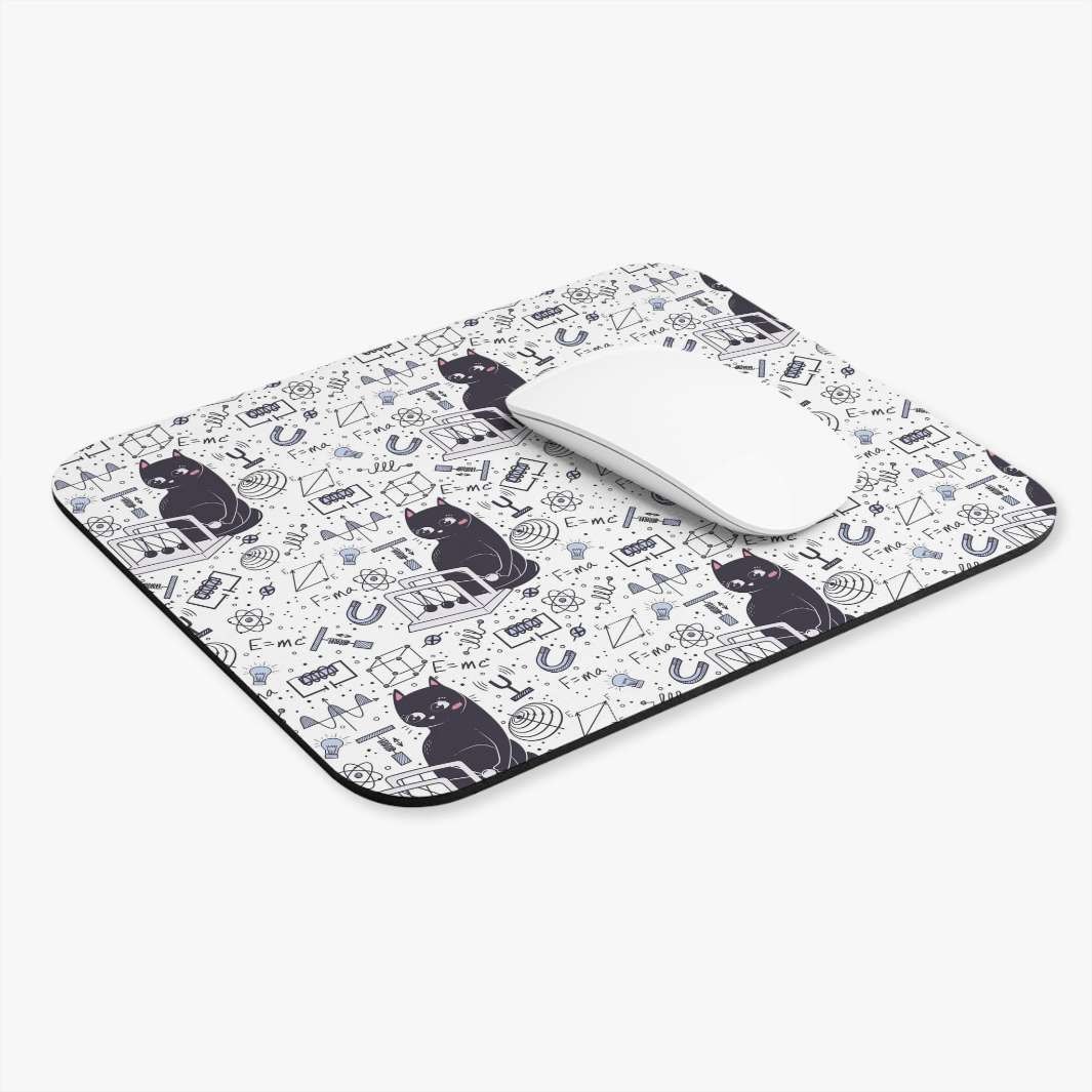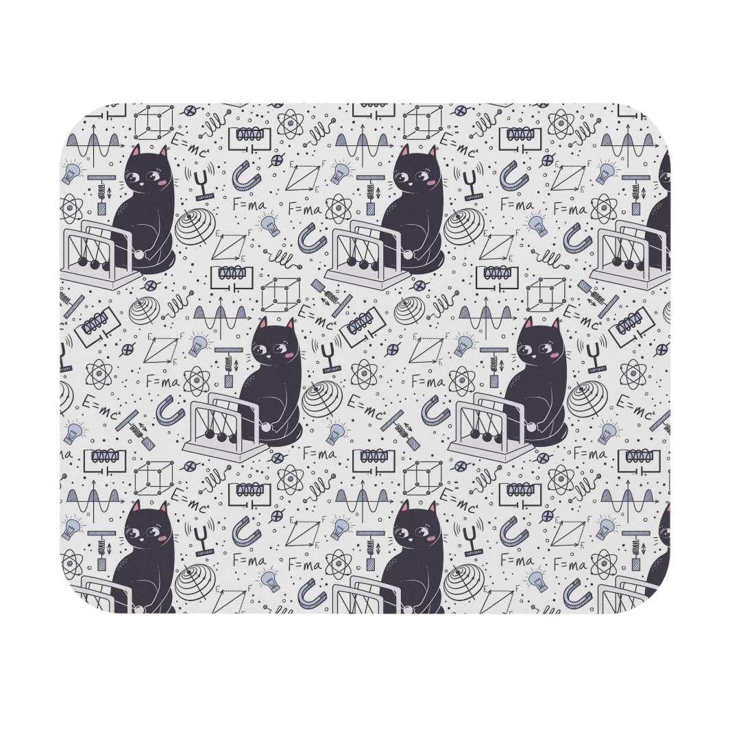 But let's talk about the real star of the show – the mesmerizing design of our Physics Cat Mouse Pad. Against a pristine white background, an enigmatic black cartoon cat prances, proudly surrounded by a constellation of physics equipment and symbols. Prepare to be awe-struck as graphs, formulas, and atoms dance around your furry companion, creating an atmosphere of scientific intrigue right at your fingertips.
