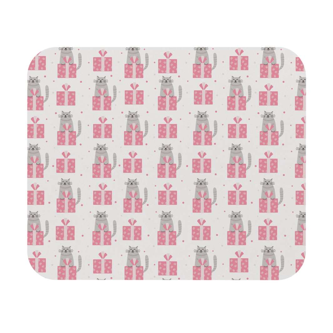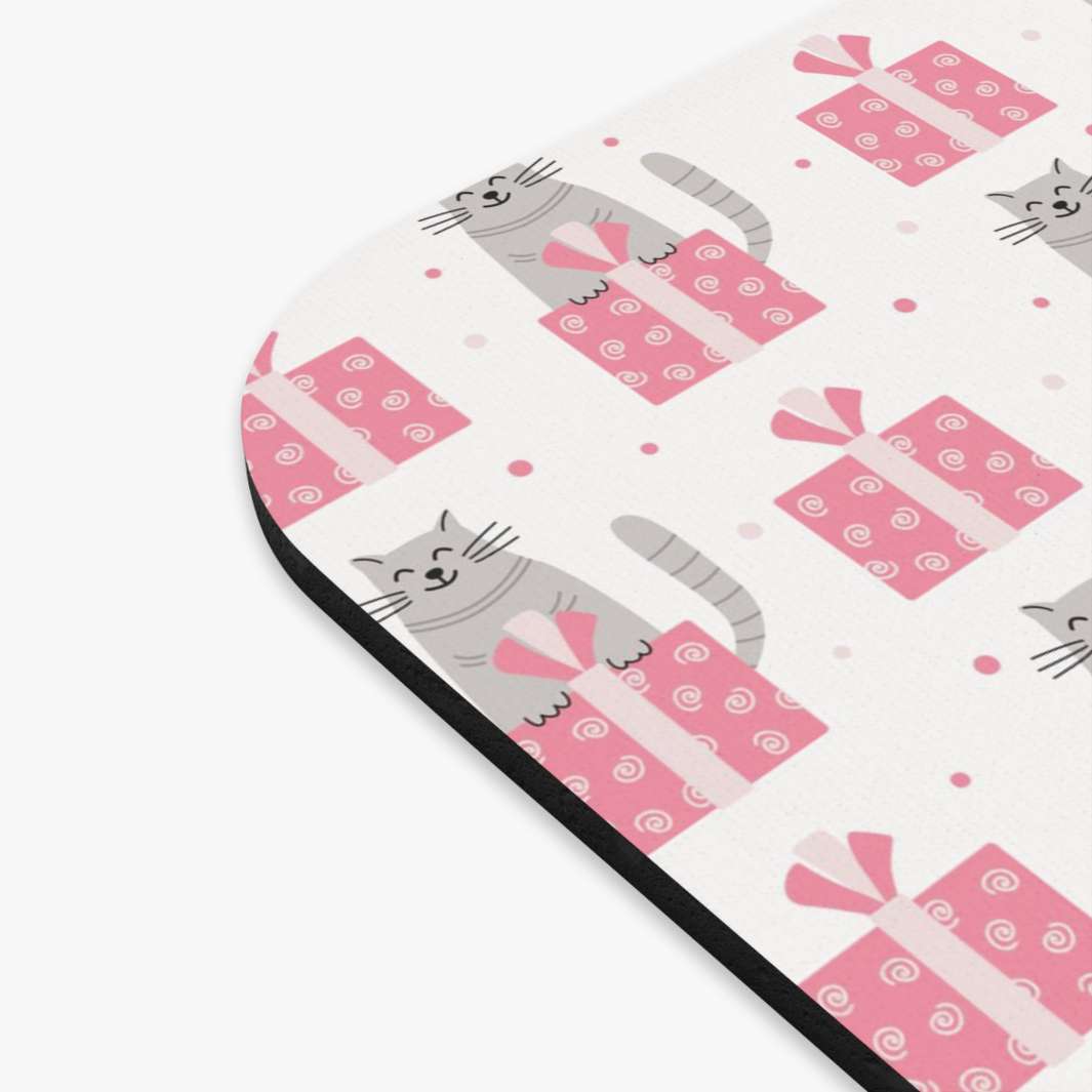 Featuring a delightful white background, this mouse pad is adorned with a charming gray cartoon cat that will instantly melt your heart. And let's not forget about the vibrant pink wrapped gift with a bow, adding an extra touch of cuteness to this already adorable design.