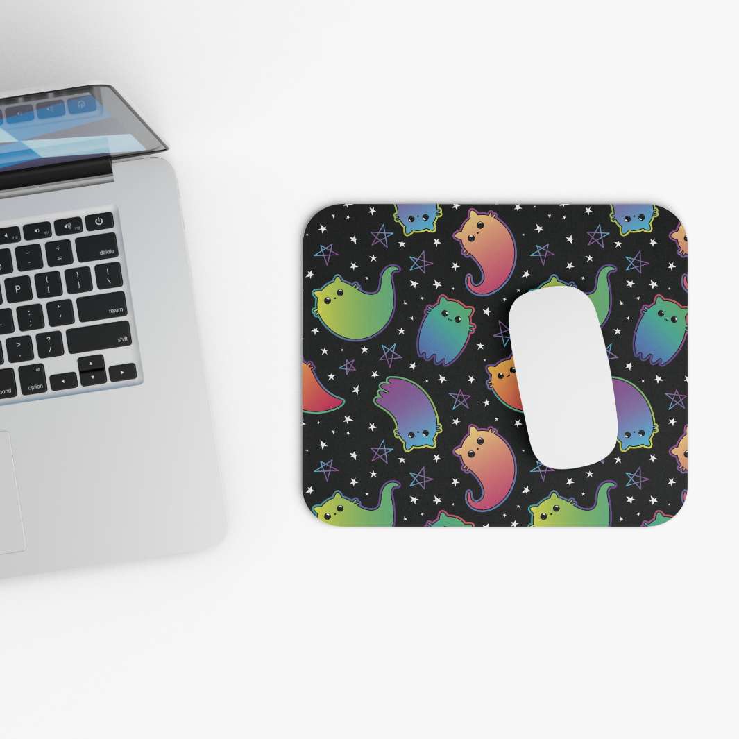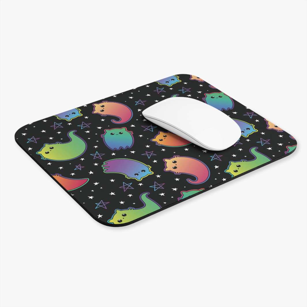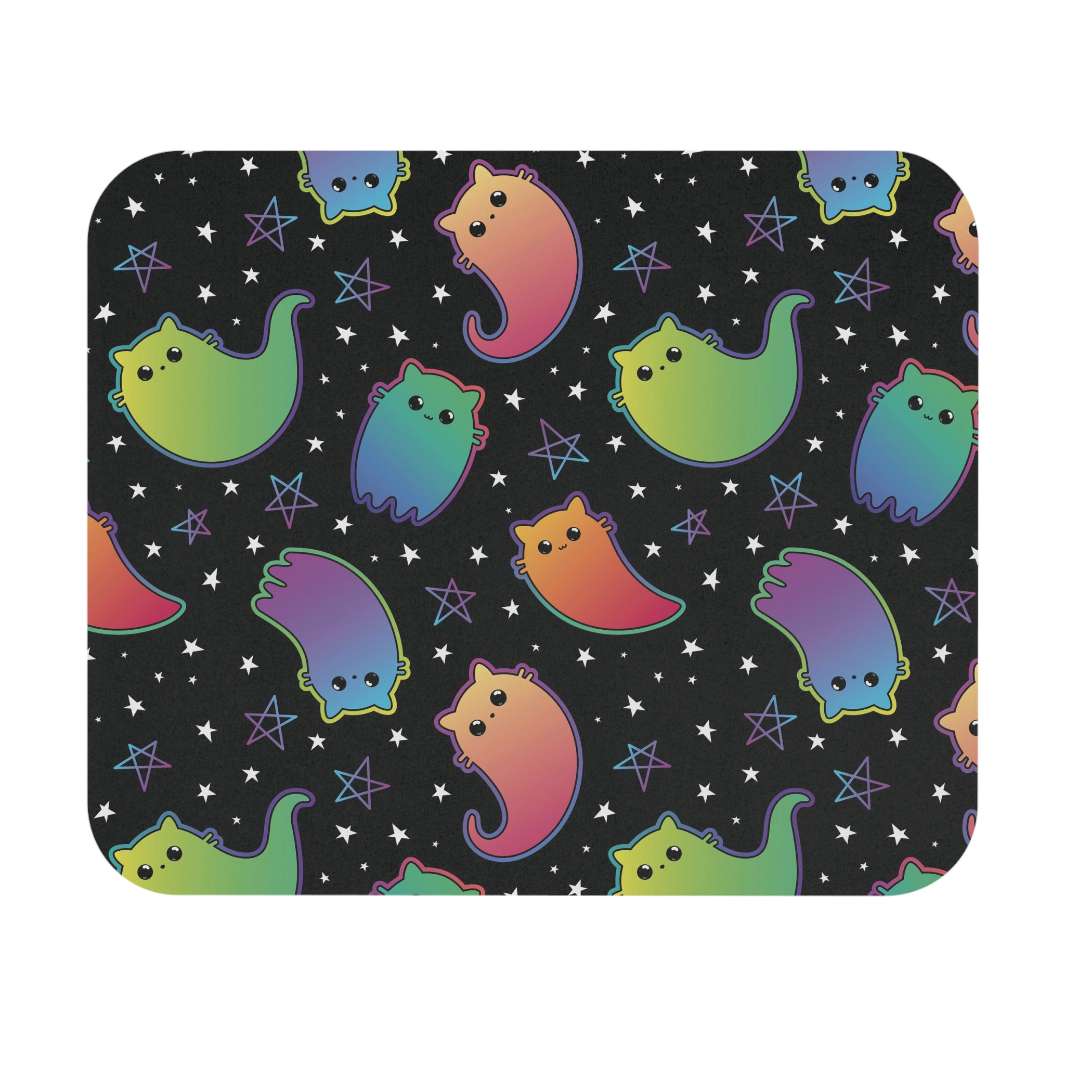 If you are a fan of cats or are looking to find the perfect gift for a cat lover, then this Rainbow Ghost Cat Mouse Pad is purrfectly perfect!