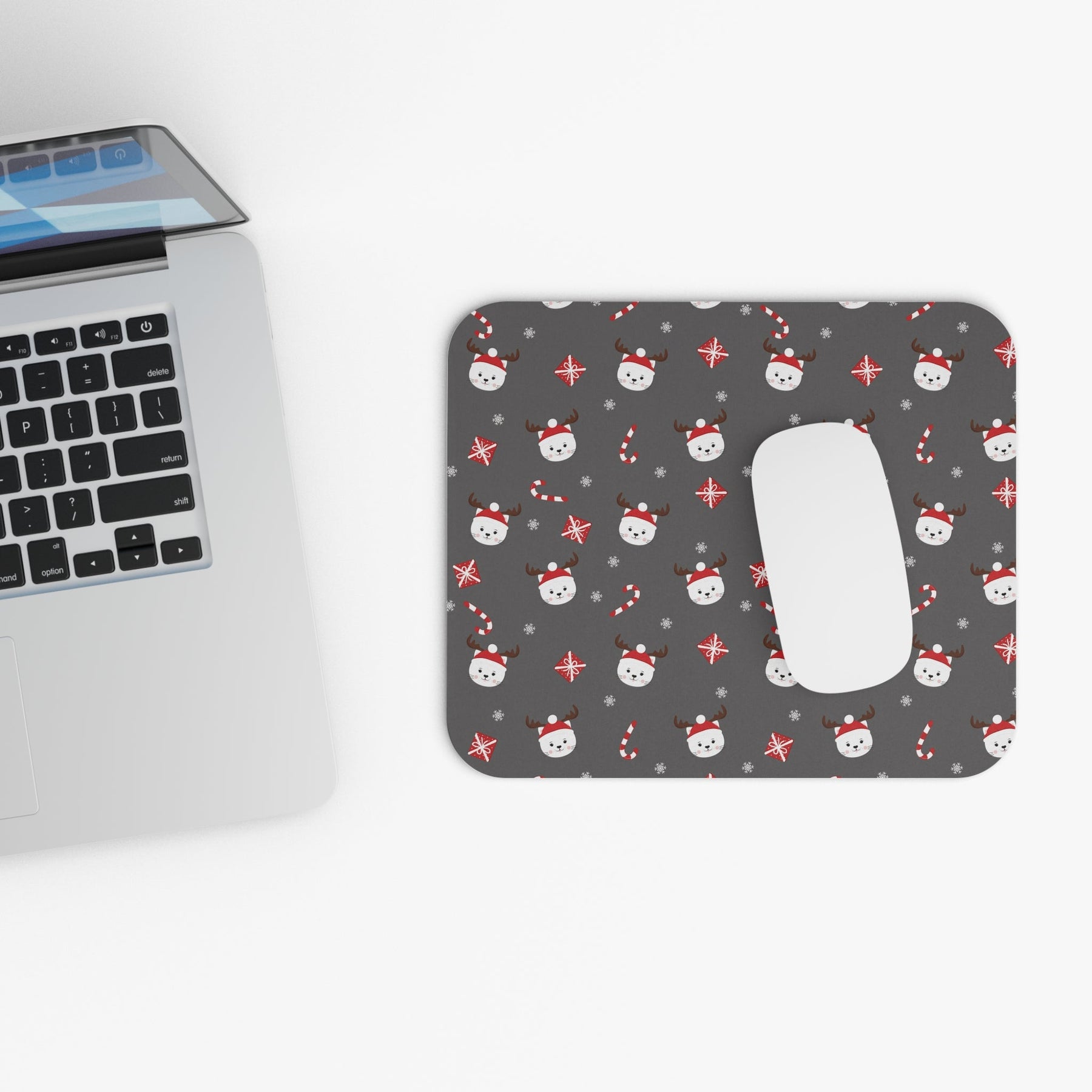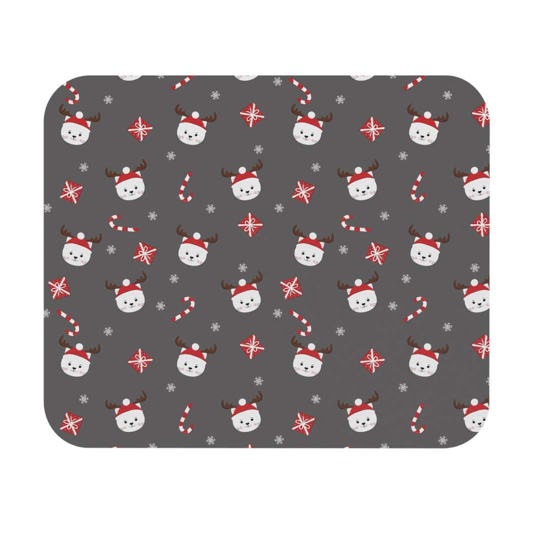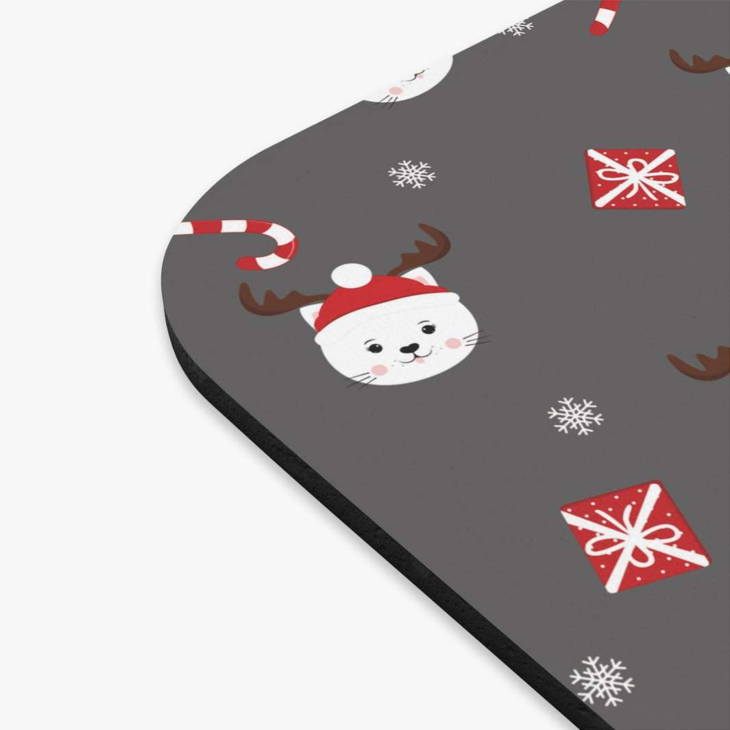 Introducing the whimsical and enchanting Reindeer Cat Mouse Pad! A must-have accessory for all cat lovers and those who appreciate the beauty of the holiday season. Picture this - a gray background adorned with adorable white cartoon cat heads, each donning the most adorable red stocking hats and reindeer antlers. It's the perfect fusion of feline elegance and festive cheer.