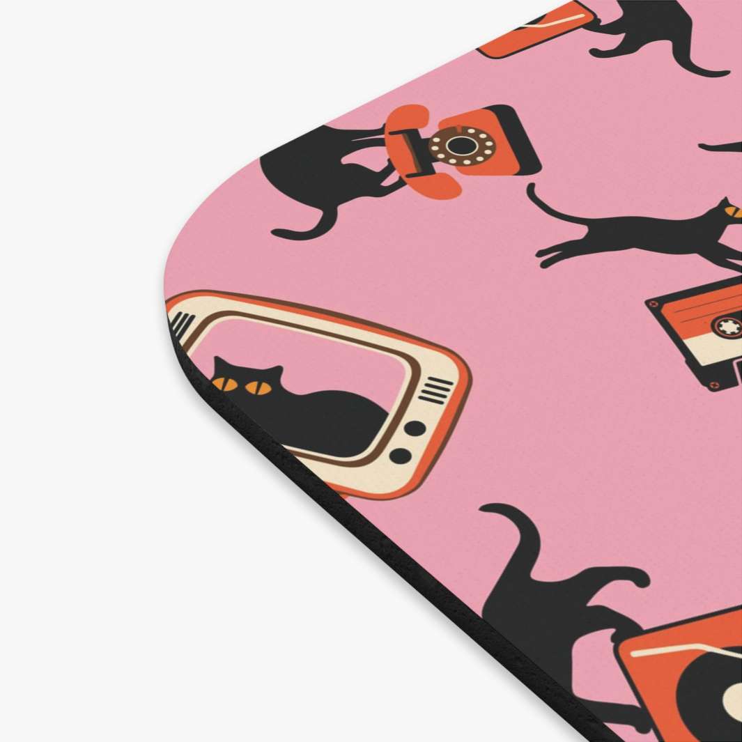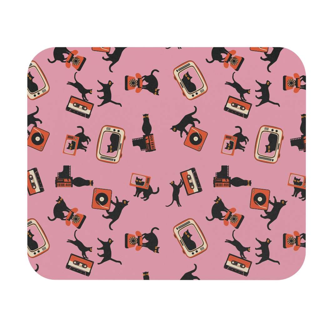 Perfectly crafted to inspire cat owners and lovers alike, this mouse pad is the perfect way to showcase your love for cats while bringing it back to a time when technology was a little bit old-fashioned. The nostalgic design features pink background and black cats that are using all kinds of different vintage tech, from TV's and cassette tapes, to rotary telephones and 35mm film.