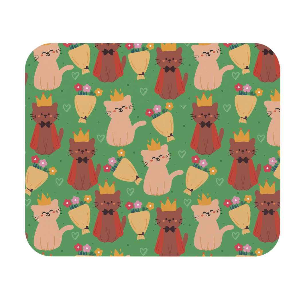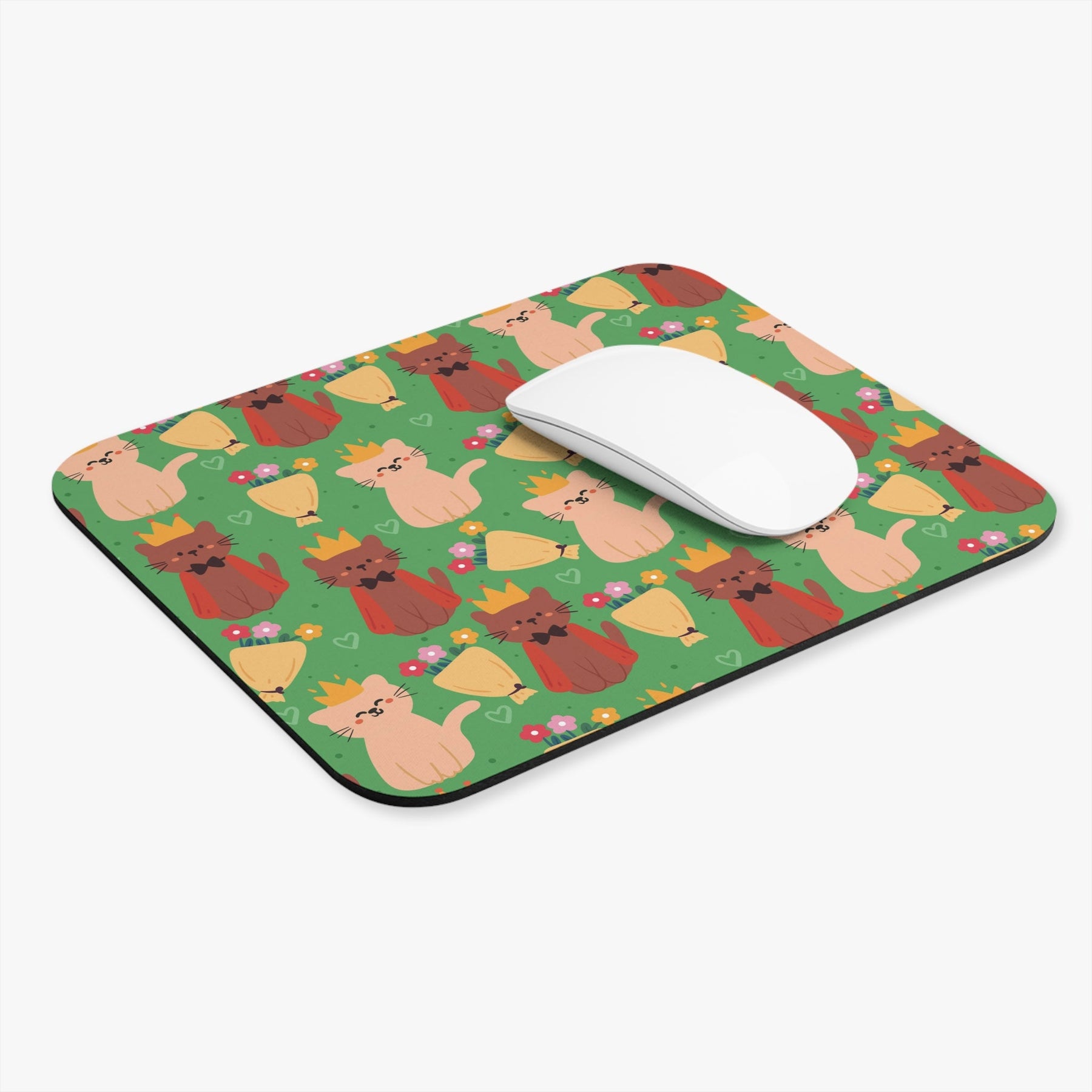 Crafted with attention to detail, this eye-catching mouse pad features a vibrant green background, with two cartoon cats adorned in crowns and regal robes. A stately brown cat stands with a bow-tie and dashing smile, while a beautiful peach cat with an equally impressive crown poses amongst a delightful collection of little hearts and bouquets of flowers wrapped in paper.