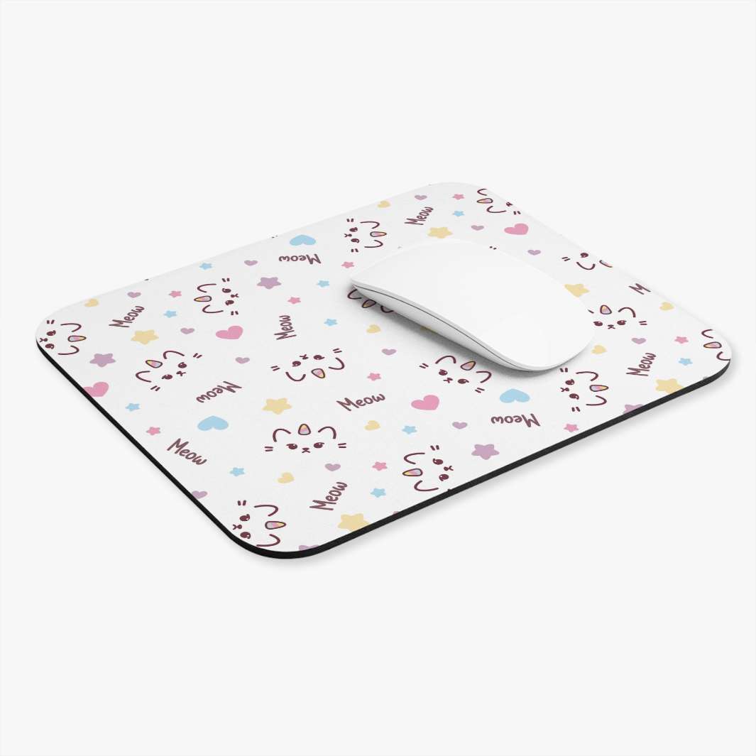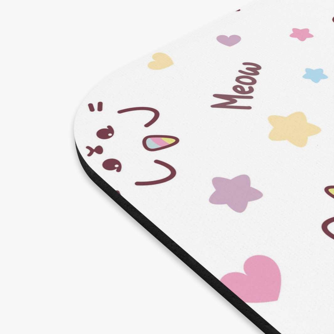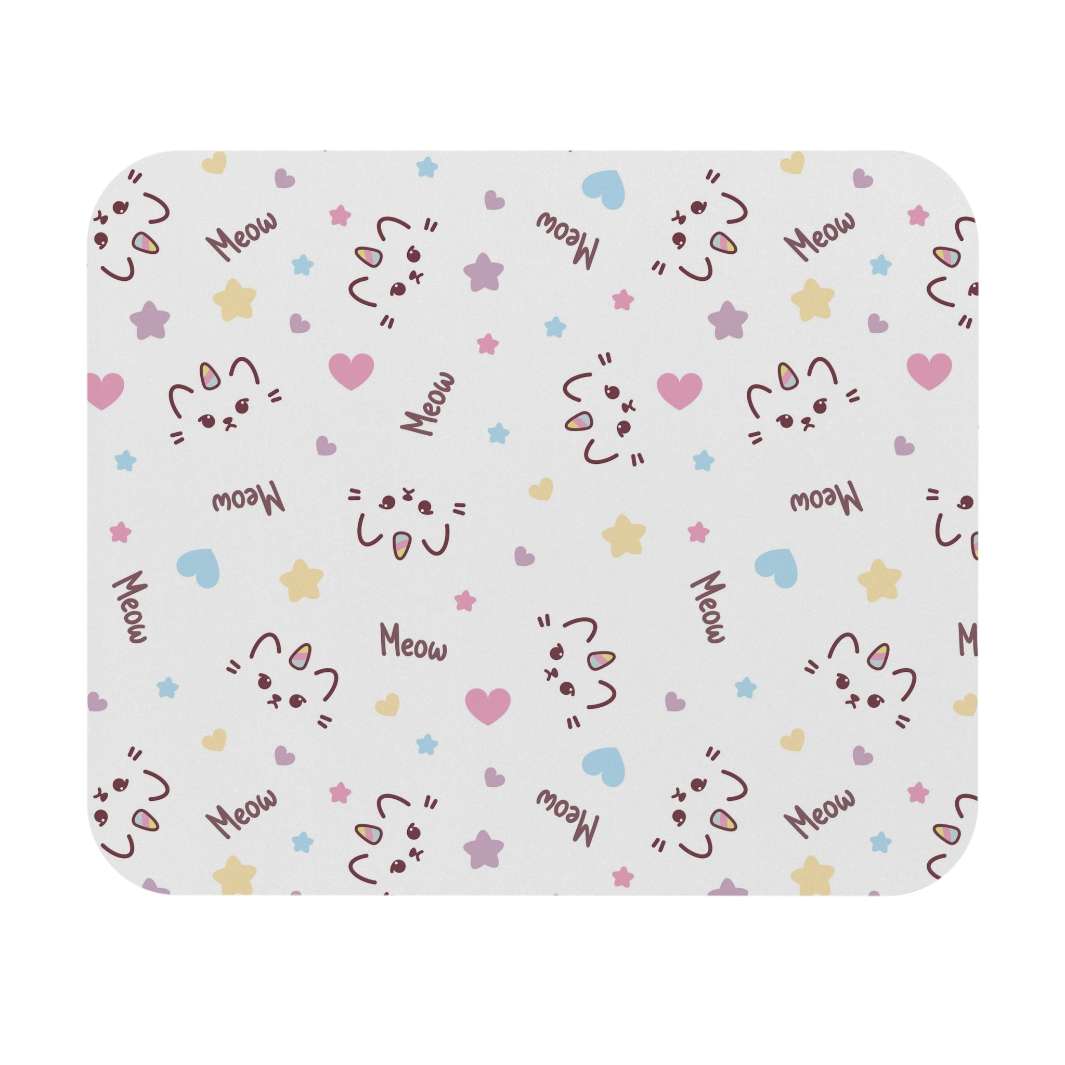 Featuring a whimsical line drawing of a cat with a rainbow striped unicorn horn, tiny stars and hearts in pink, yellow, blue and purple, and the word “meow.” This mouse pad is sure to bring a smile to the face of any cat lover and will also make all of your friends and colleagues envious.