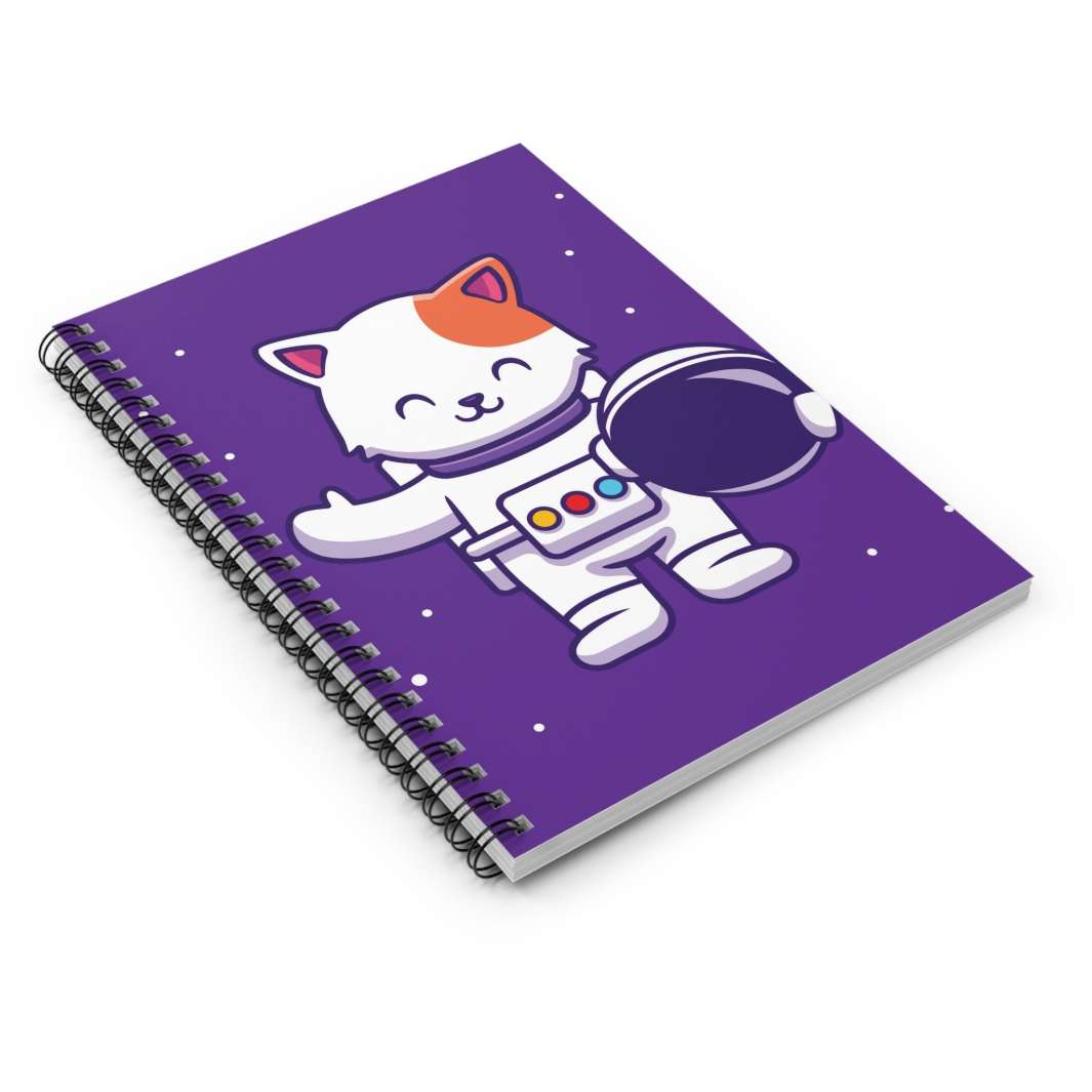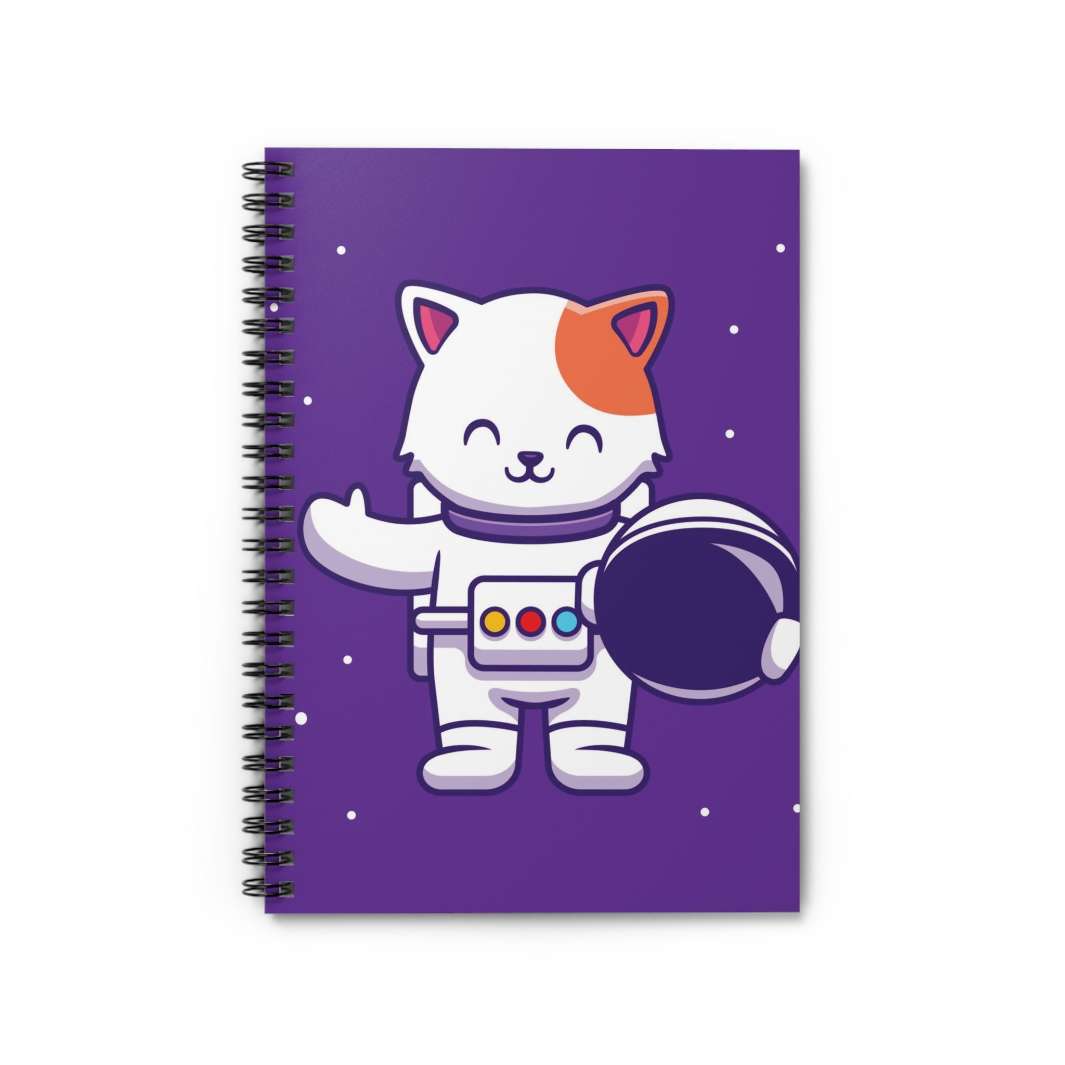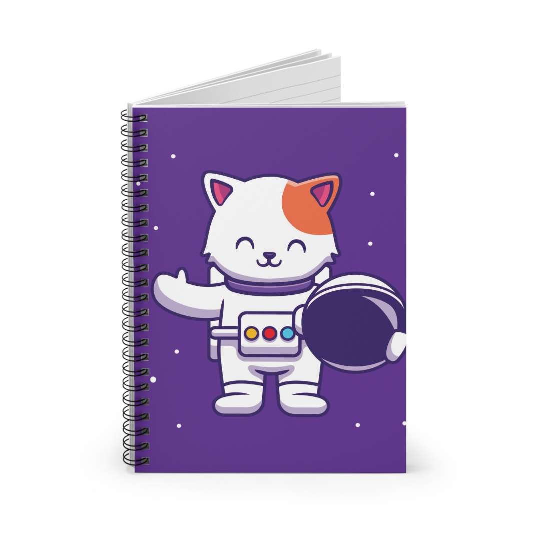 Take your creativity to outer space with this Astronaut Cat Spiral Notebook. This uniquely designed notebook features a charming cartoon cat dressed in an astronaut suit on the cover, holding an astronaut helmet, along with a cheerful purple background.