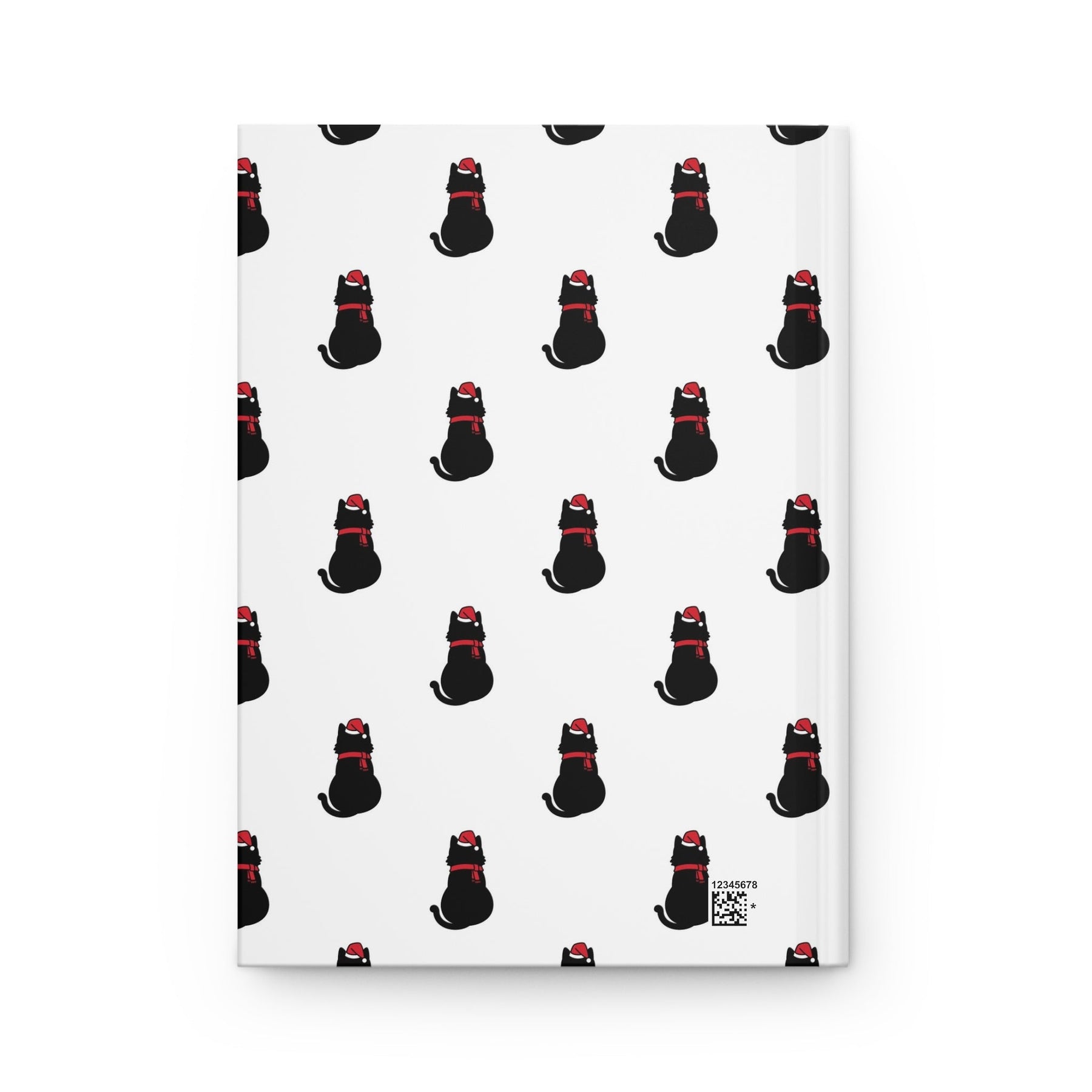 Let's start with the cover. Picture a pristine white background, providing the ideal canvas for our mischievous feline friend. Playfully splashed across the front, you'll find the mesmerizing image of a black cat, adorned with a vibrant red scarf and a jolly Santa hat. This festive feline is bound to bring a smile to your face every time you reach for your journal.