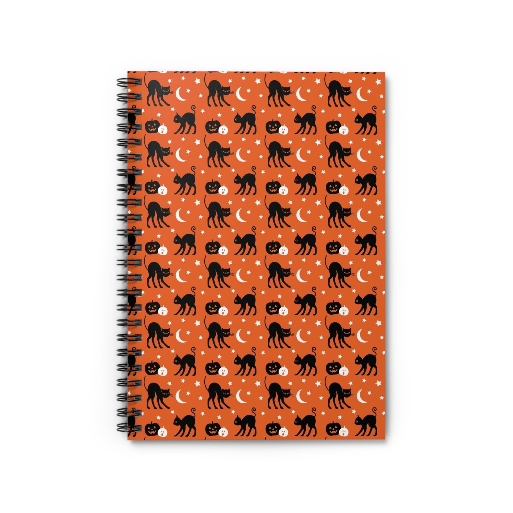 Introducing the Black Cats and Pumpkins Spiral Notebook – the perfect stationary accessory for Halloween lovers and those with an eye for spooky style! Crafted with a bright orange background, the notebook features beautiful silhouettes of black cats and gleaming black jack o lanterns decorating the cover. Adding a subtle yet striking finish to the notebook, graceful white half moons elegantly adorn the icons, making it the perfect tool for adding sophistication to your stationery collection.