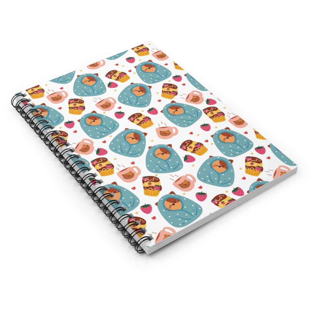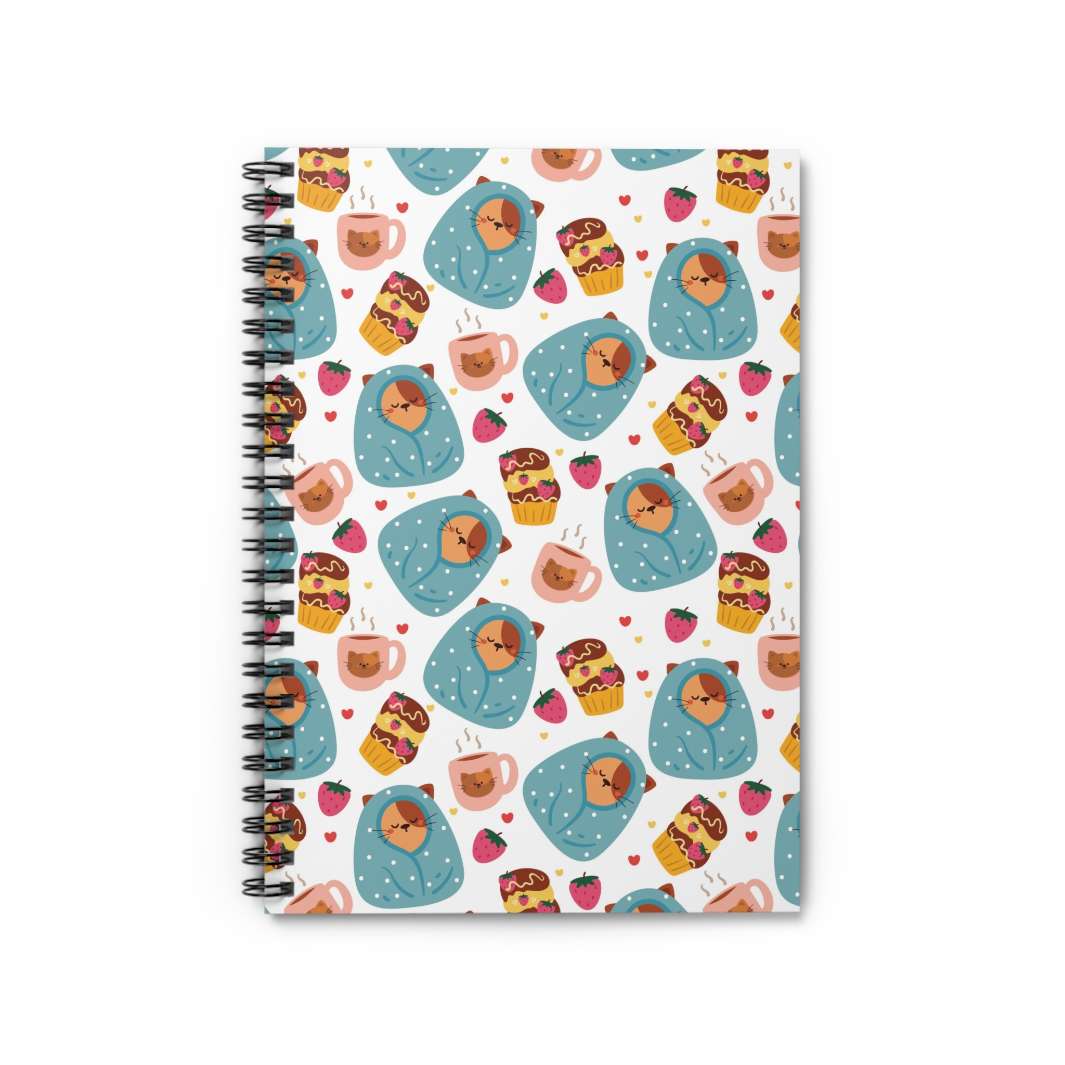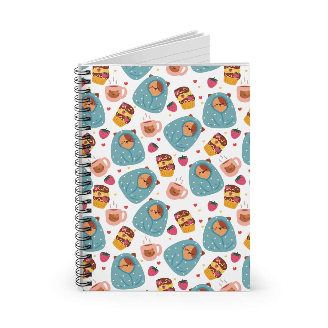 But what truly sets this notebook apart is its ability to capture the essence of your feline love. Whether you're a proud cat parent or an admirer of all things cat-related, the Blanket Cat Spiral Notebook is here to add a touch of whimsy and charm to your everyday. Imagine flipping through its pages, being greeted by that adorable brown cat wrapped in its blanket, alongside the mouthwatering treats that accompany it. Instantly, your heart will be transported to a world filled with joy, warmth, and the unbreakable bond between humans and their feline companions.